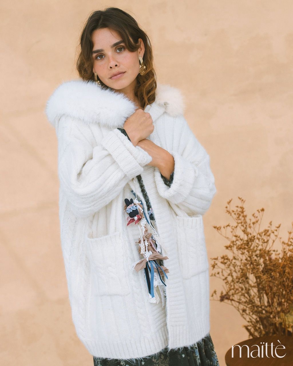Casaco de malha branco trabalhado com efeito de torcidos.