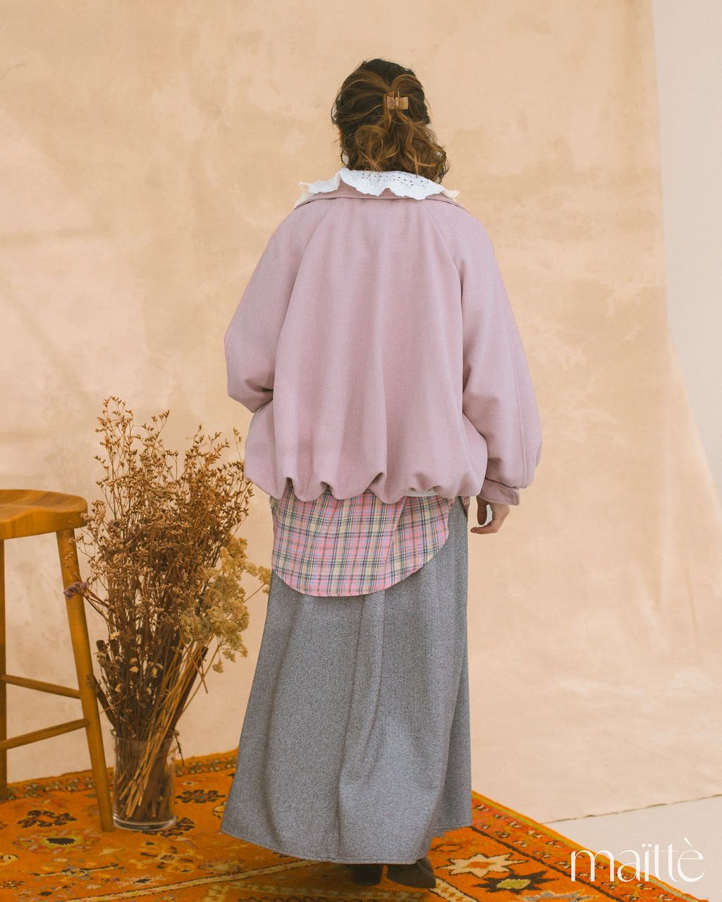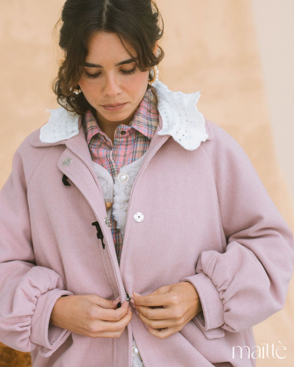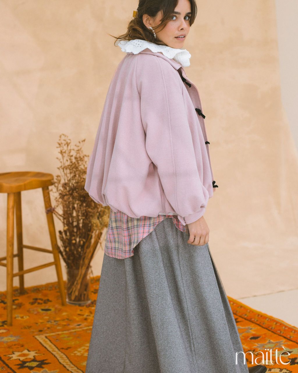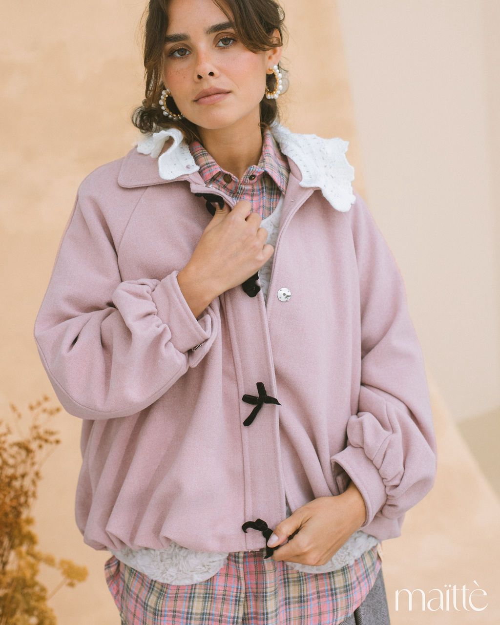 Casaco estilo fazenda num tom delicado de rosa com laços de veludo (aplicação) em preto.