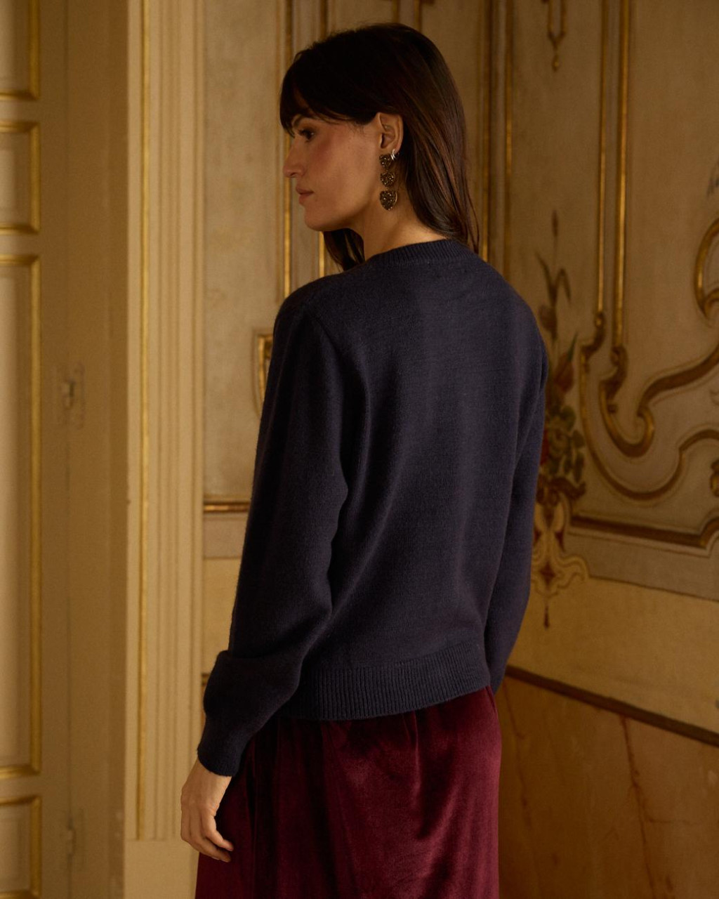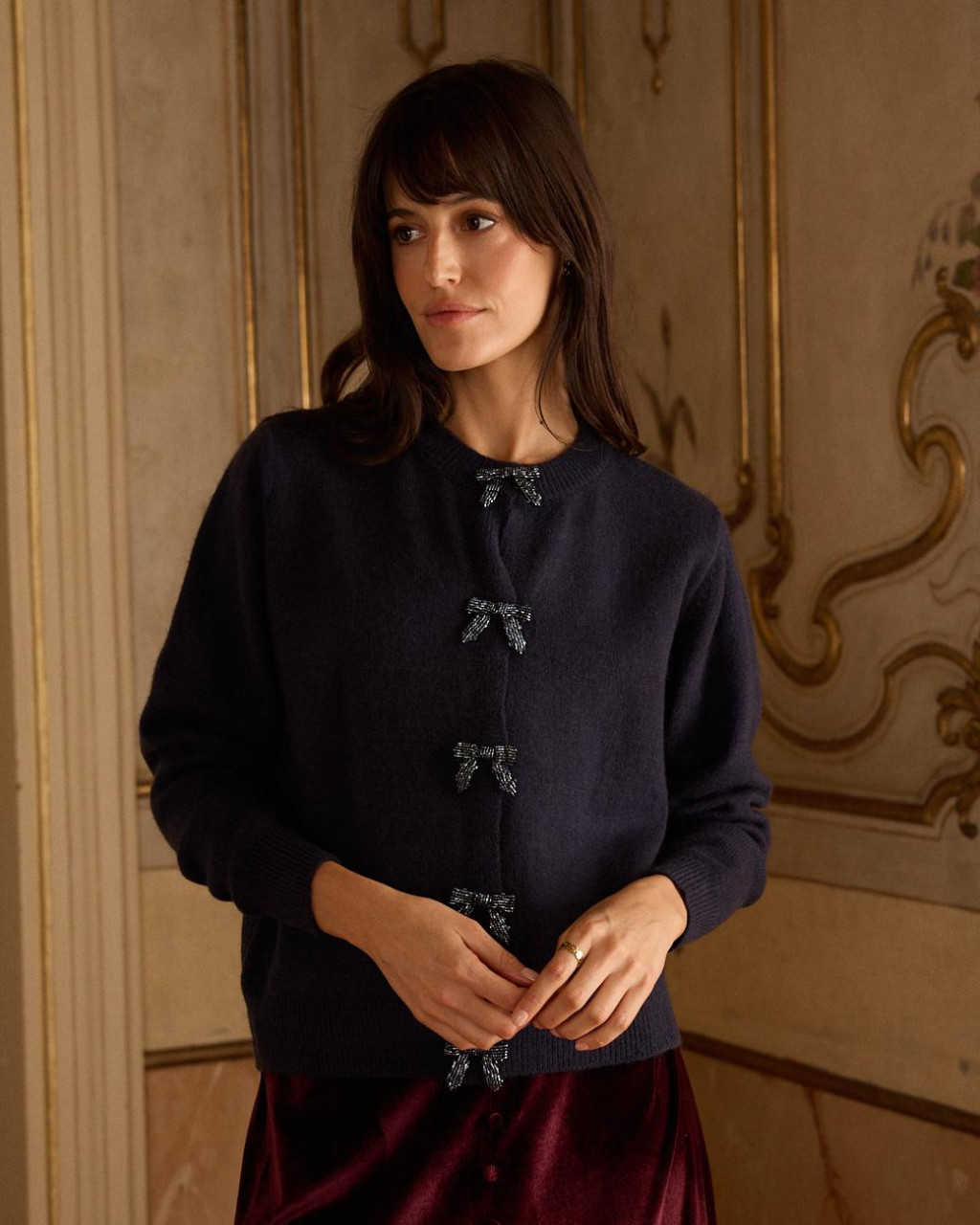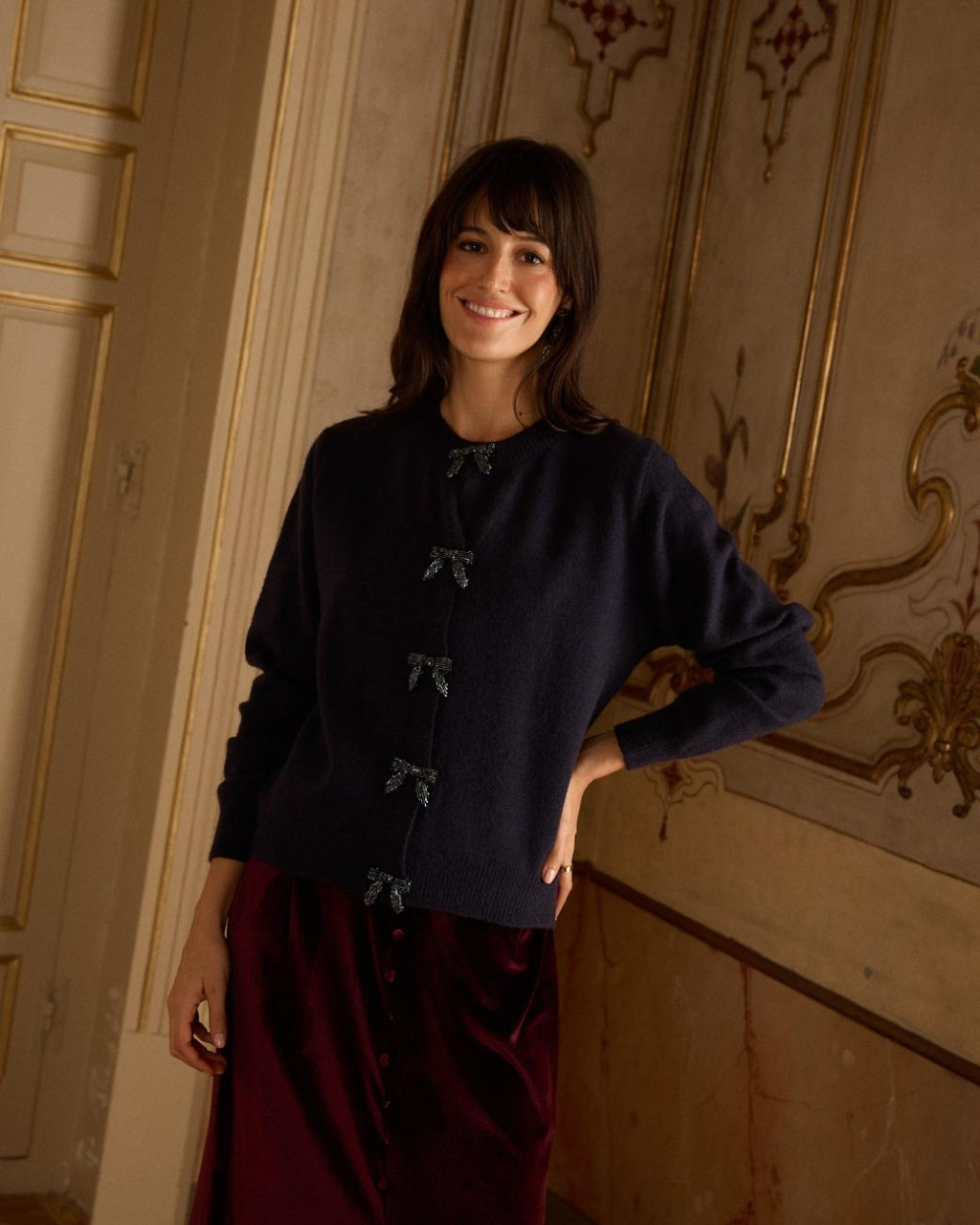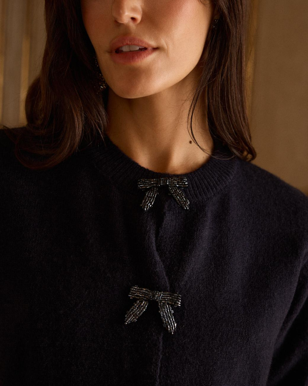 Decote redondo. Fecho de botões interiores com aplicação de laços.