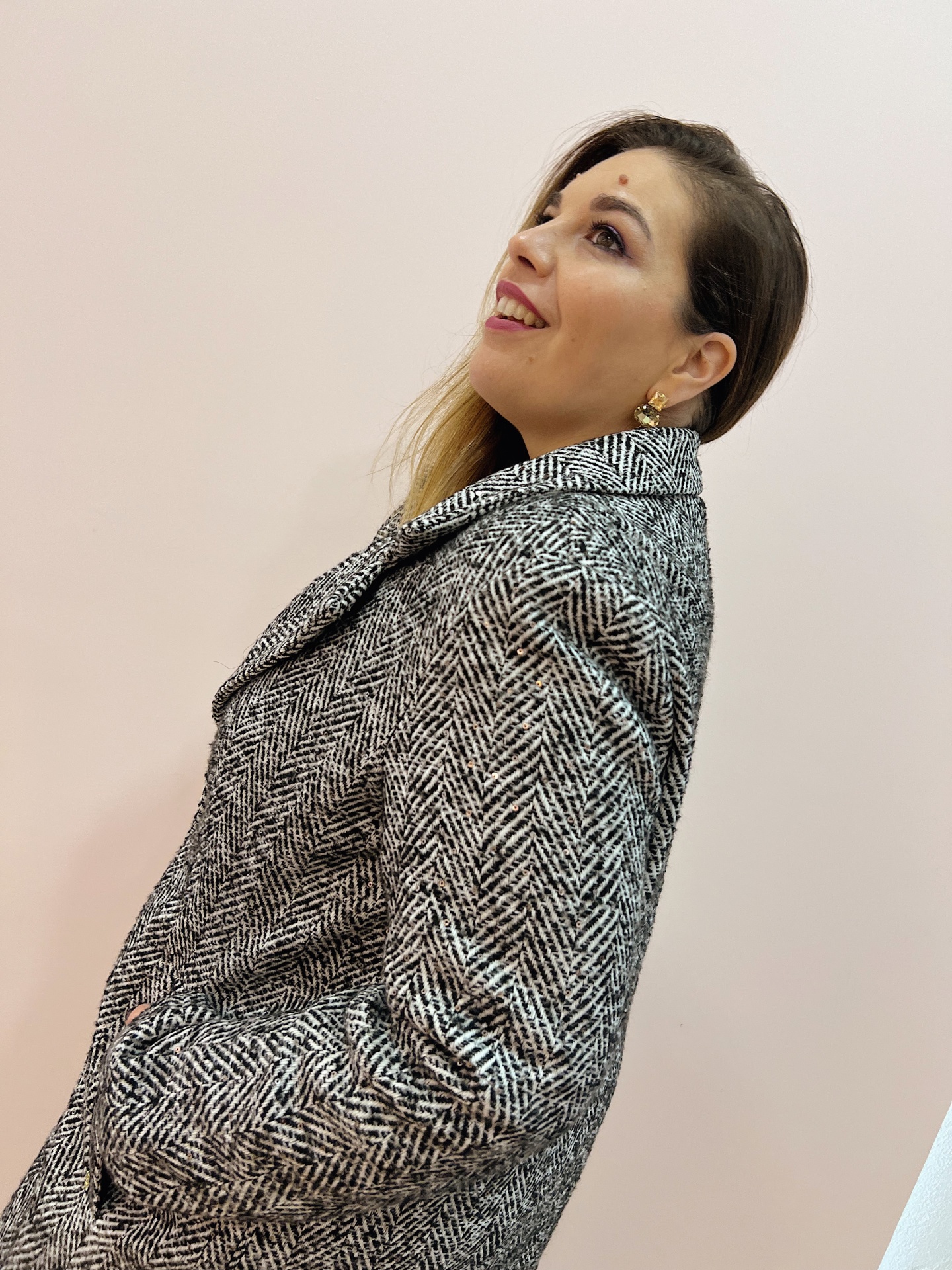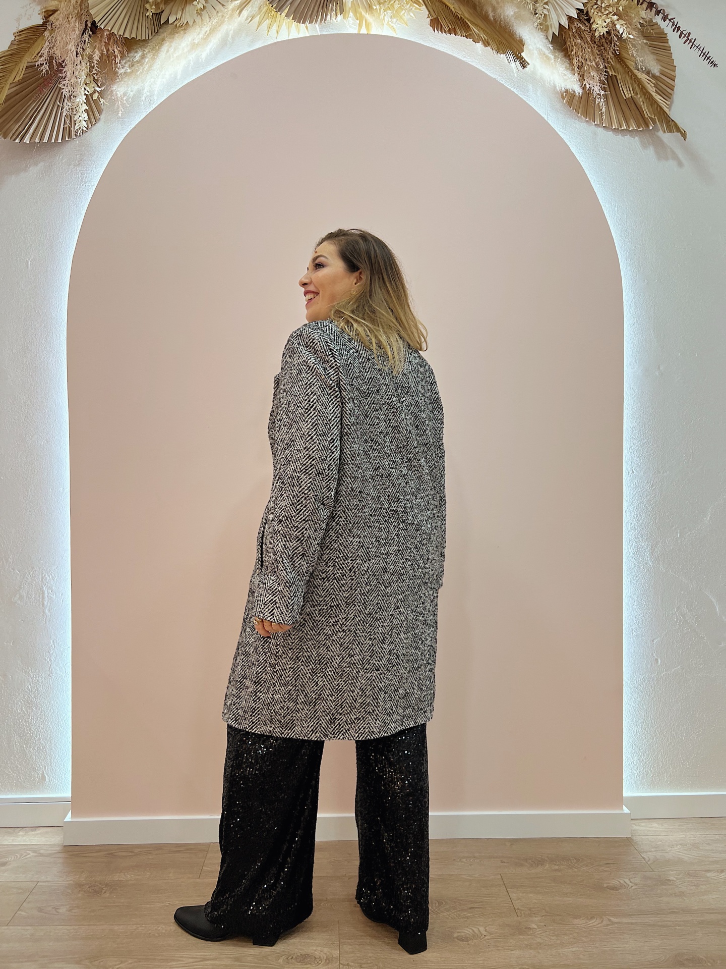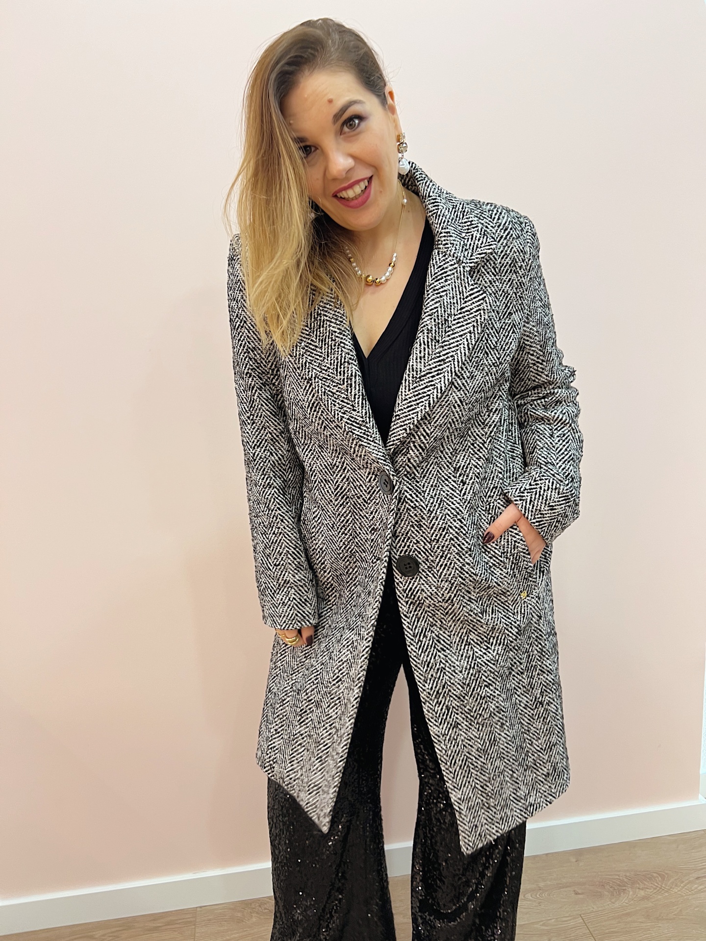 Casaco de fazenda comprido (estilo Sobretudo) em padrão espinha (preto/branco) com lantejoulas.