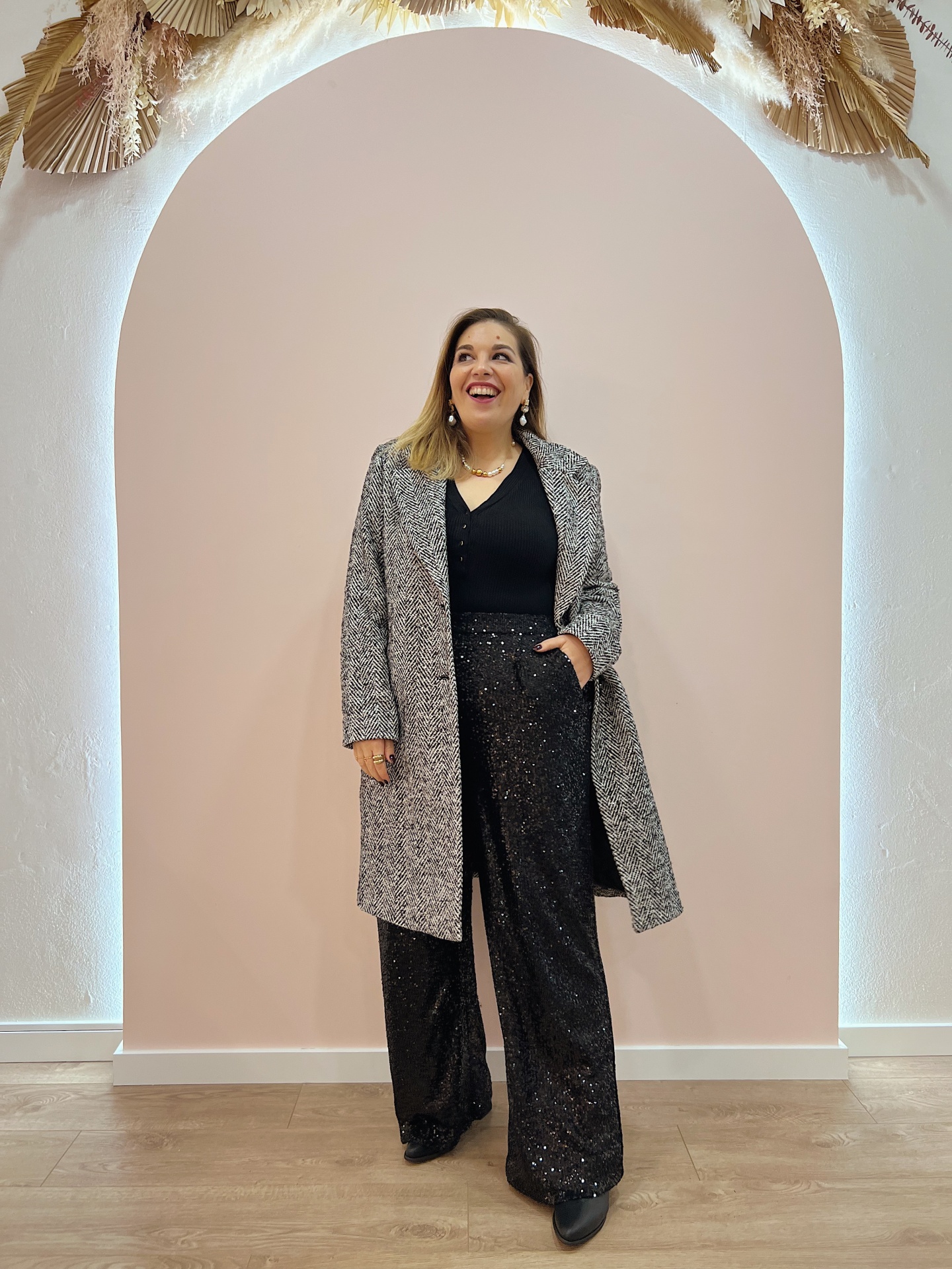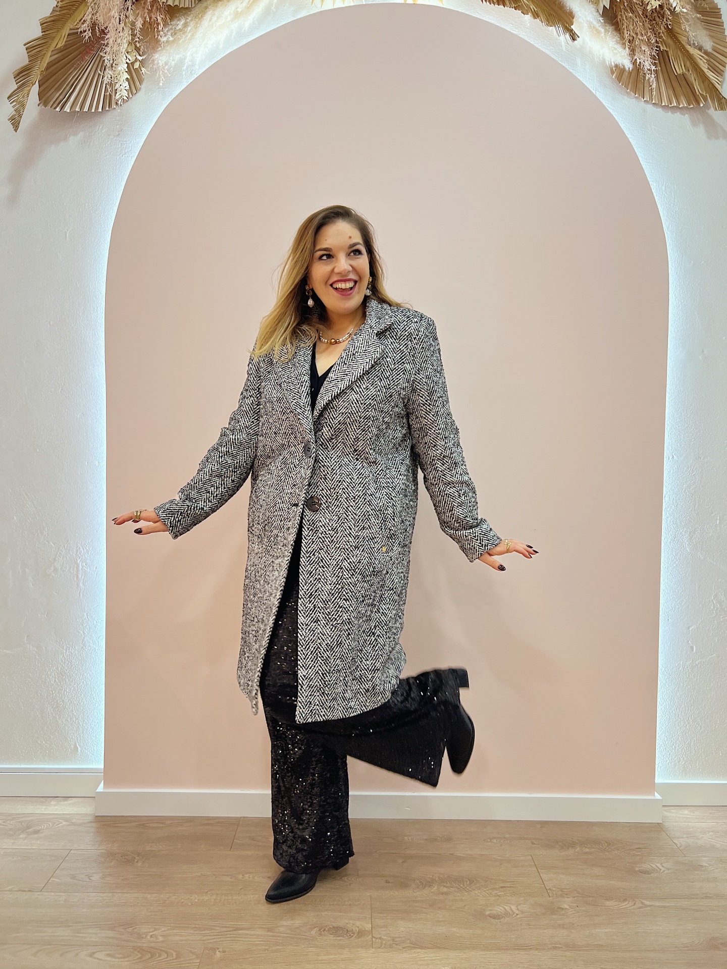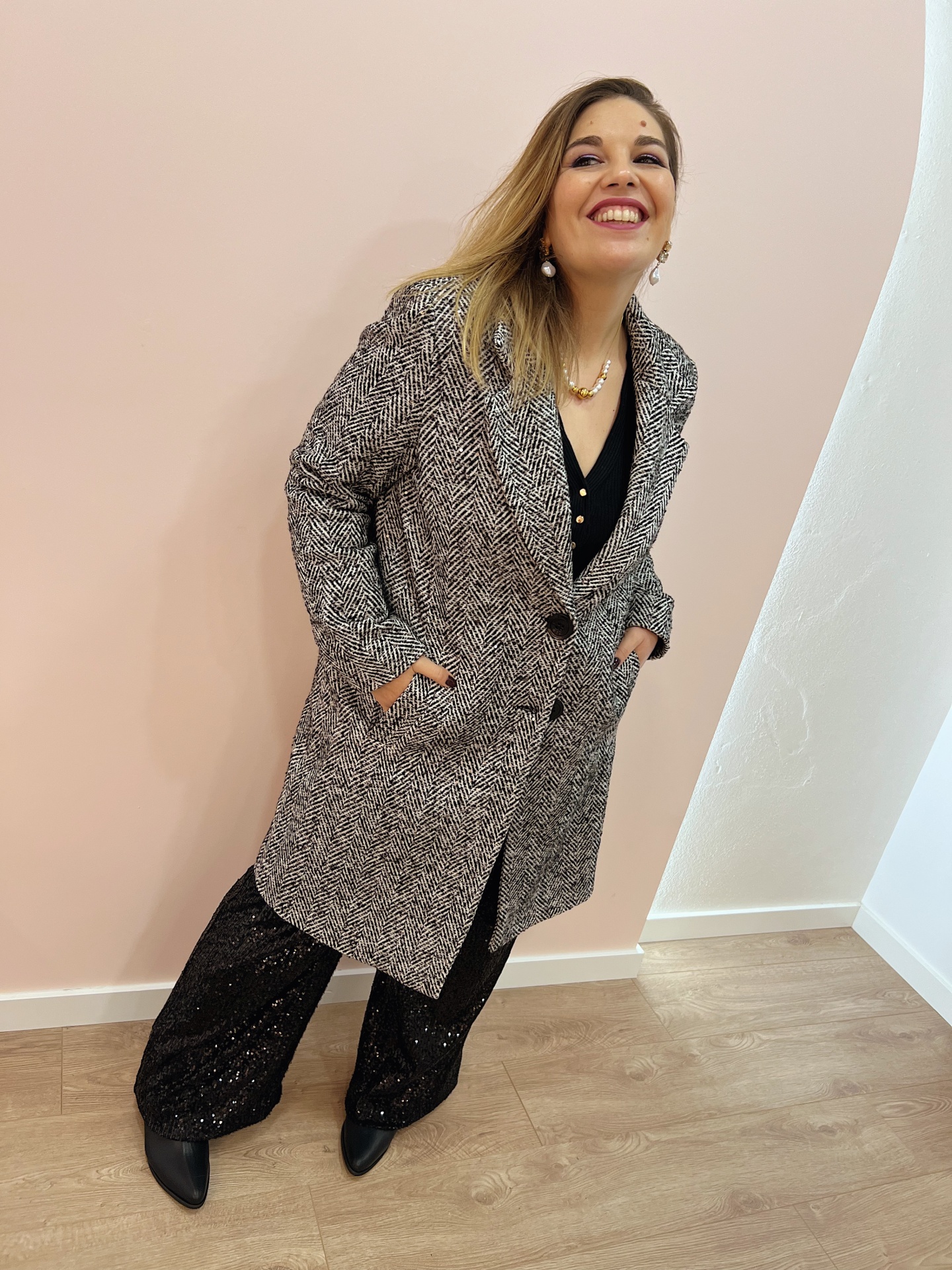 Casaco de fazenda comprido (estilo Sobretudo) em padrão espinha (preto/branco) com lantejoulas.