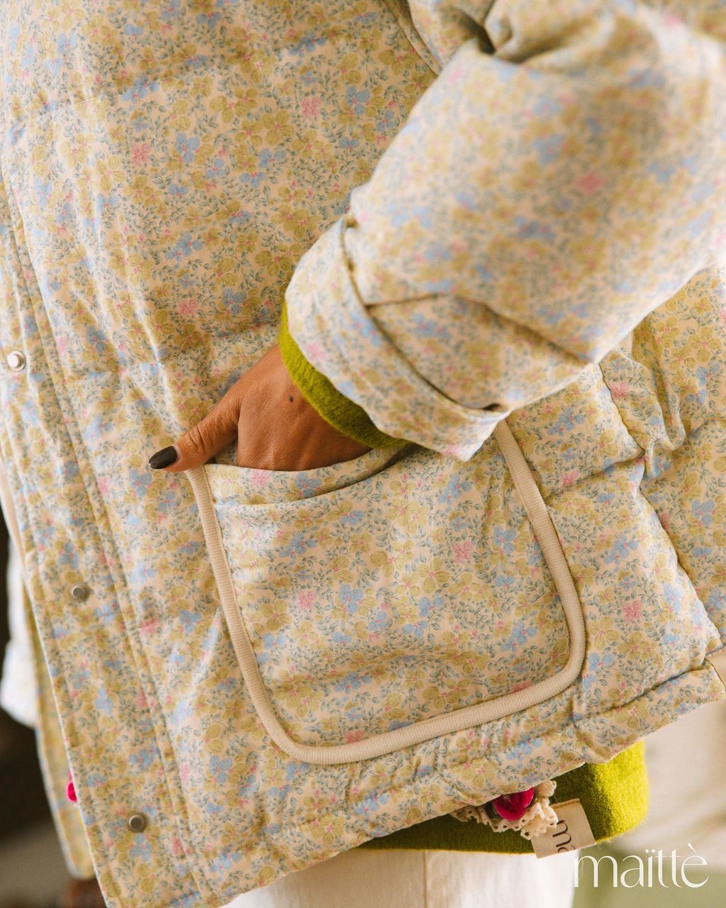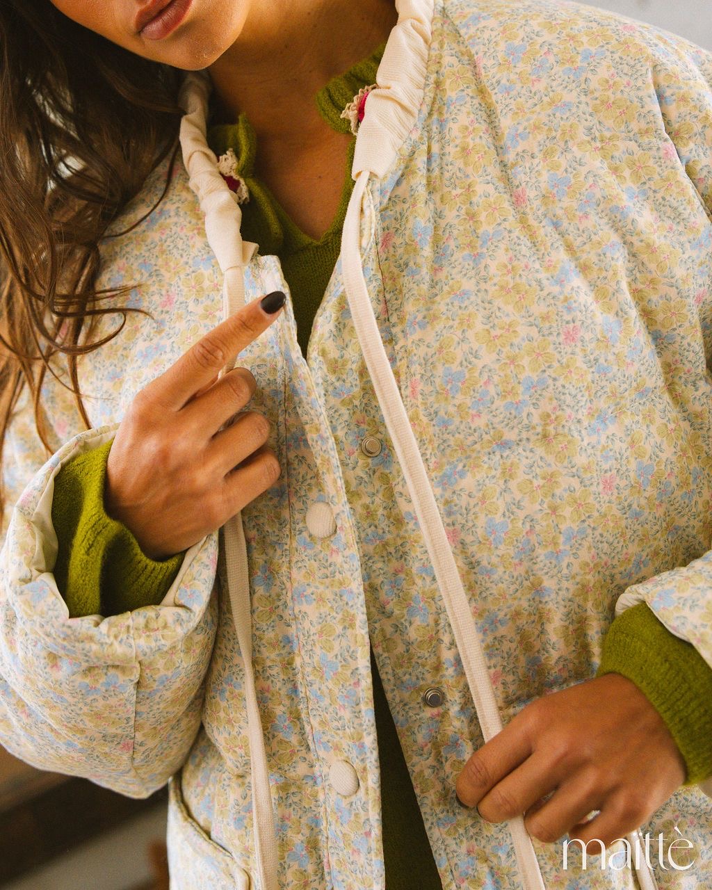 Casaco curto oversize estilo Kispo com padrão floral delicado e romântico.