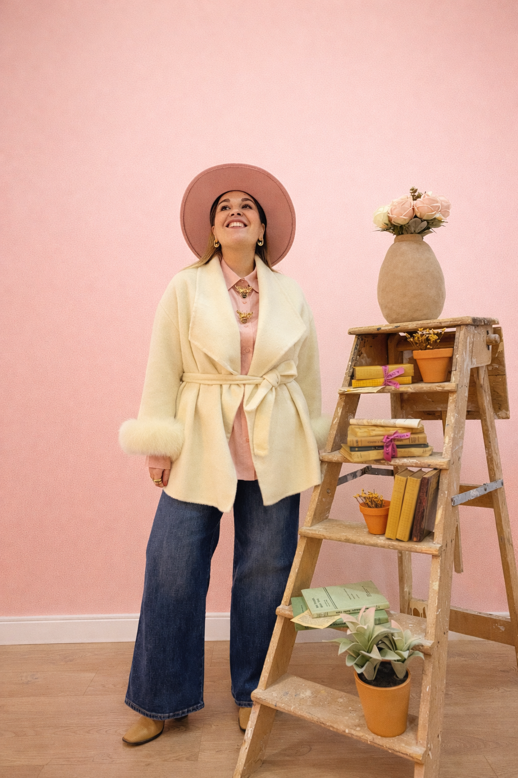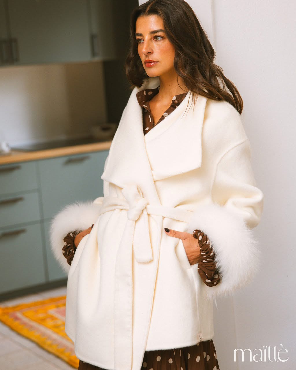 Casaco pérola quentinho e intemporal com corte inclusivo e elegante.