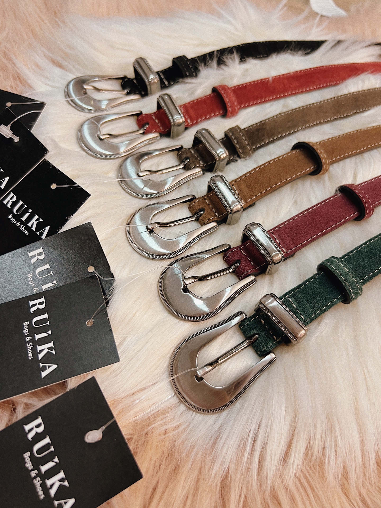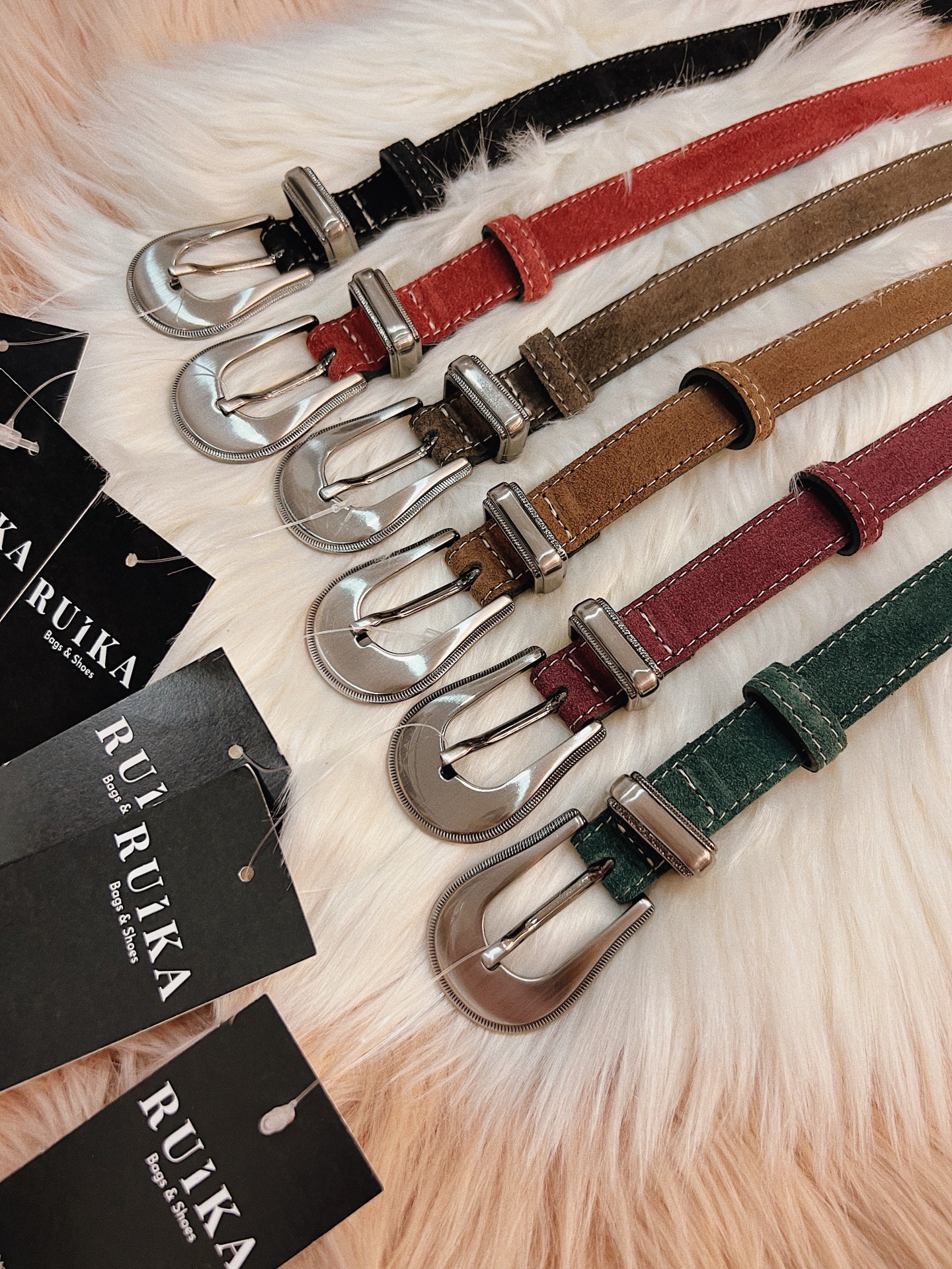 Cinto tradicional em pele (camurça) com fivela prateada de inspiração country (cowboy).