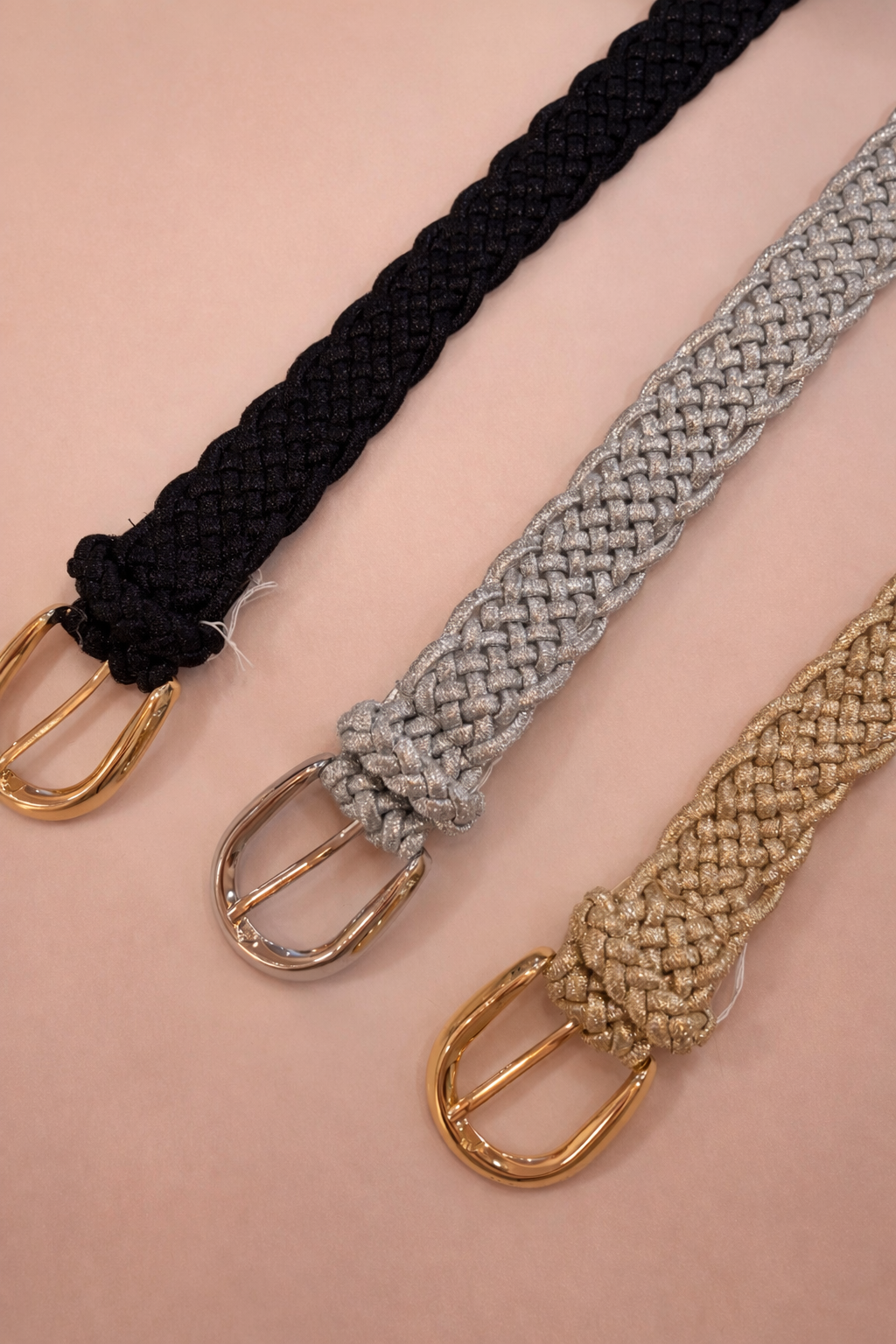 Cinto entrançado elástico com brilho e fivela clássica.