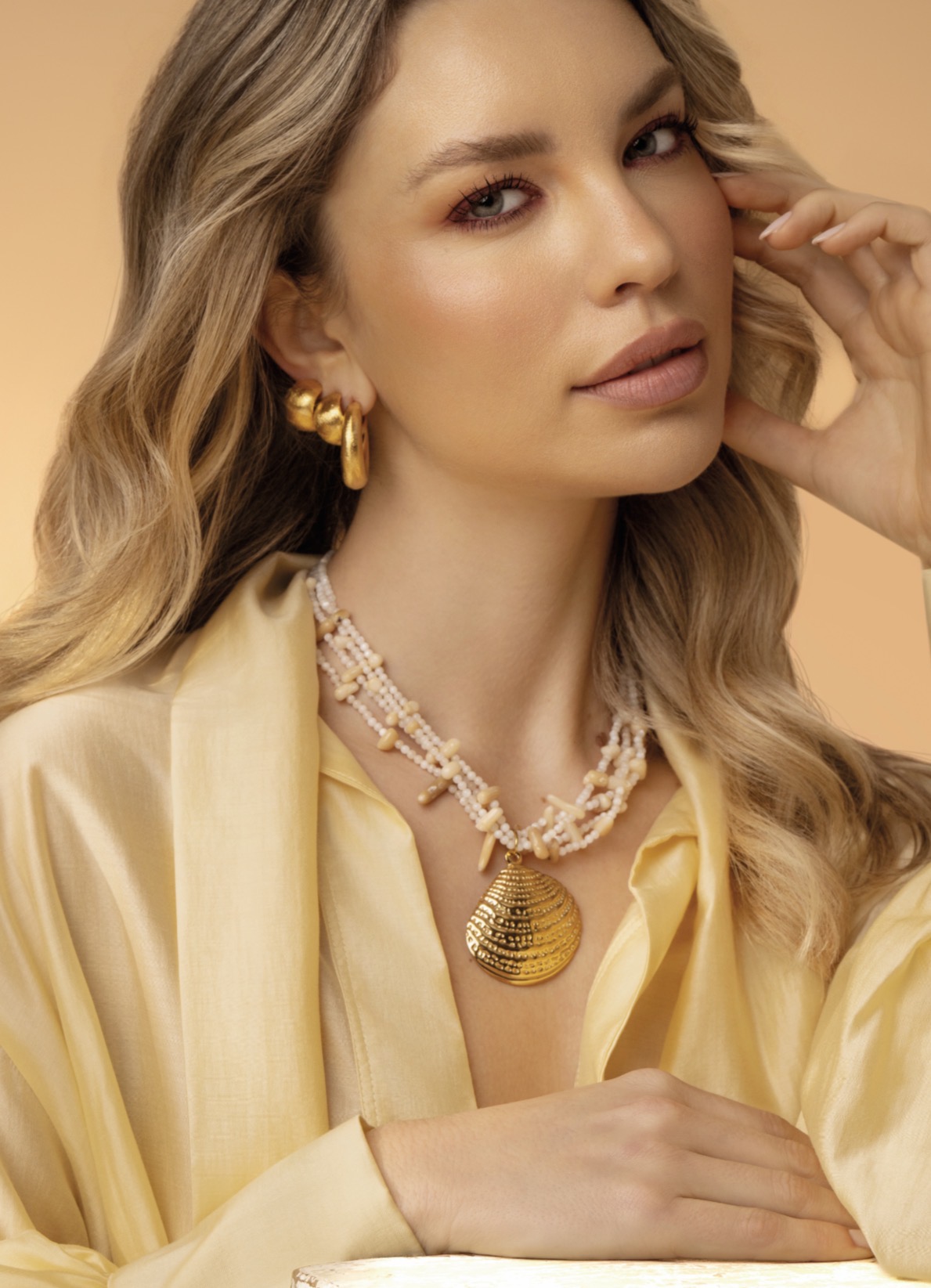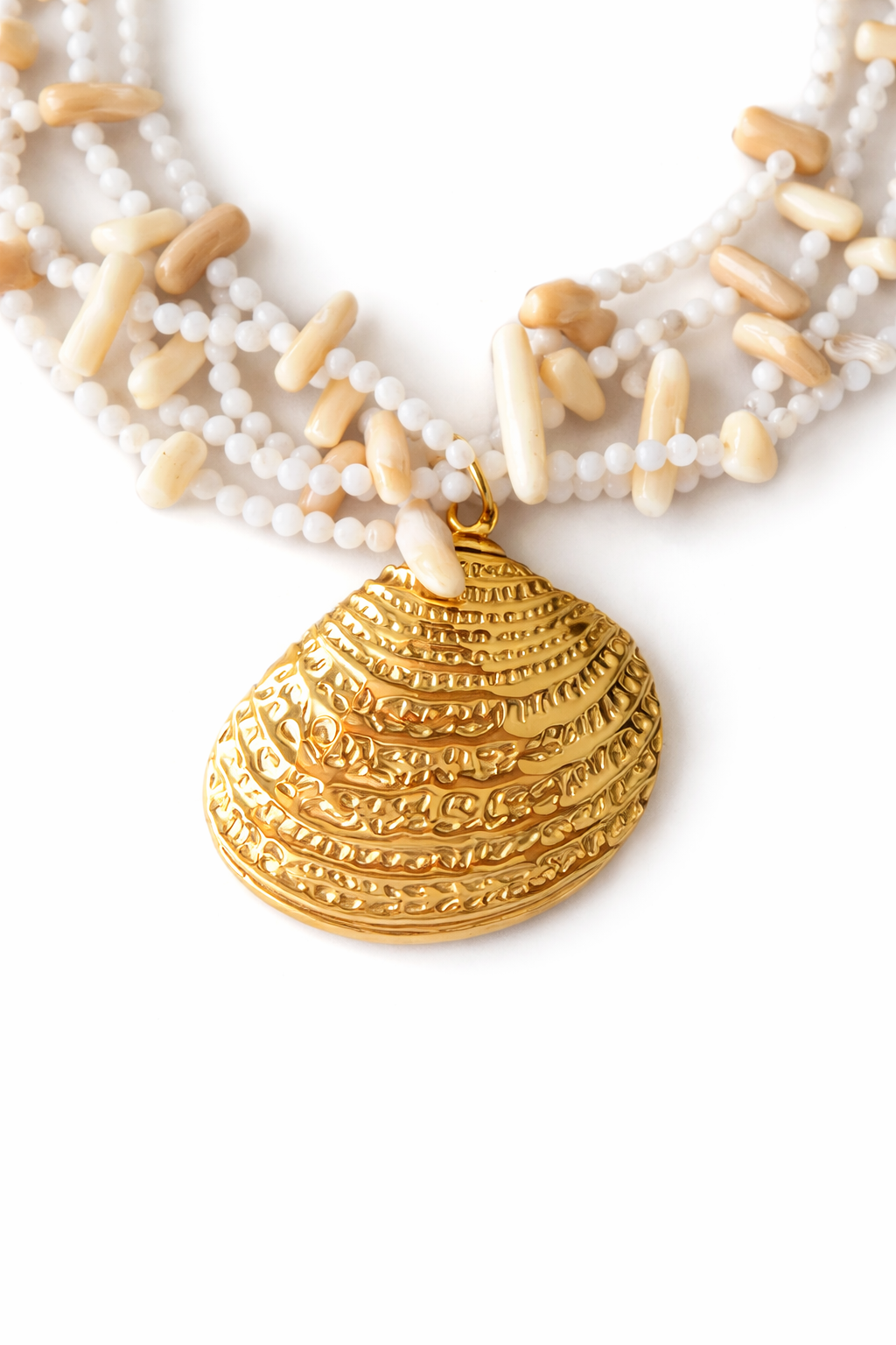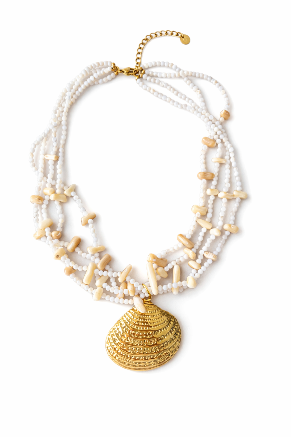Colar de contas variadas em acrílico e pedra natural em cascata com pendente de concha em aço dourado trabalhado.