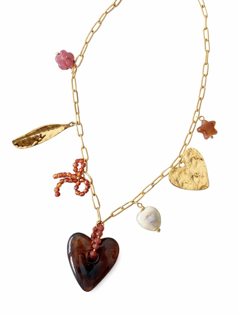 Colar original em aço dourado com corrente de elos grandes e pendentes variados em cerâmica, resina, aço e acrílico.