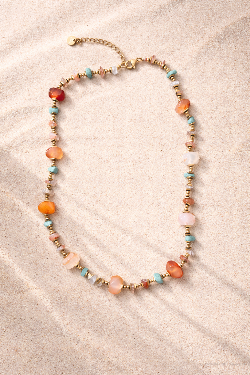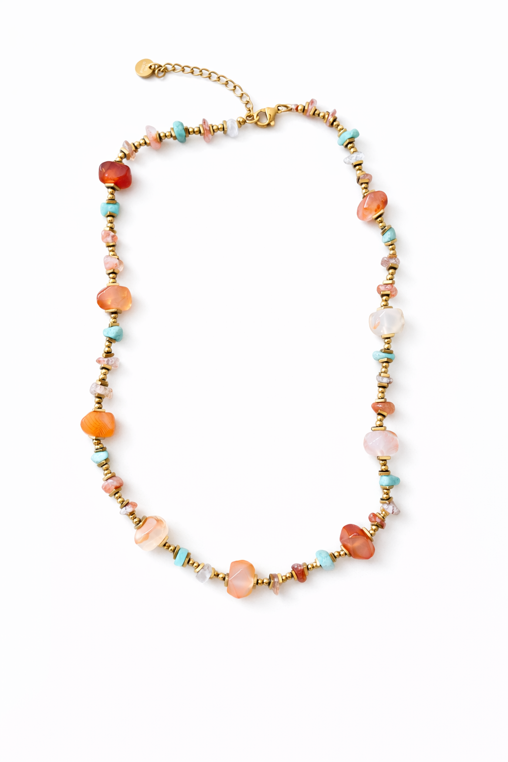 colar em aço dourado com contas variadas e pedras naturais de diversas cores e formatos.