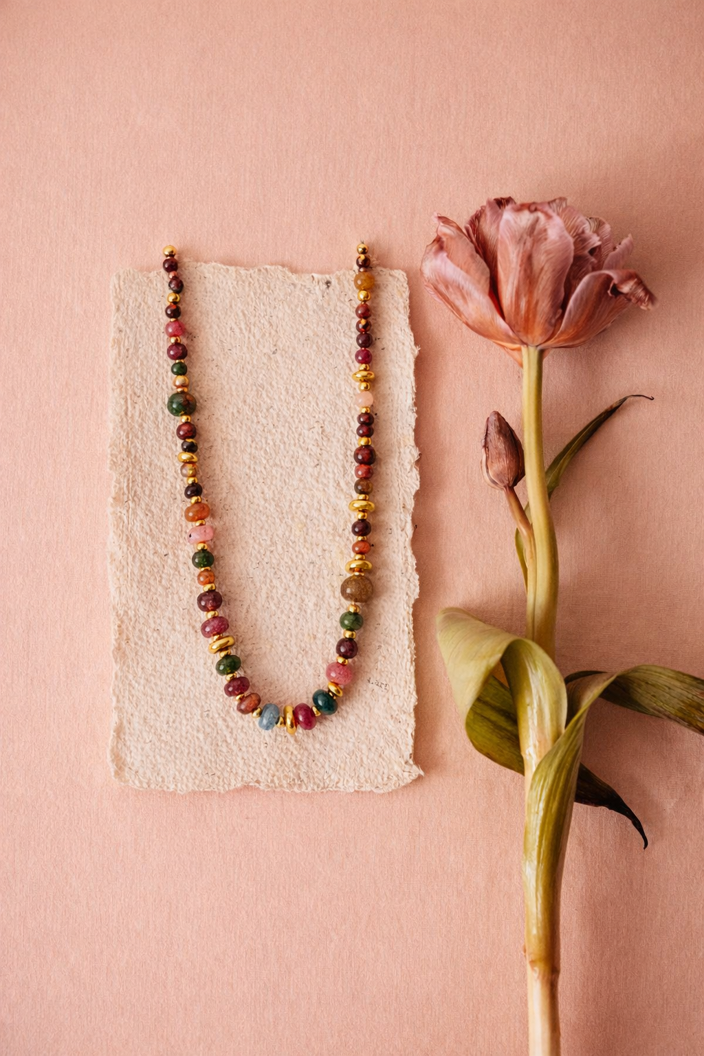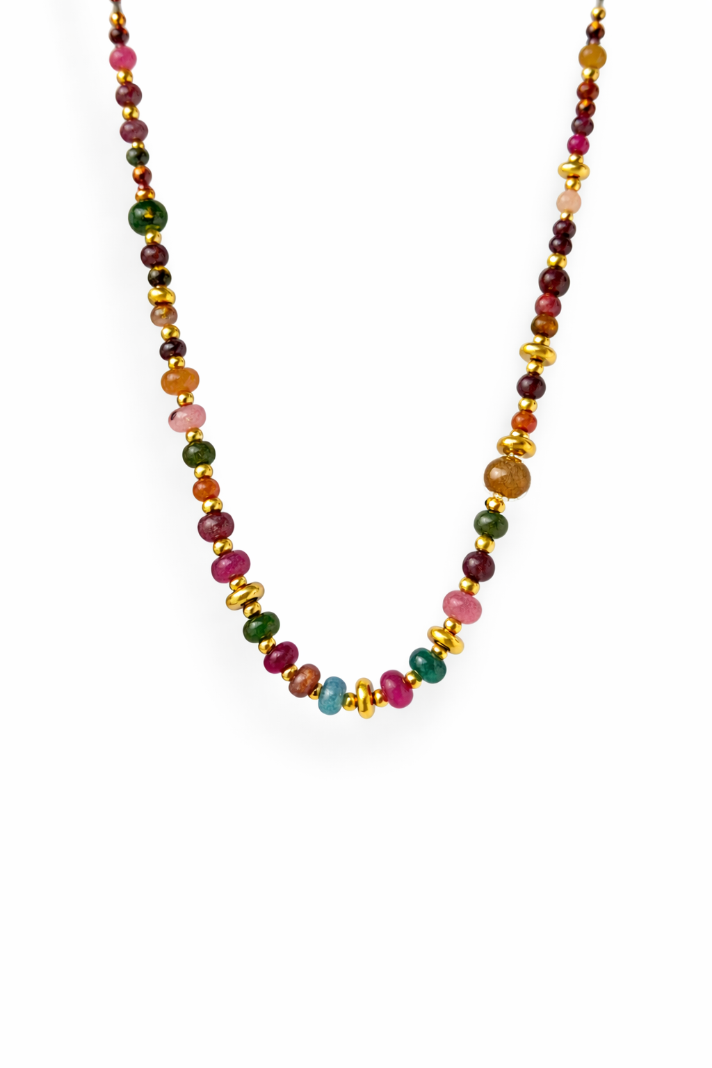 colar de contas coloridas em pedra natural com mini contas em aço dourado.