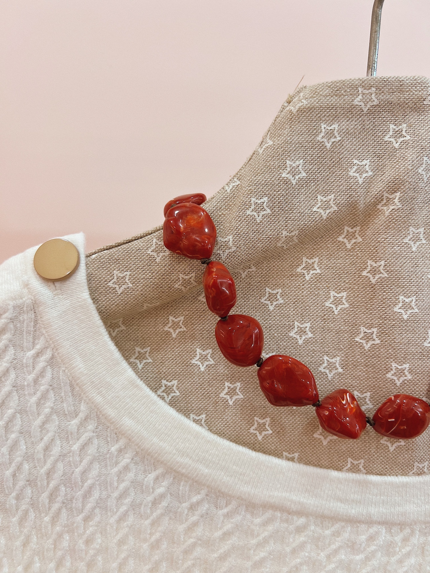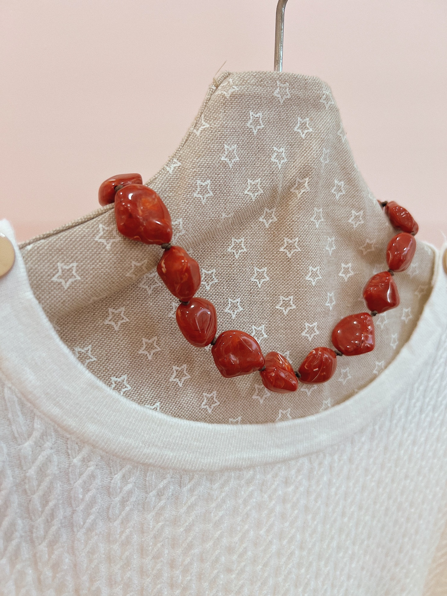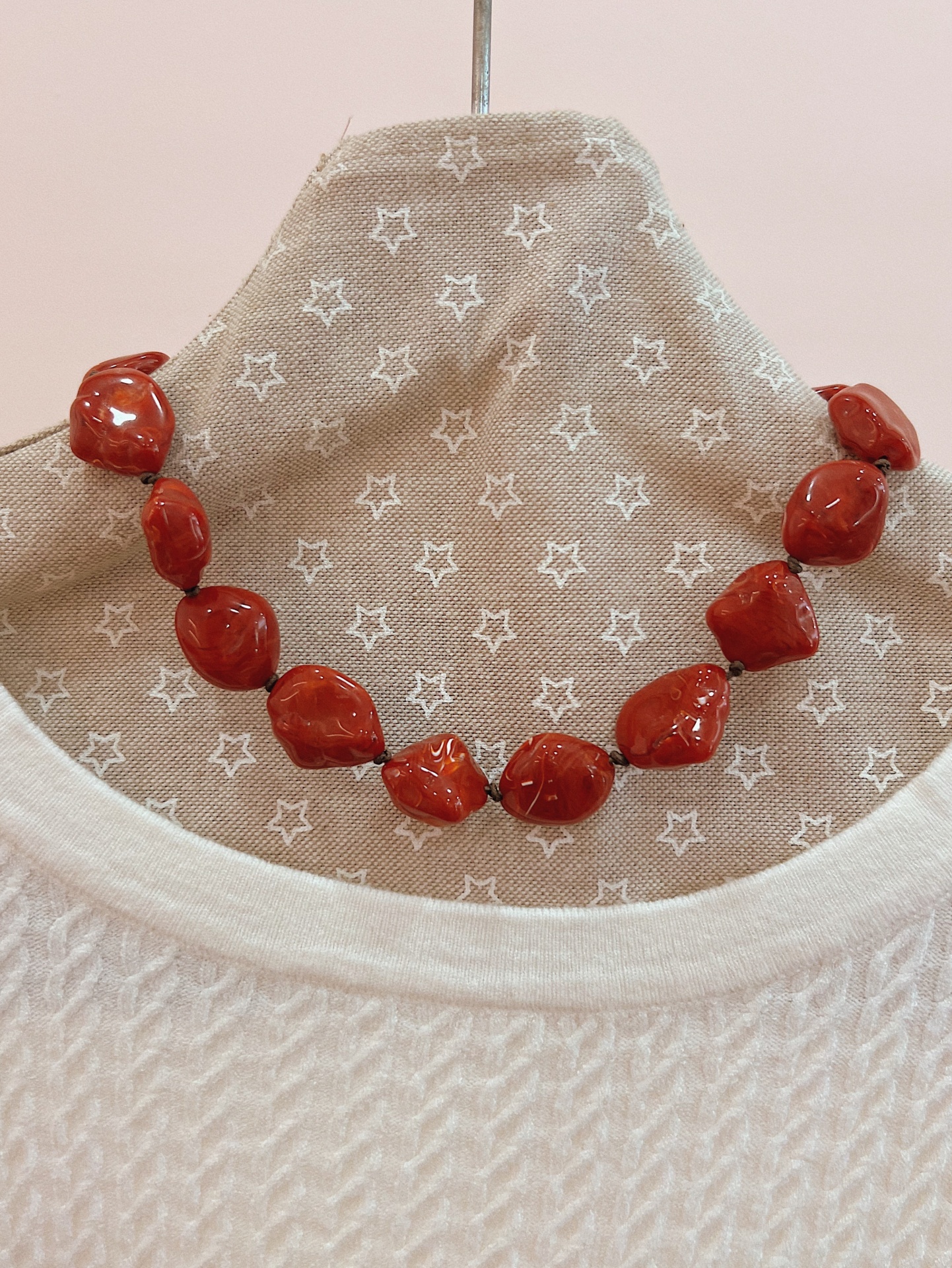 Colar de contas irregulares em resina com efeito marmoreado.