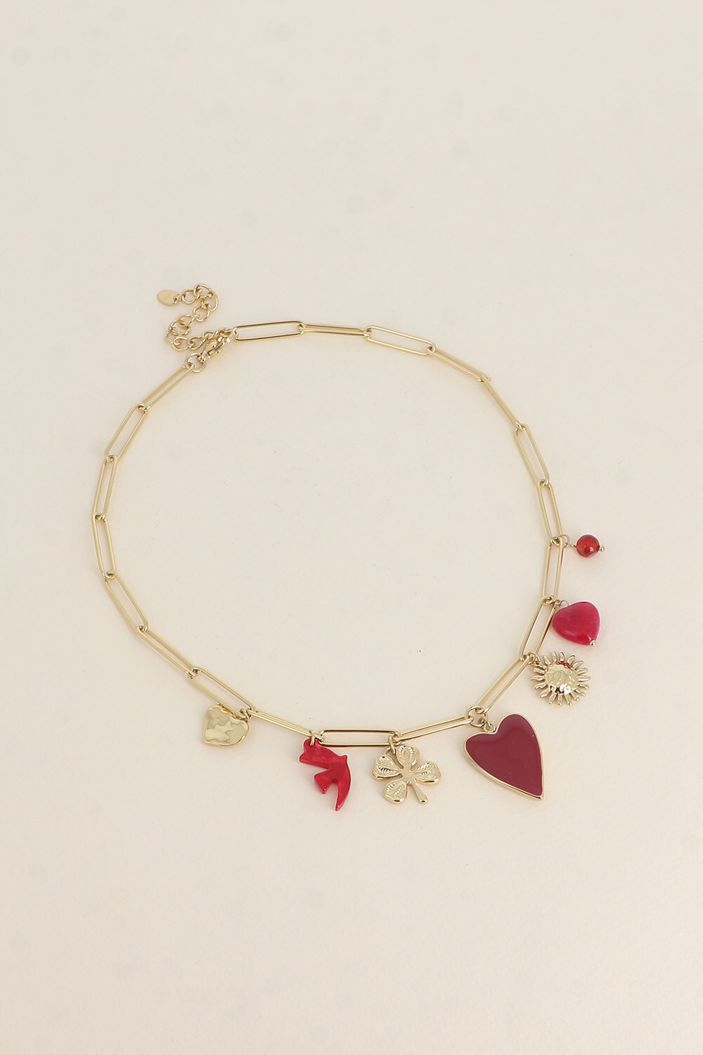 Colar curto com corrente dourada em aço com pendentes variados nas cores dourado e bordeaux.