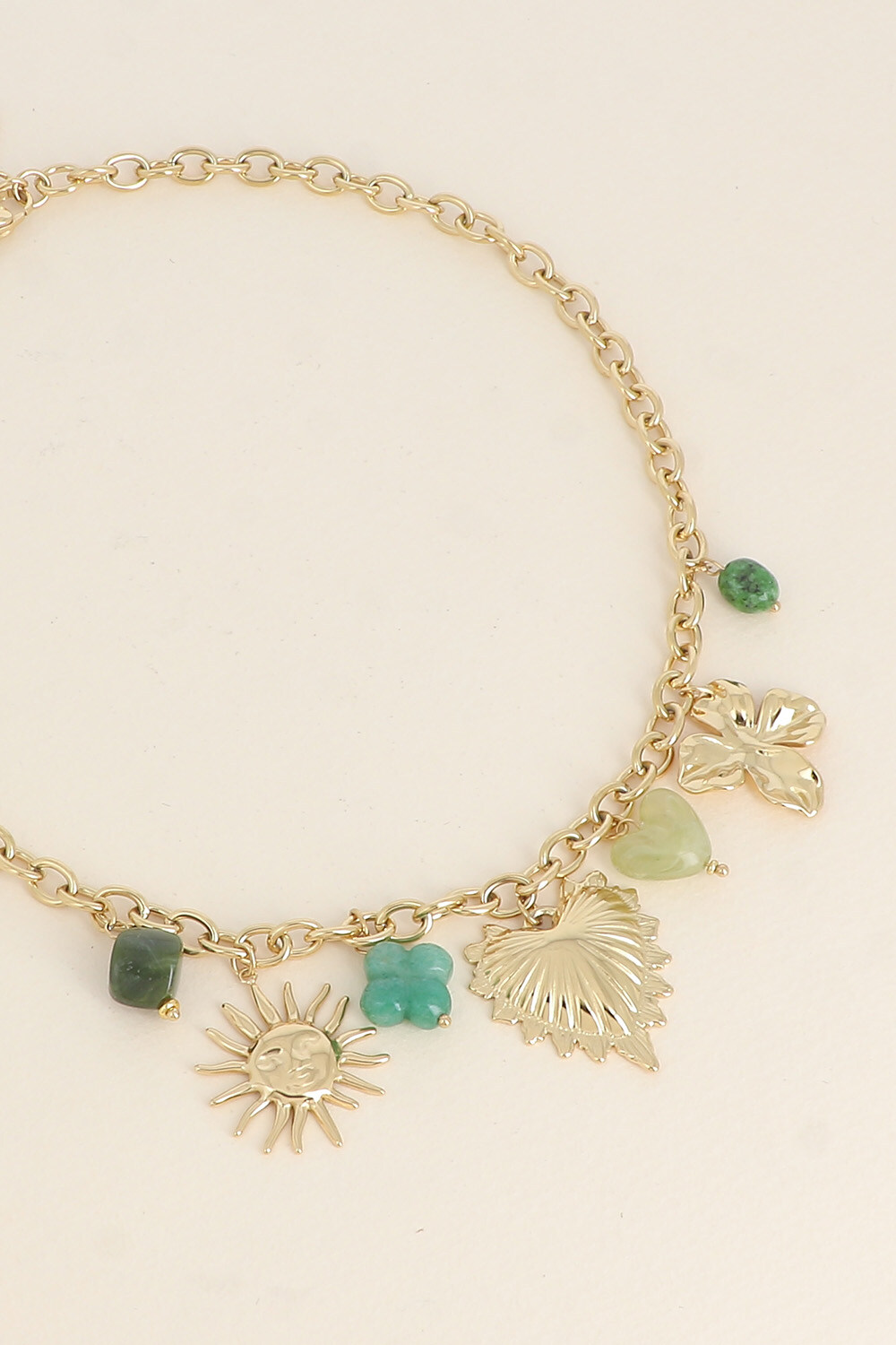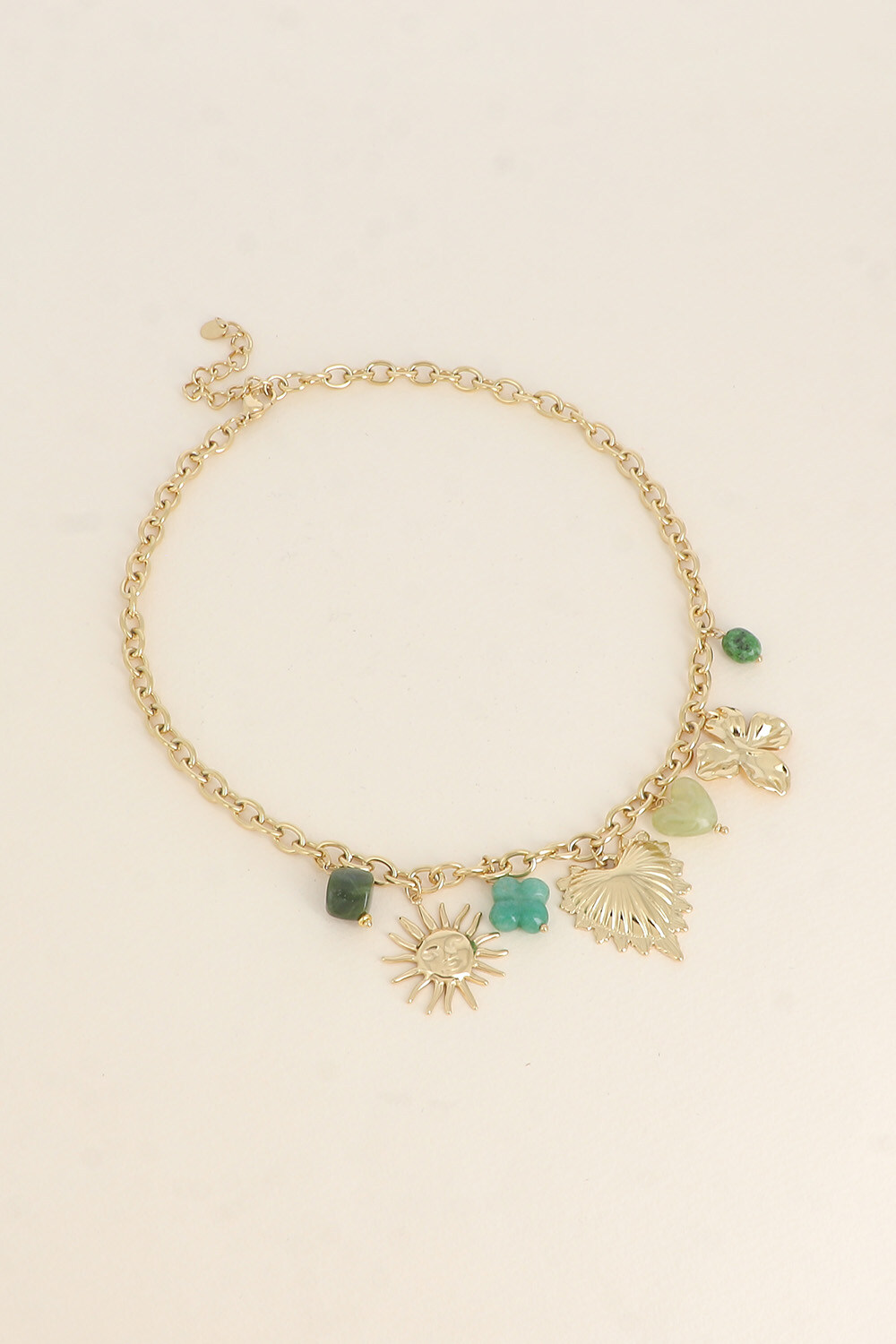 Colar curto em corrente dourada de aço com pendentes variados em dourado e resina em tons de verde.