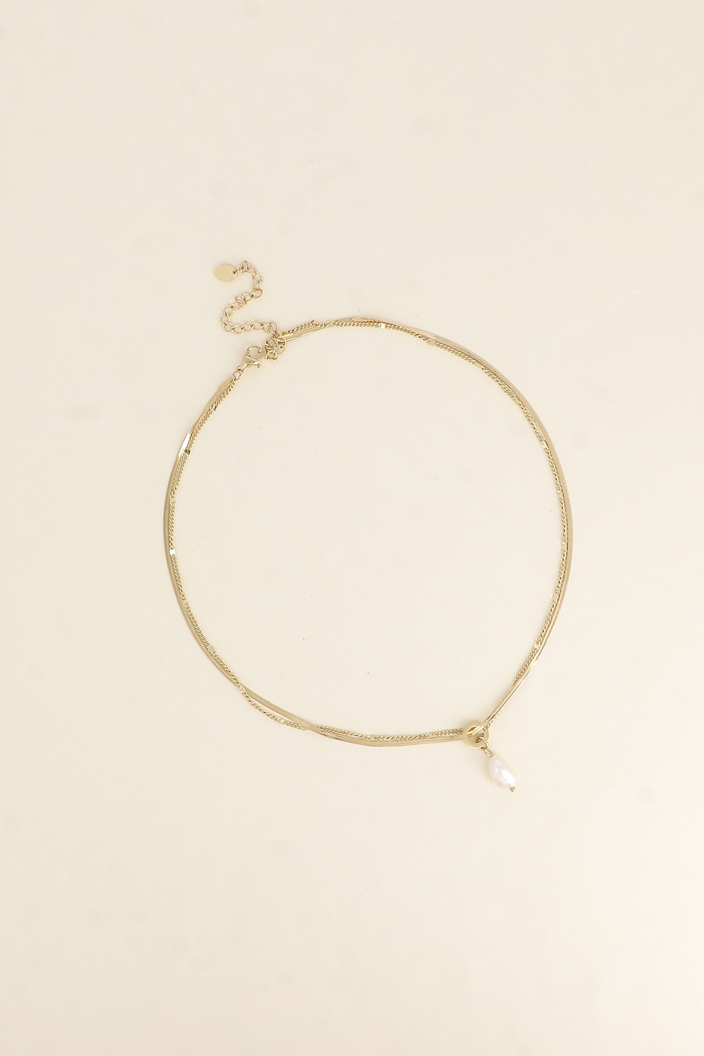 Colar com duas correntes diferenciadas em aço dourado, com aro e pendente de pérola de àgua-doce.