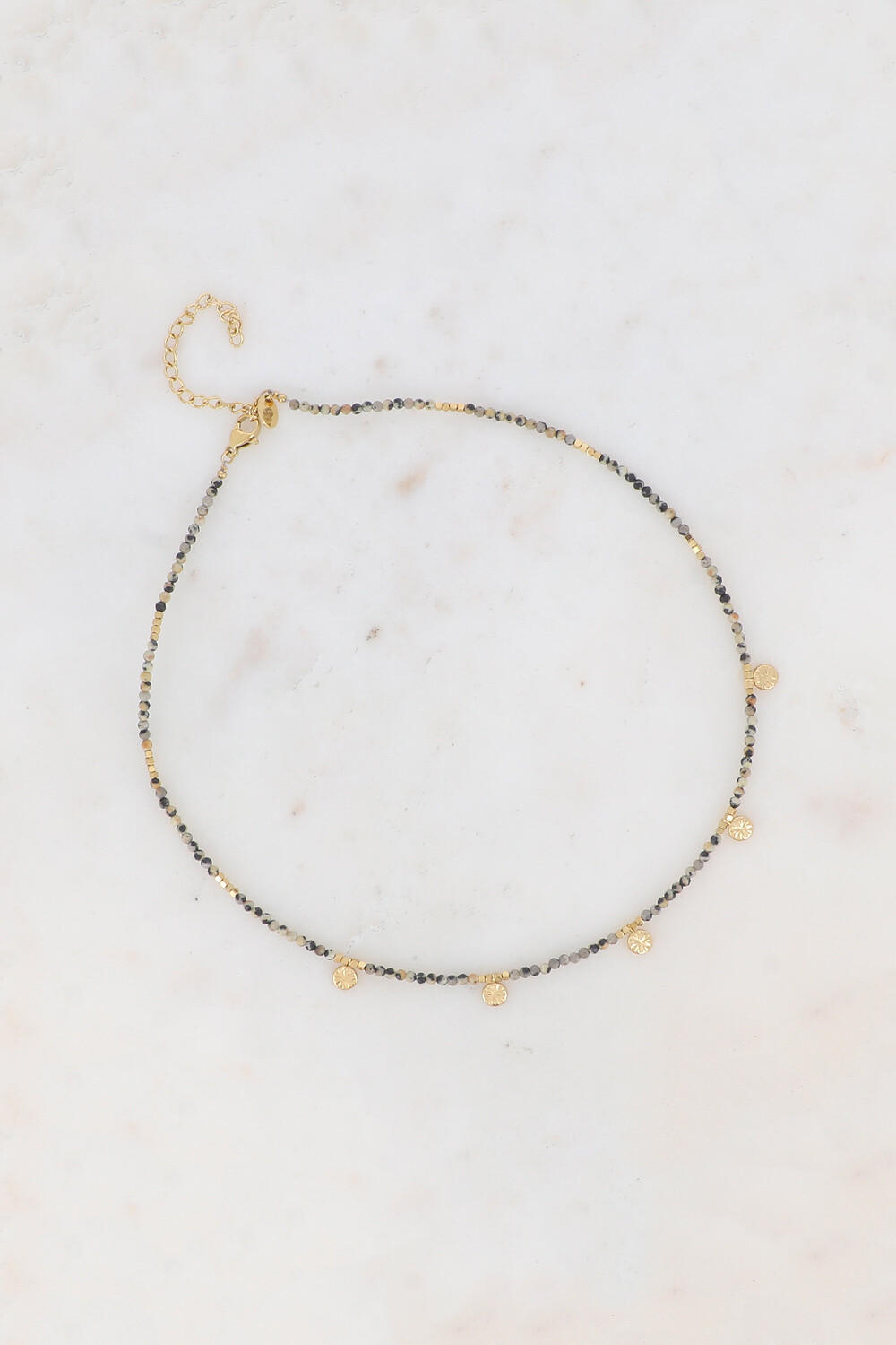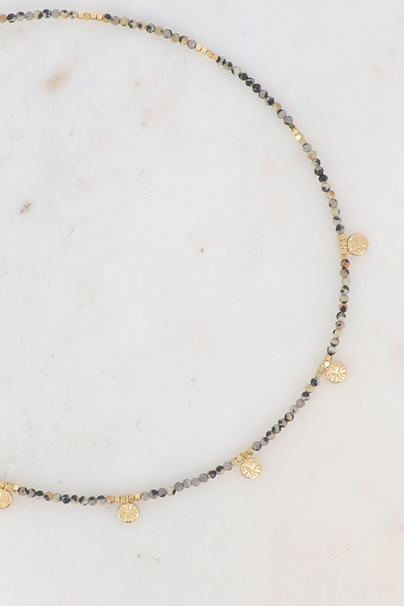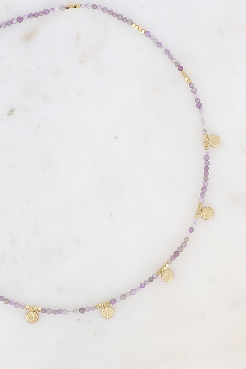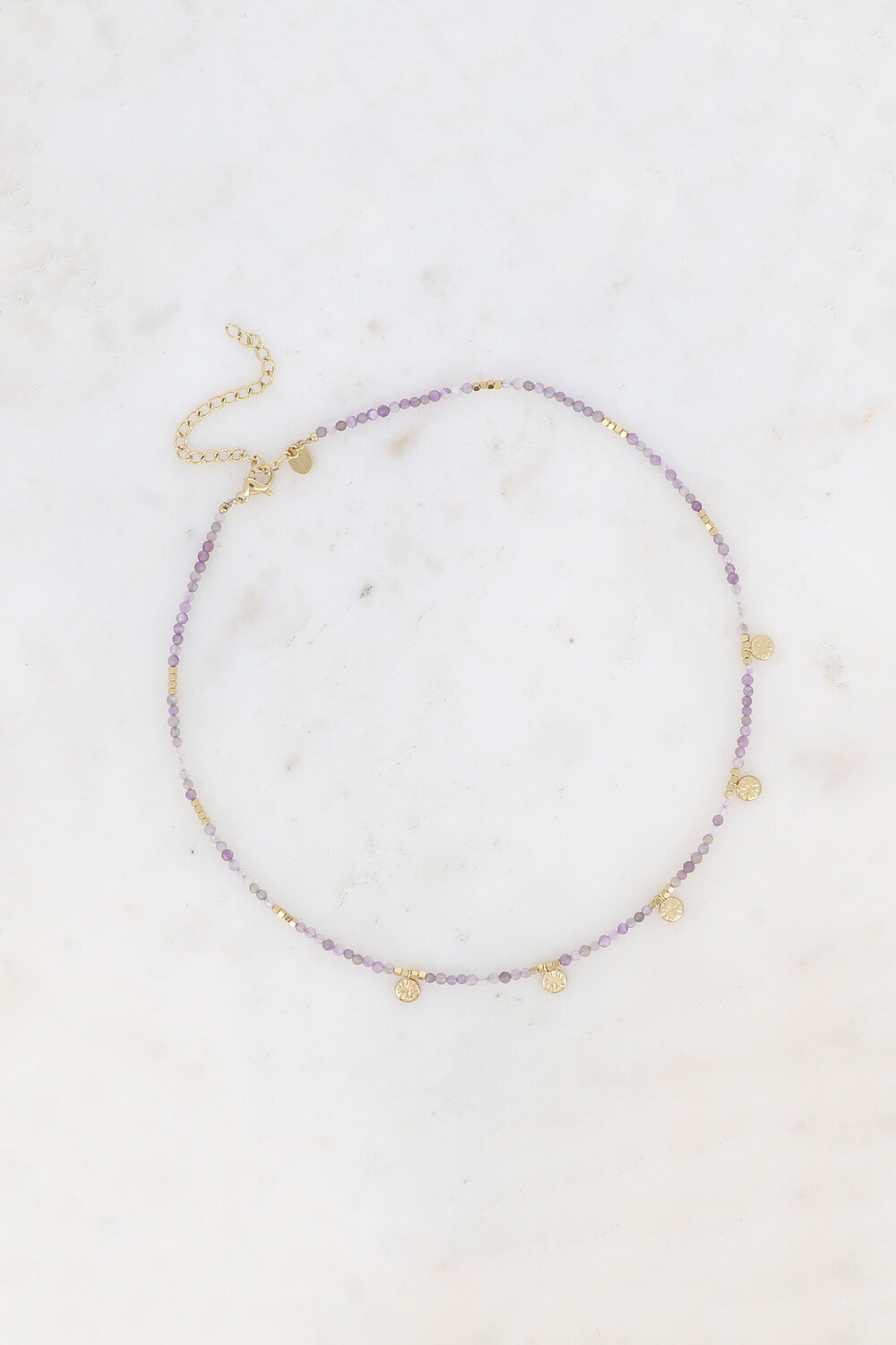 Colar com finas missangas de pedra natural facetada (com lapidação de pedras preciosas) e medalhas pequenas em aço dourado espaçadas ao longo do colar. Fecho de maior dimensão para maior conforto ao colocar e retirar. Extensor para colocar na medida que desejar.