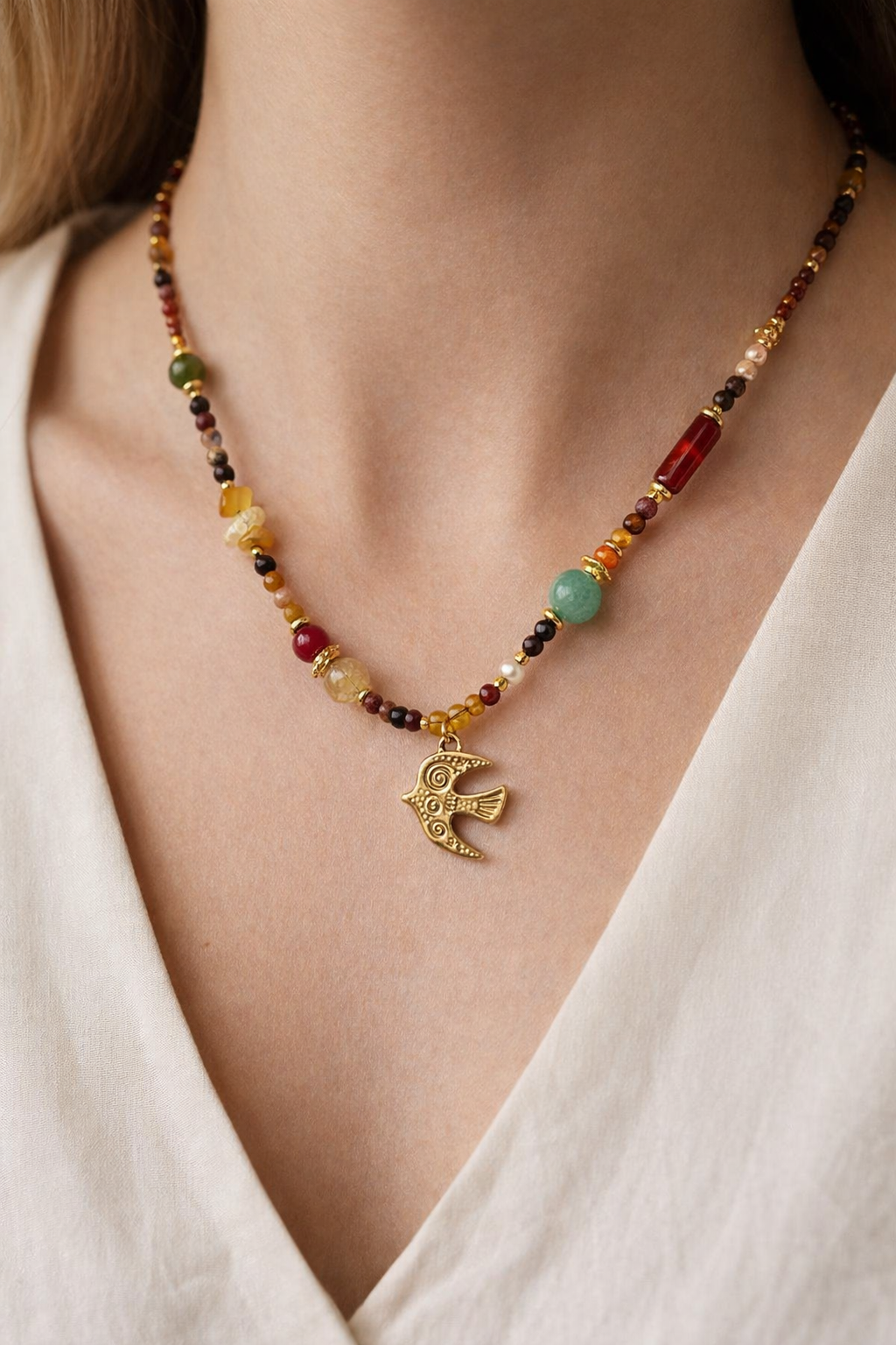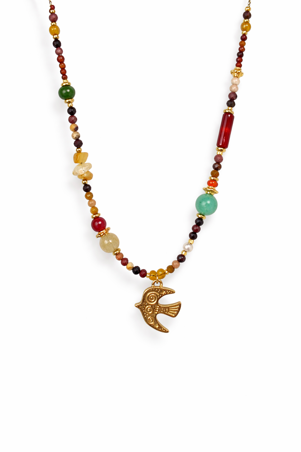Colar de contas em pedra natural com diversas formas e cores com pendente de pássaro.