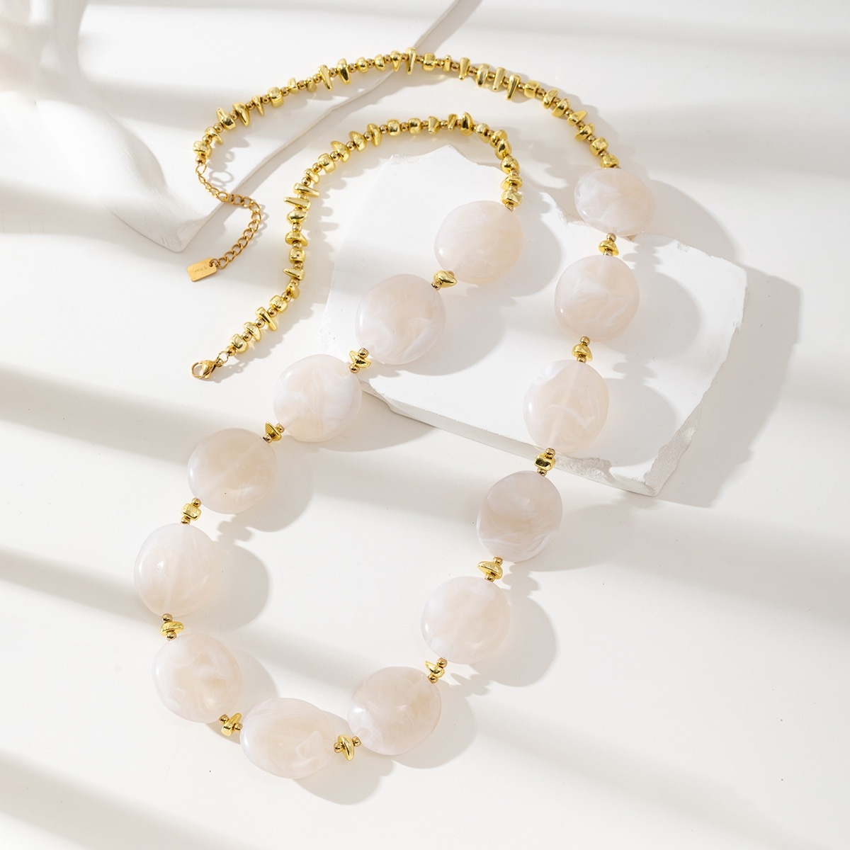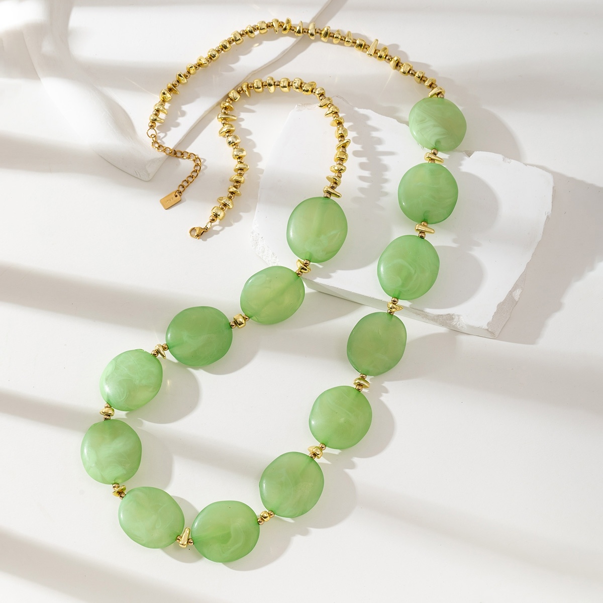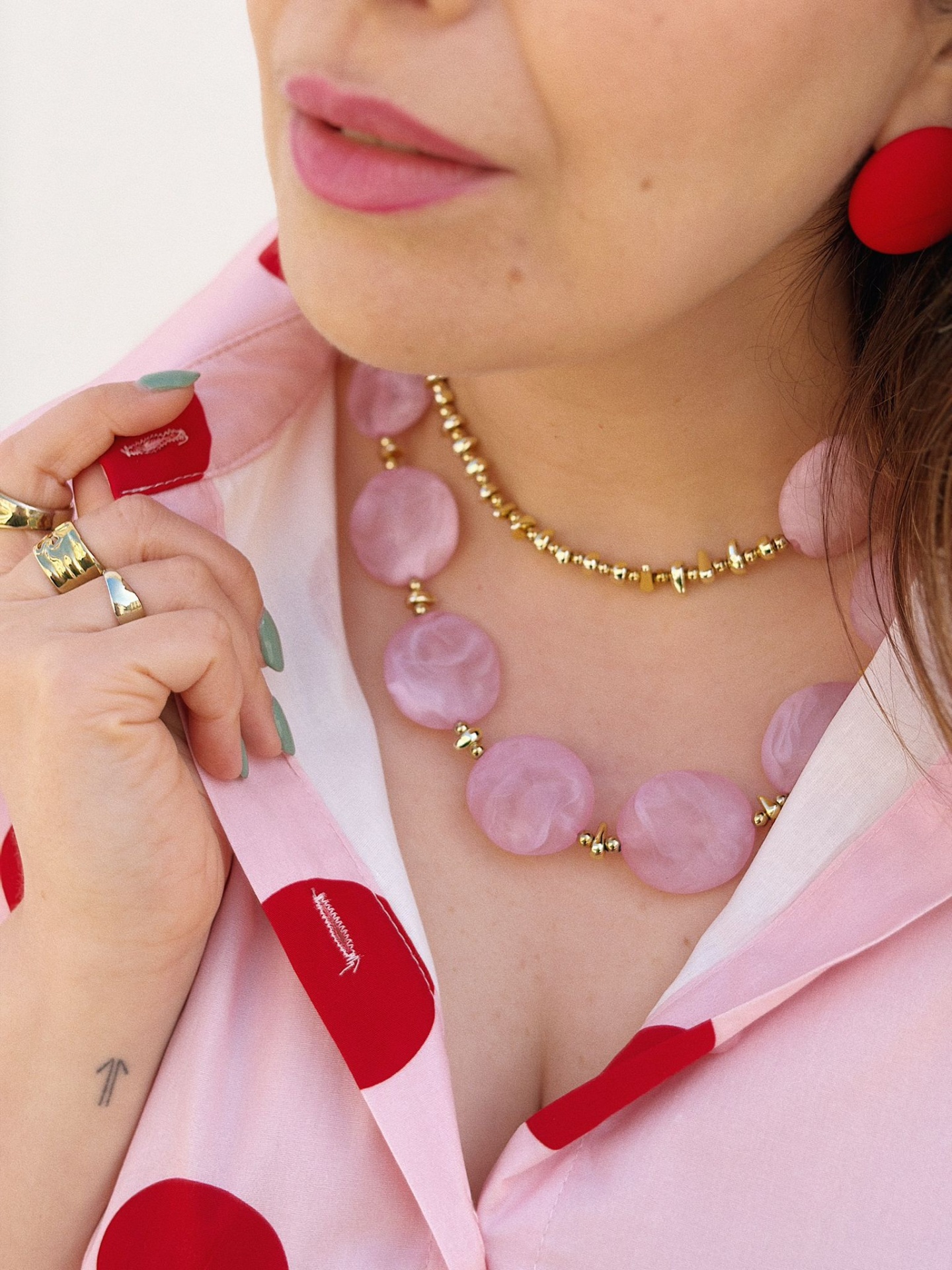 Colar em aço dourado comprido com mini contas assimétricas e contas em resina.