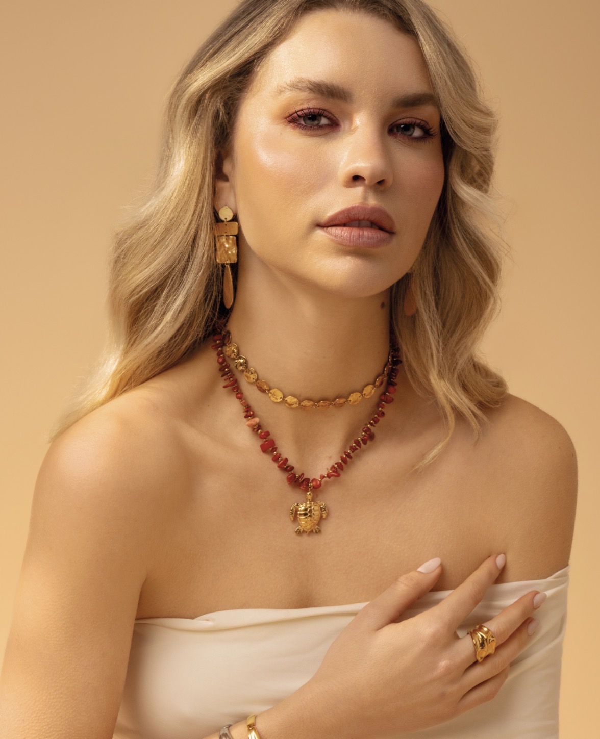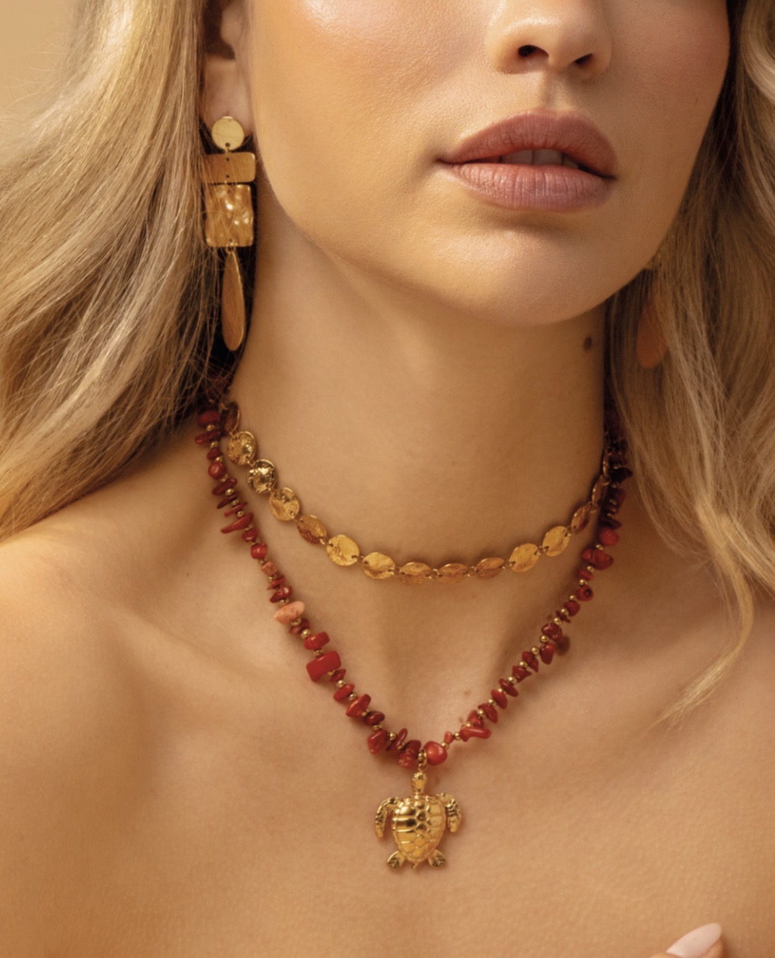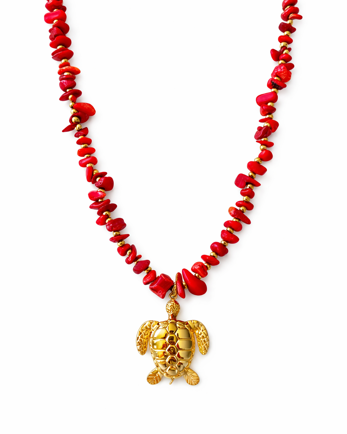 Colar de contas vermelhas e em aço dourado com pendente de tartaruga.