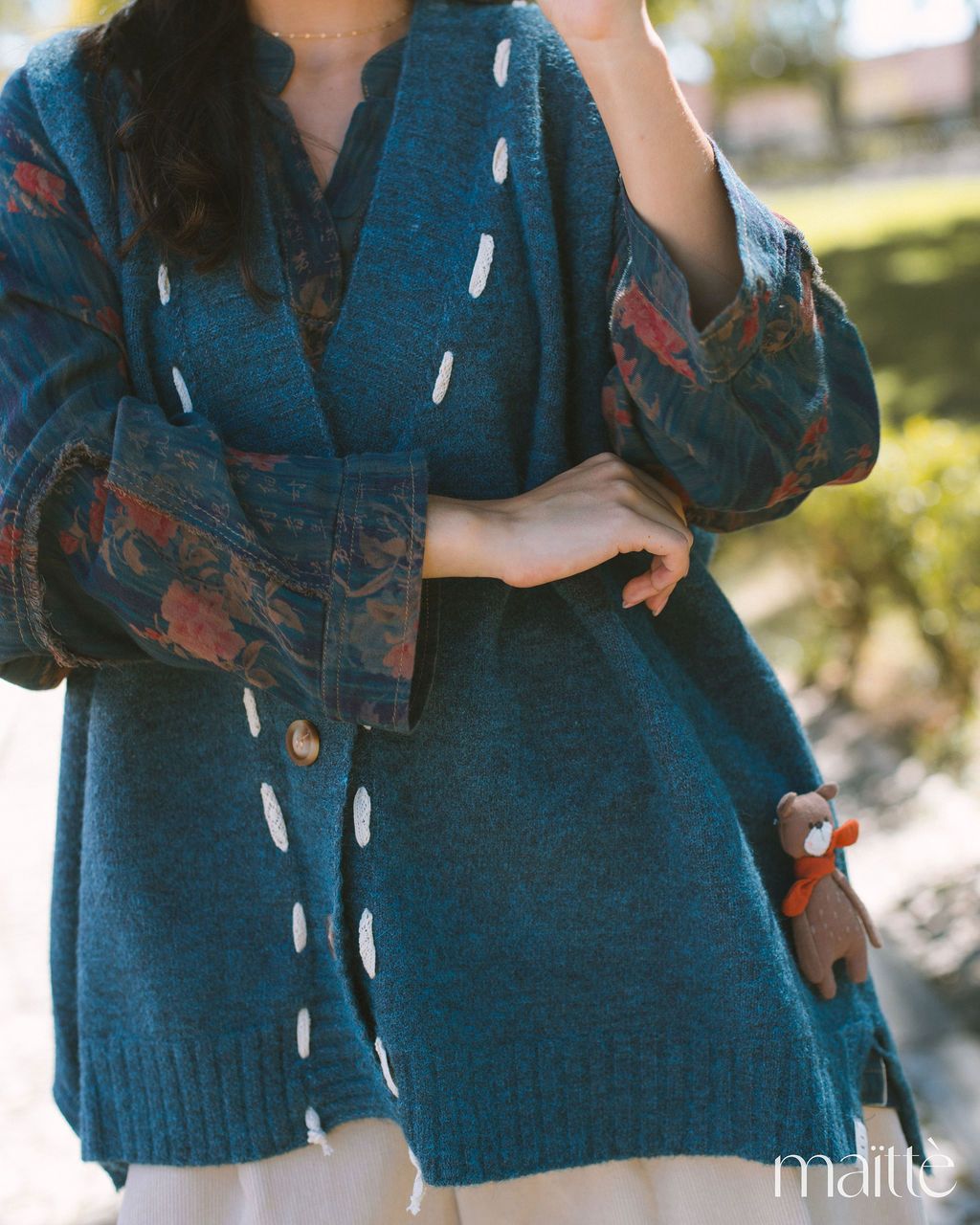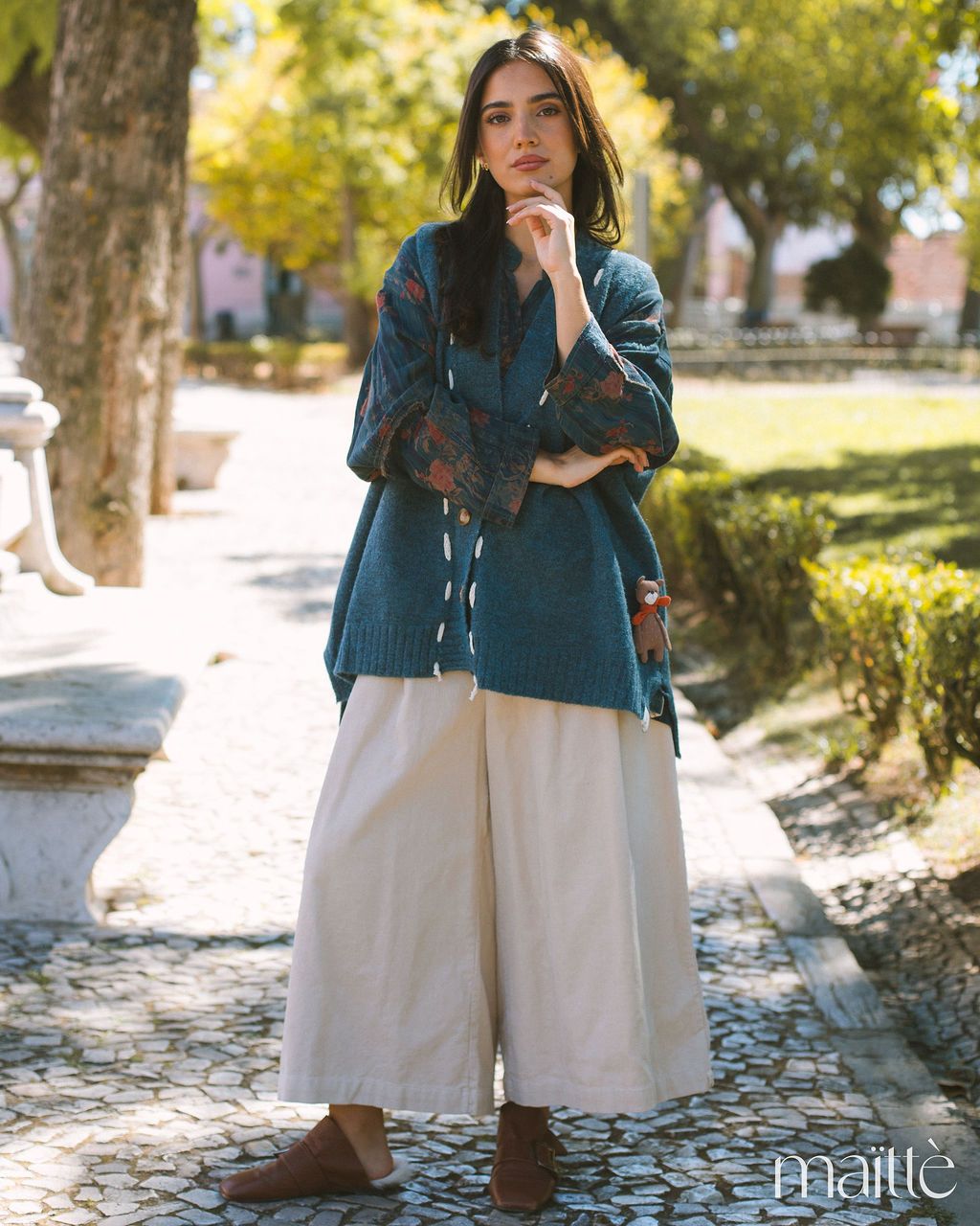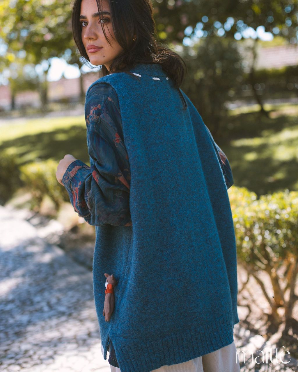 Colete de malha azul (numa malha bem composta e quentinha) com decote em V e efeito de botões à frente, ornamentado com renda.