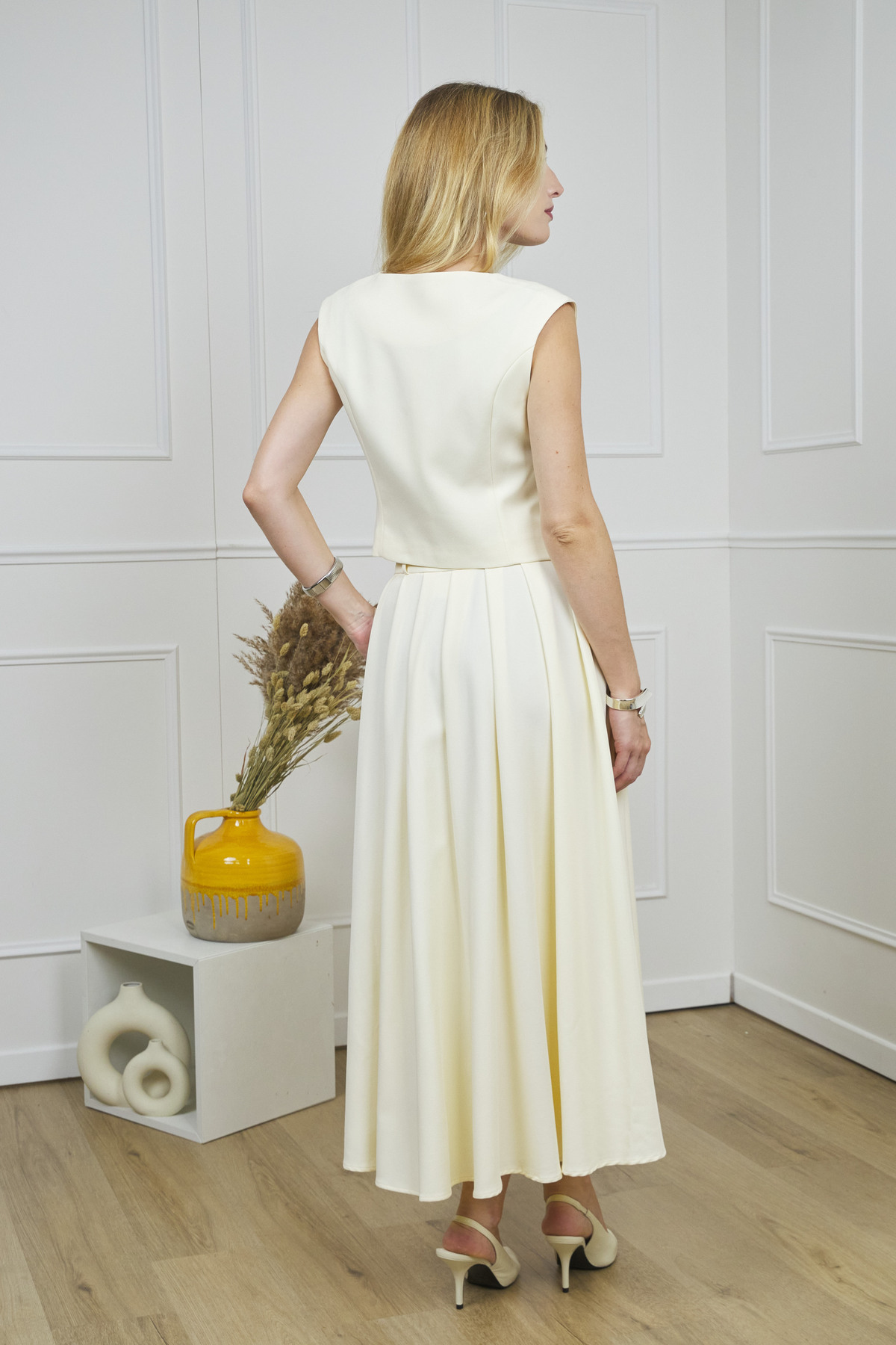 Colete curto original num tom delicado e perfeito para usar com todas as cores e padrões.