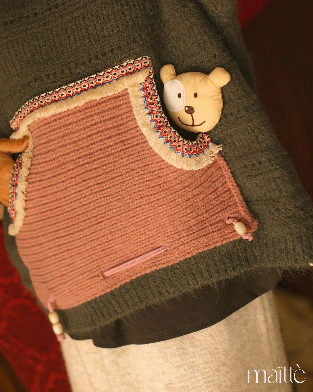 Corte recto com bolso à frente estilo Canguru em malha rosa ornamentado com variadas aplicações e urso lateral.