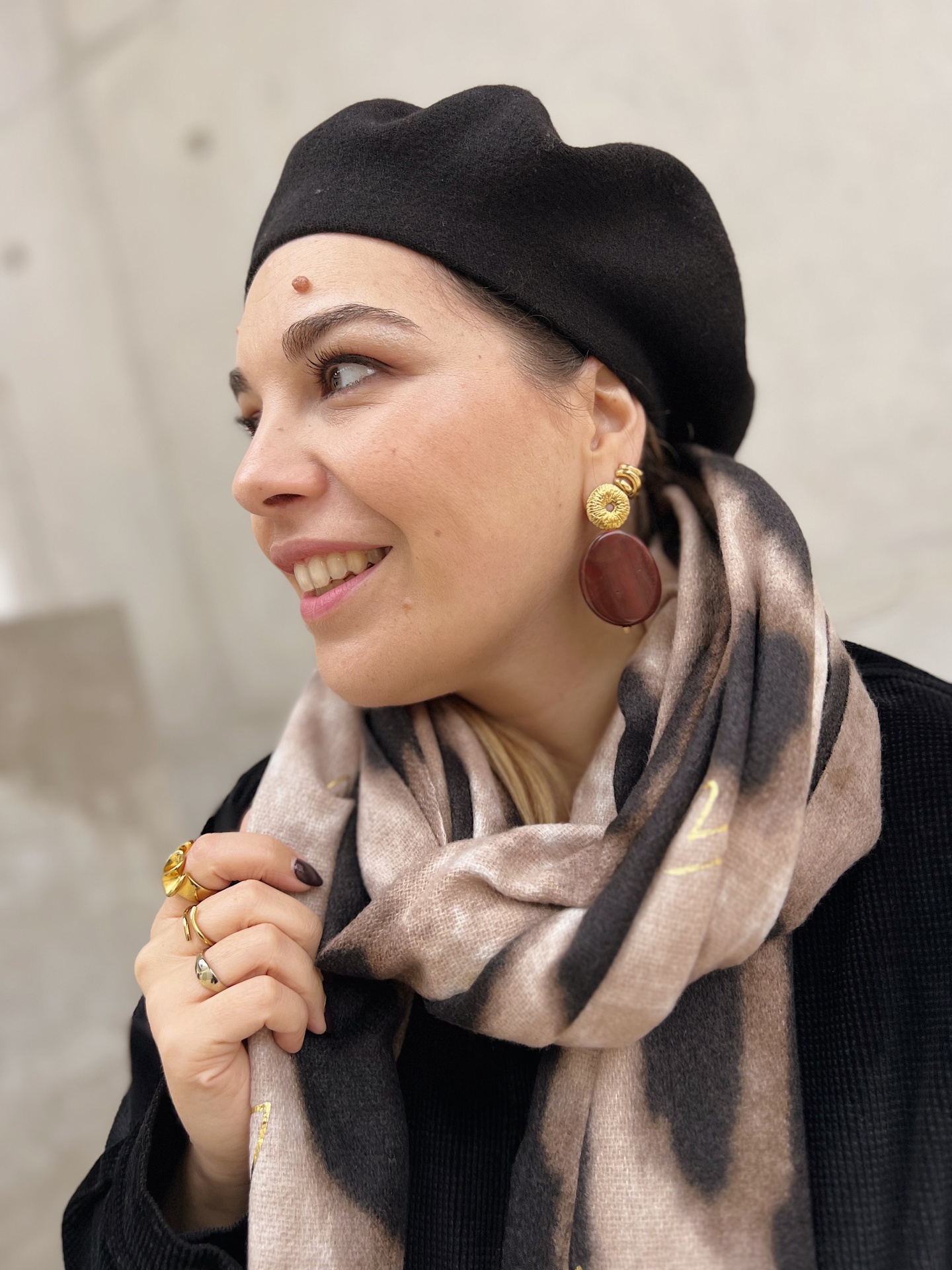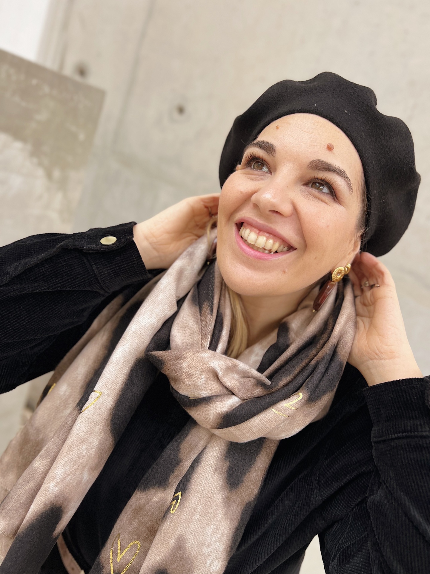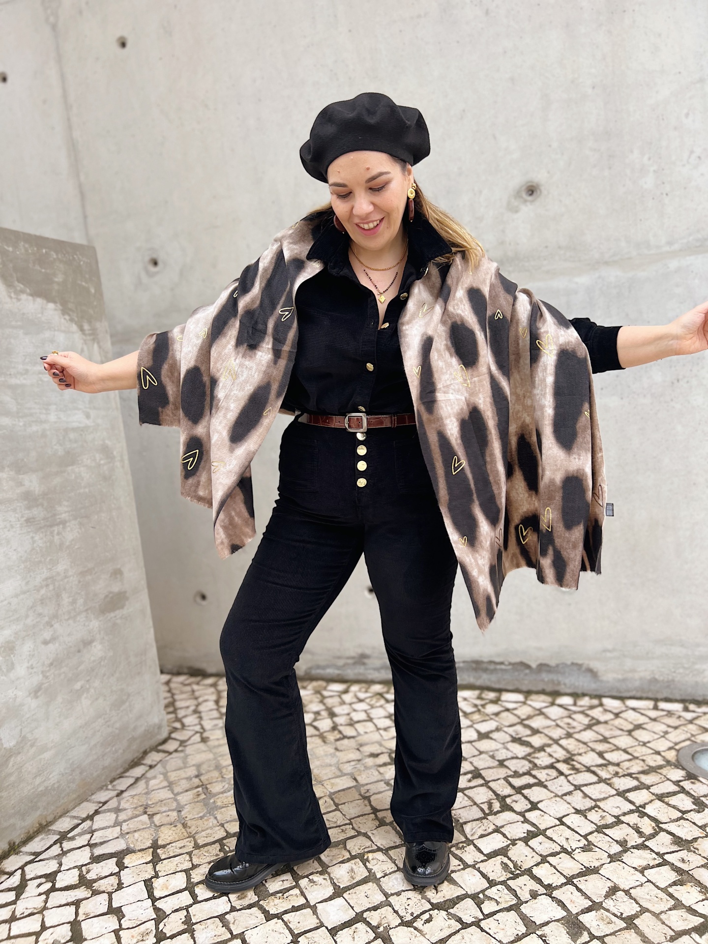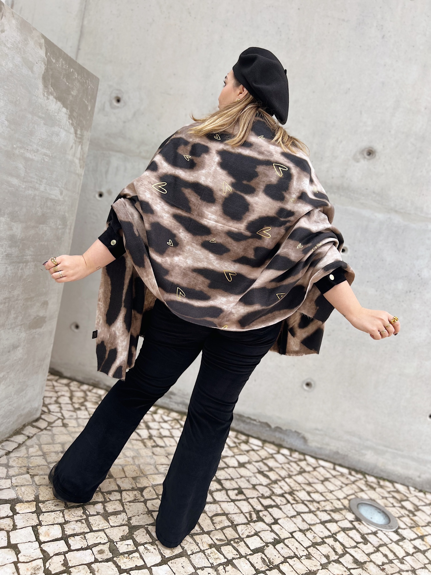 Echarpe quentinha com padrão animal print em tons de castanho e corações dourados em destaque.