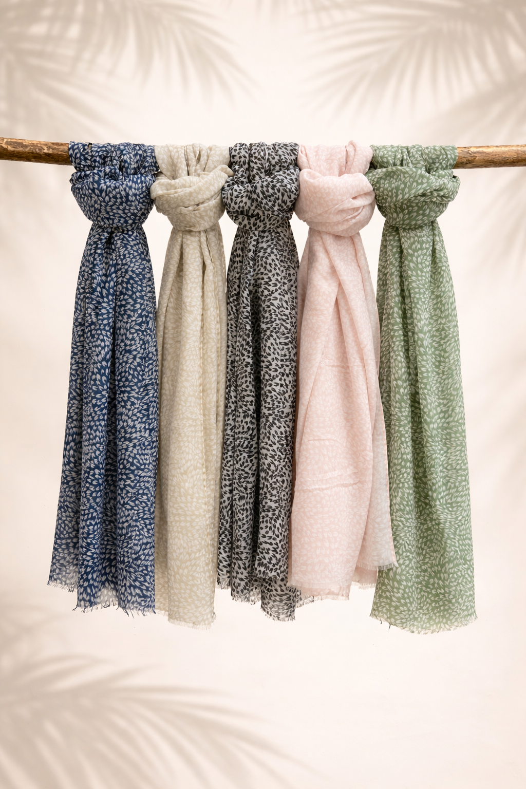 Echarpe com padrão abstracto e discreto de pequenas folhas.