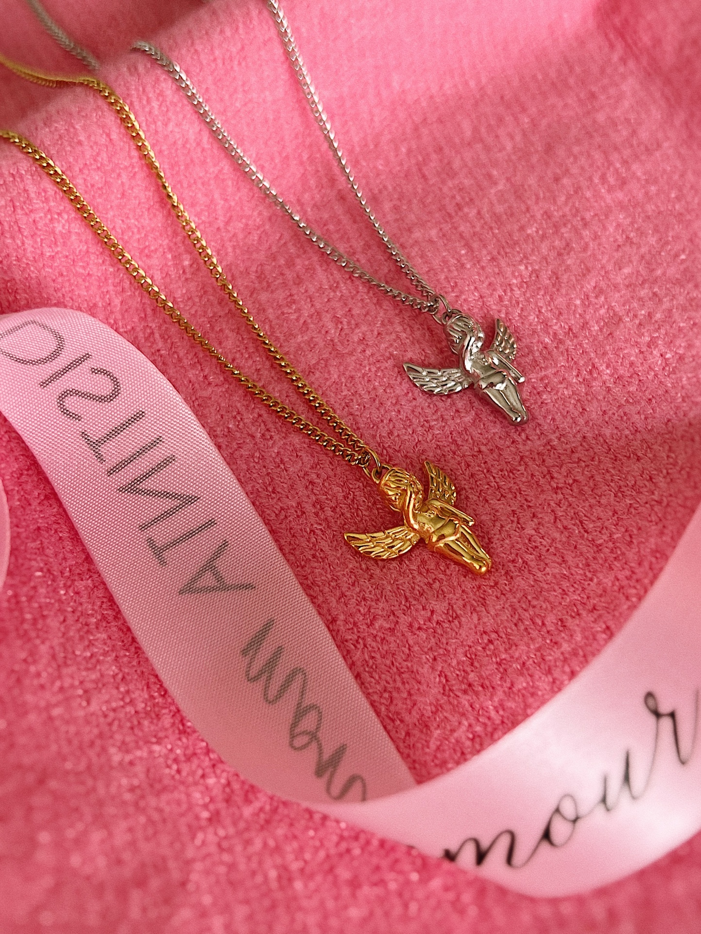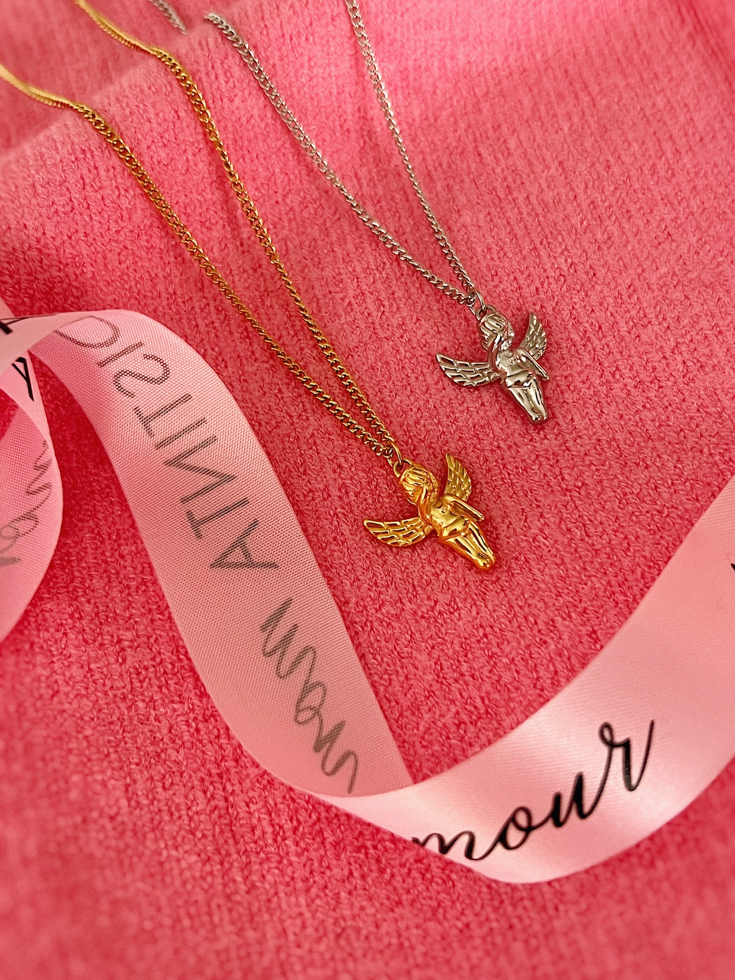Fio em aço com corrente tradicional e pendente de anjo barroco.