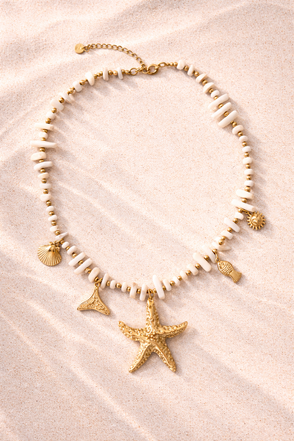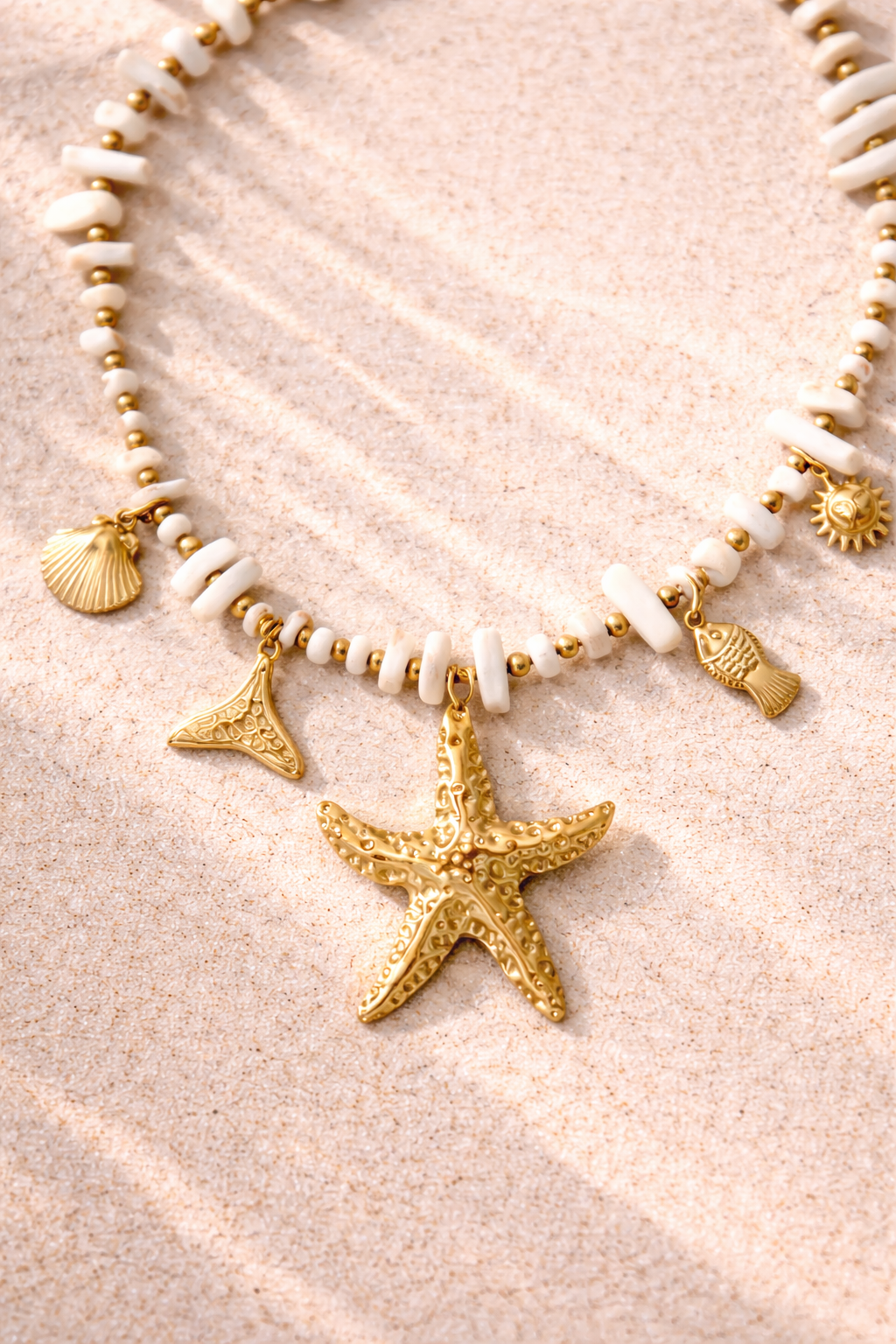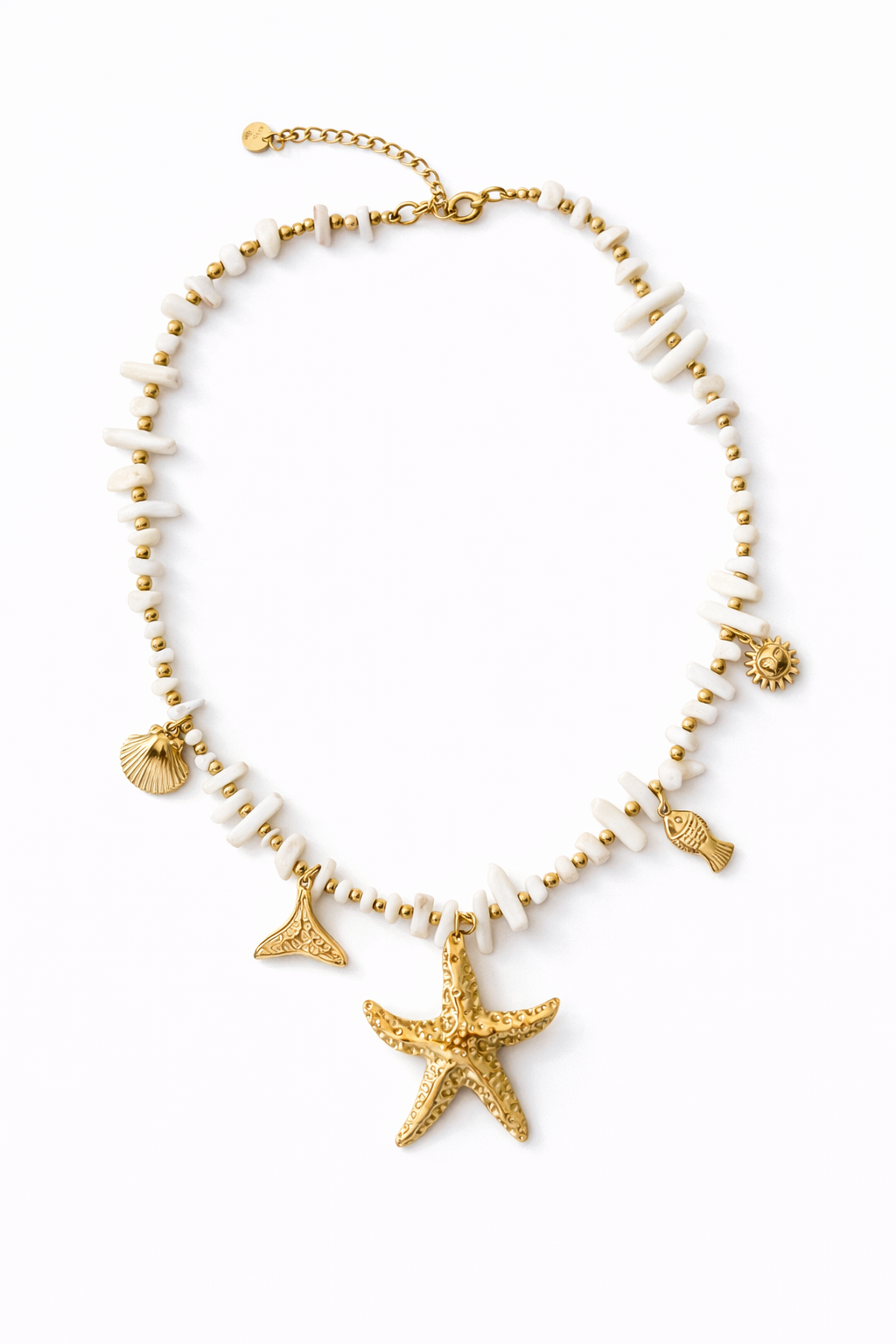 Fio em aço dourado e contas variadas em pedra natural (tons de branco) com pendentes marítimos.
