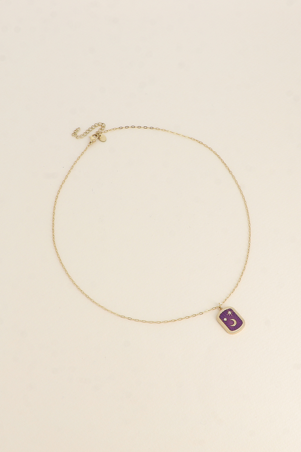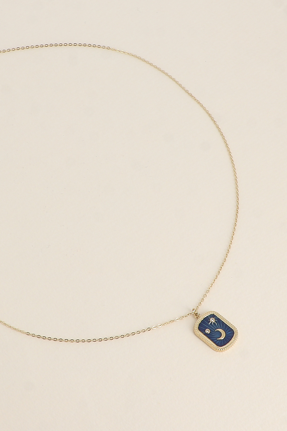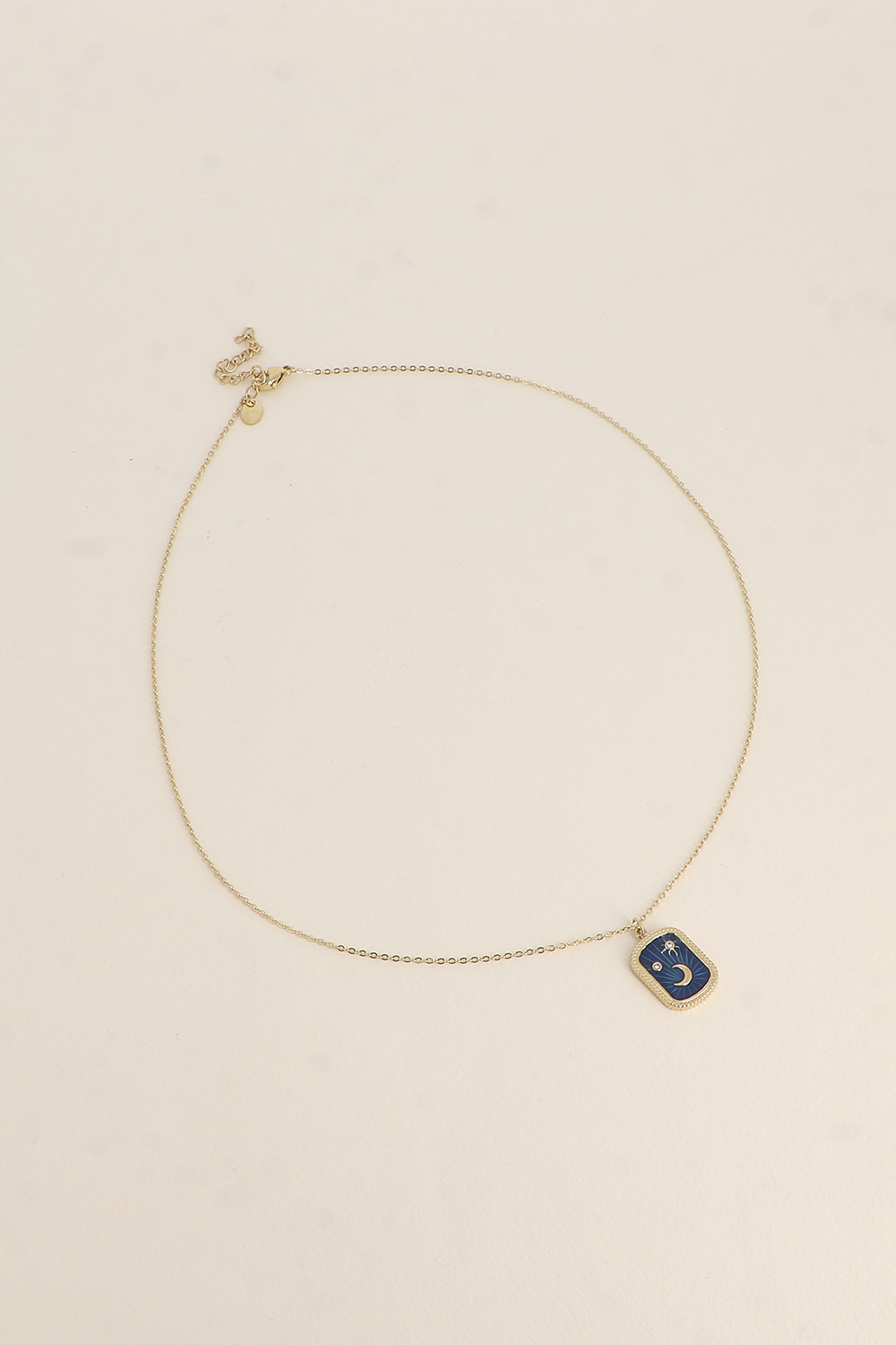 Fio em corrente dourada com comprimento médio com pendente rectângular em aço dourado colorido com lua e estrelas.