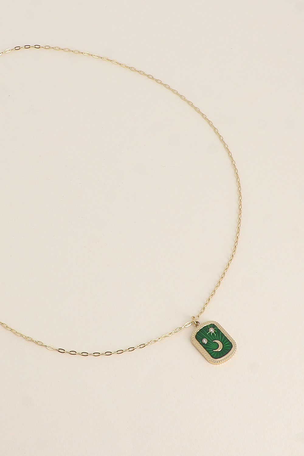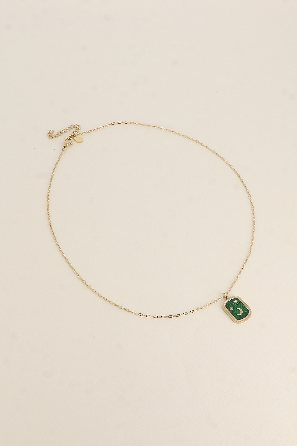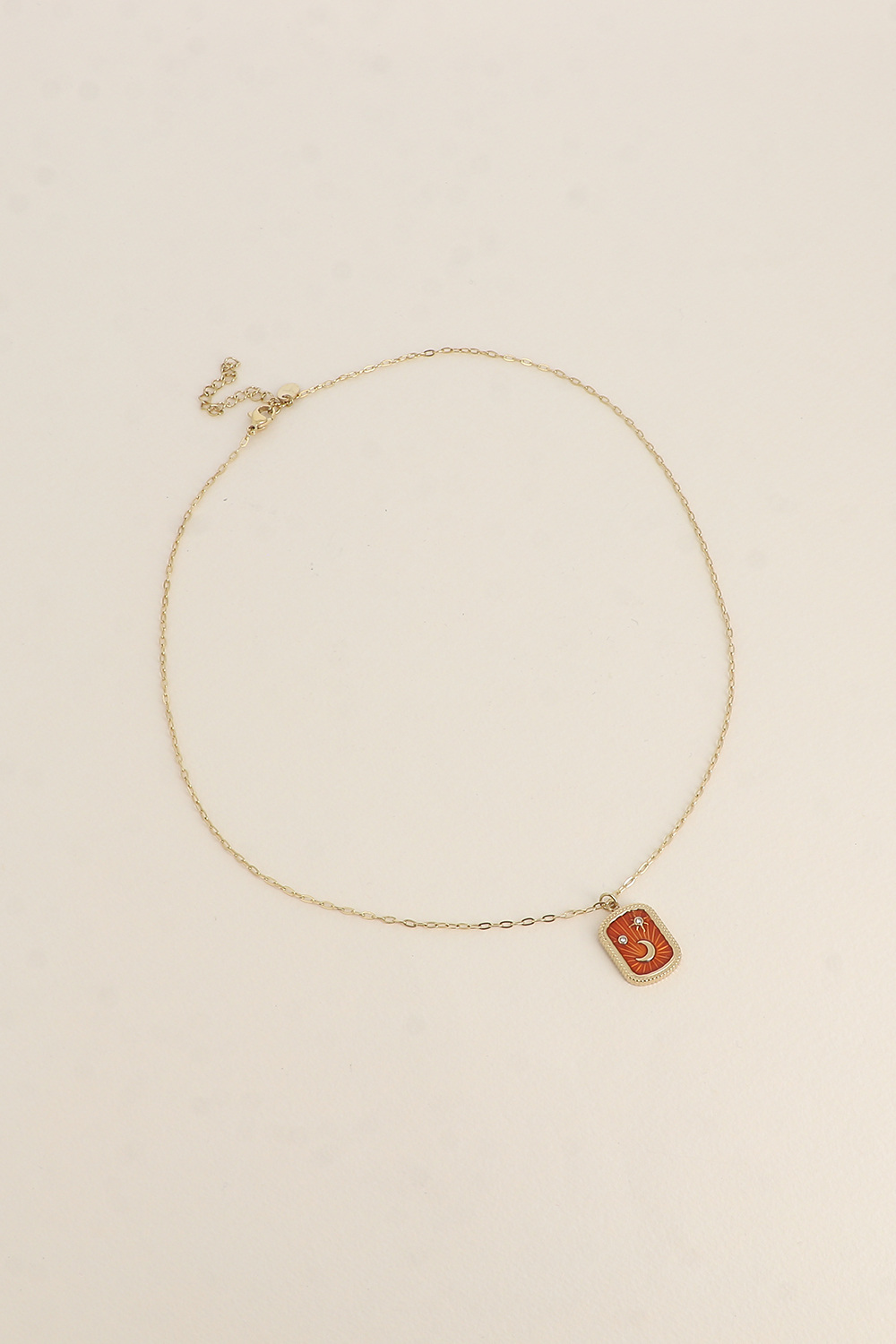 Fio em corrente dourada com comprimento médio com pendente rectângular em aço dourado colorido com lua e estrelas.