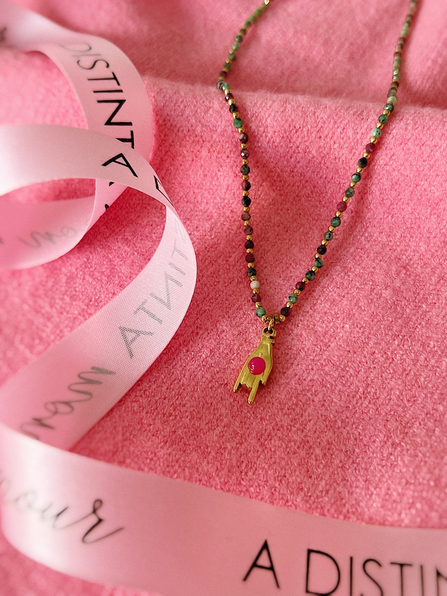 Fio em contas coloridas acrílicas e aço com pendente de Apan Mudra com pedra rosa ao centro.