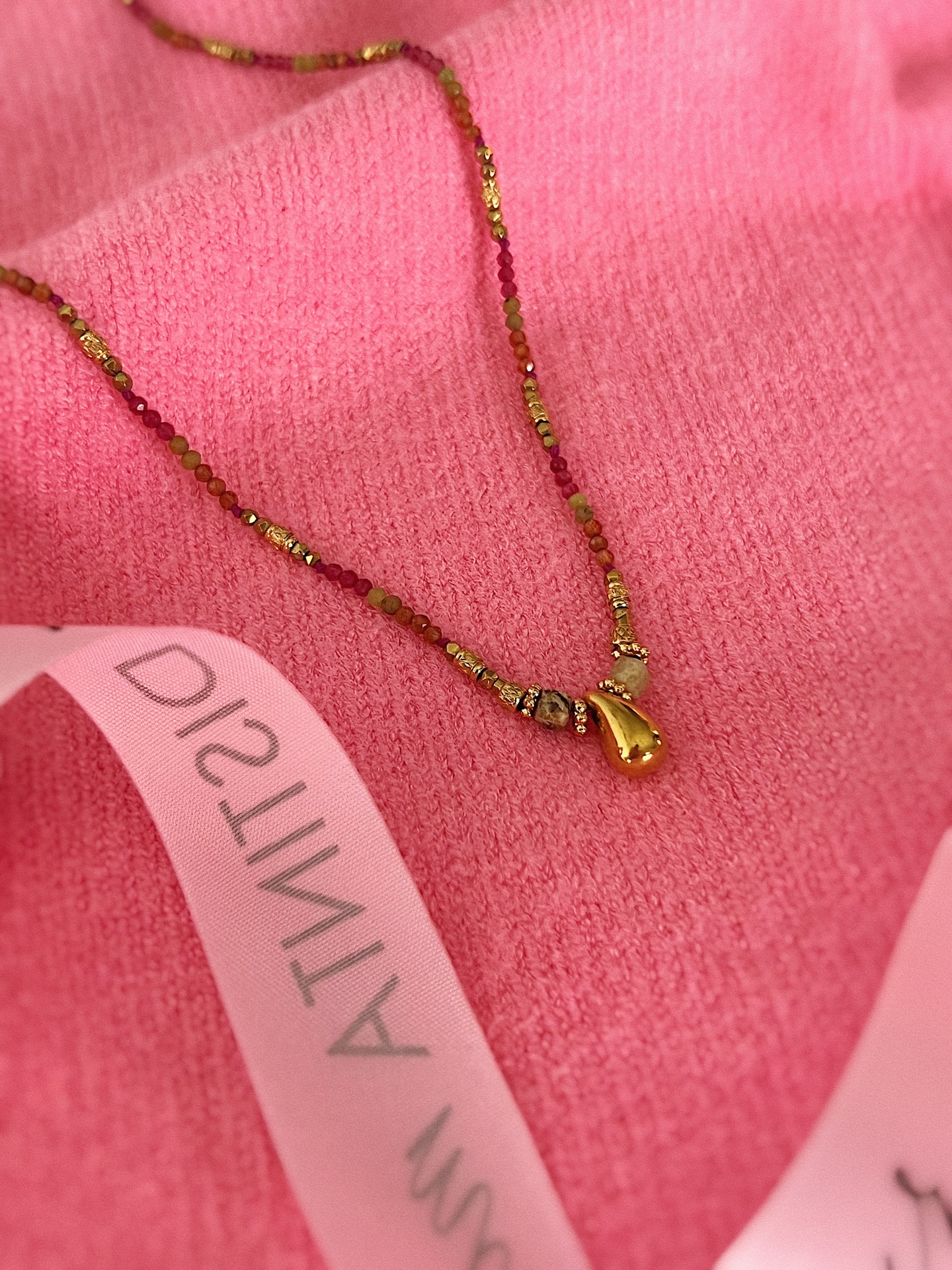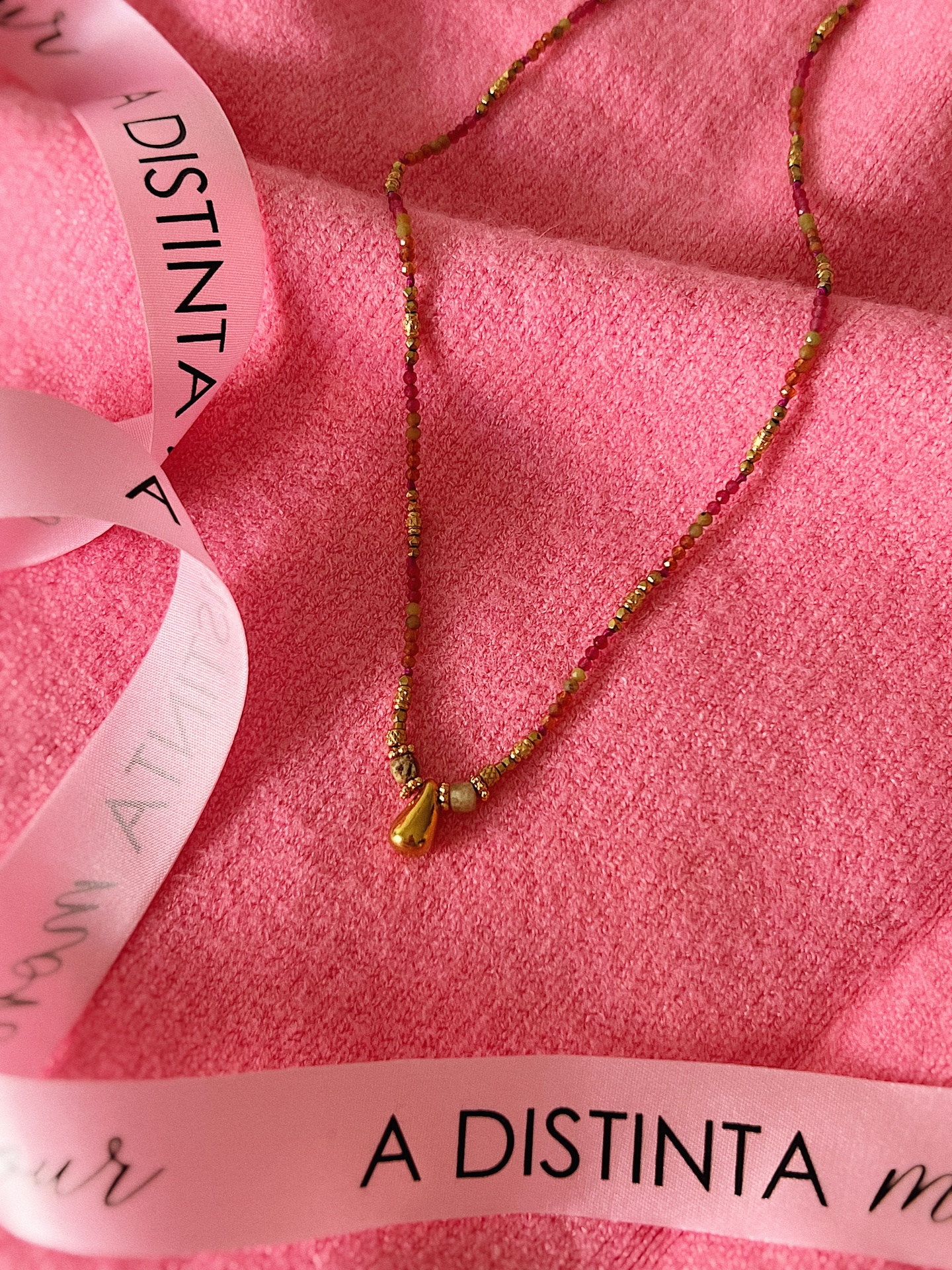 Fio de inspiração étnica com pedrinhas pequeninas coloridas e contas em aço douradas trabalhadas.