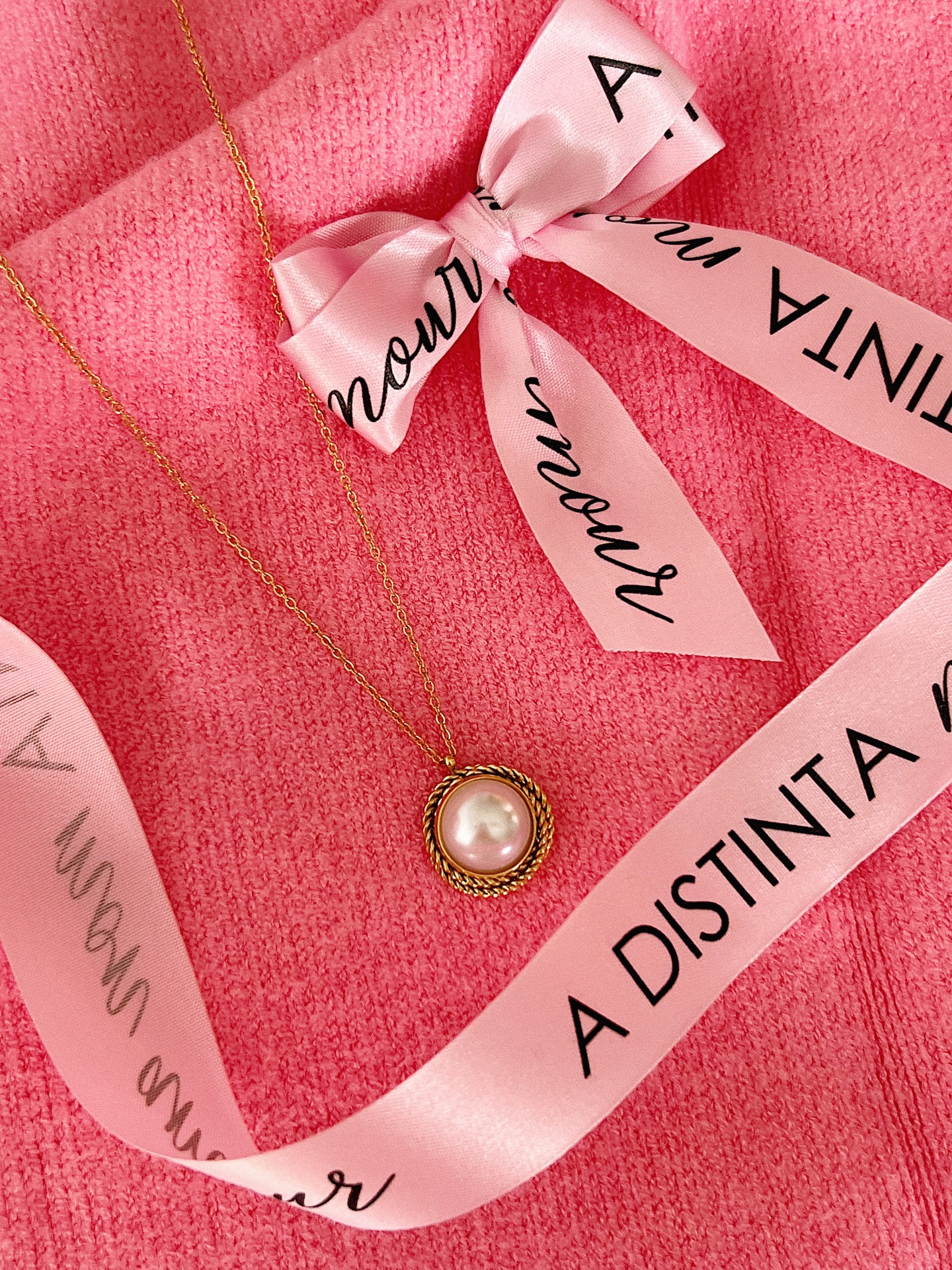 fio simples com corrente dourada e pedente com pérola e efeito entrelaçado.