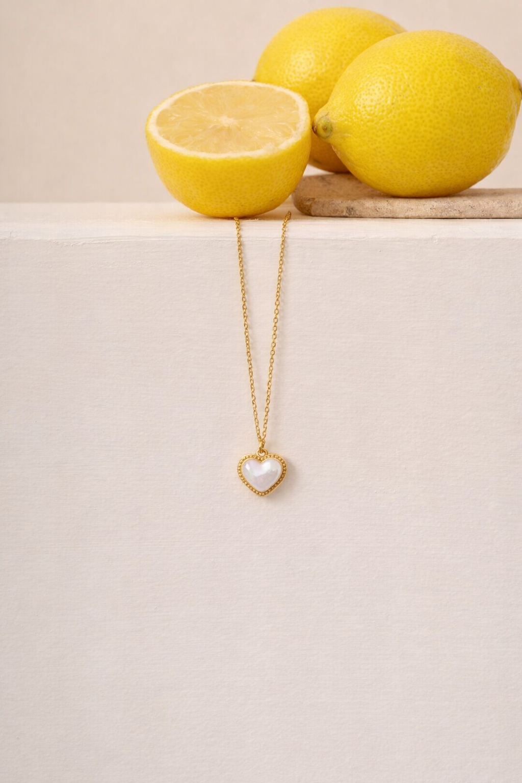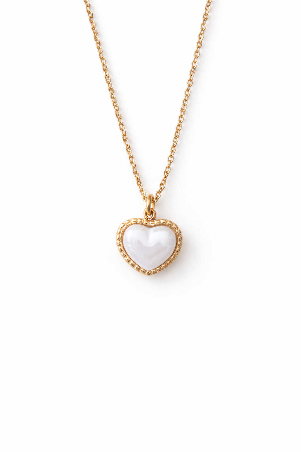 Fio em aço dourado com corrente tradicional e pendente de coração pequenino com pérola.