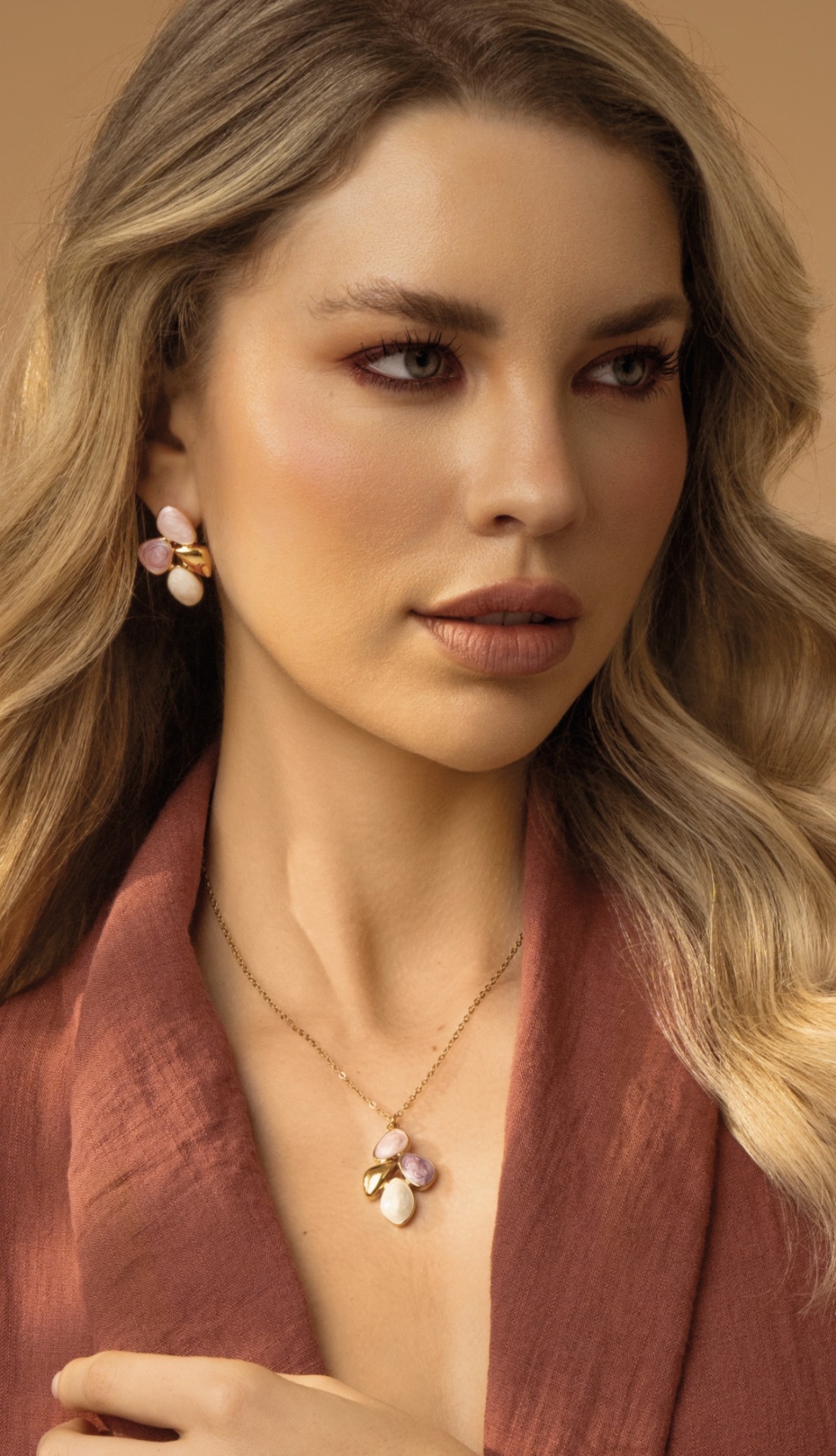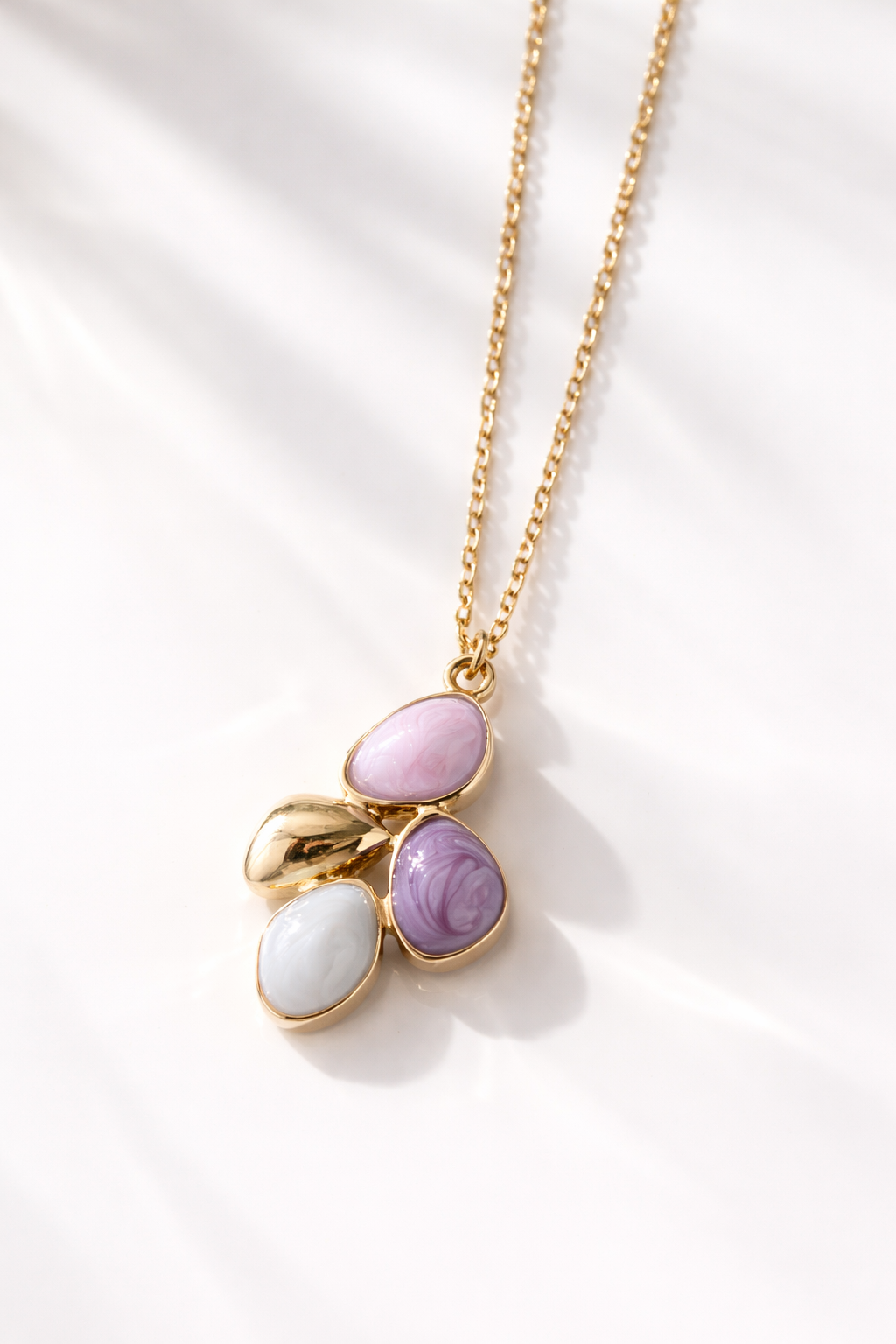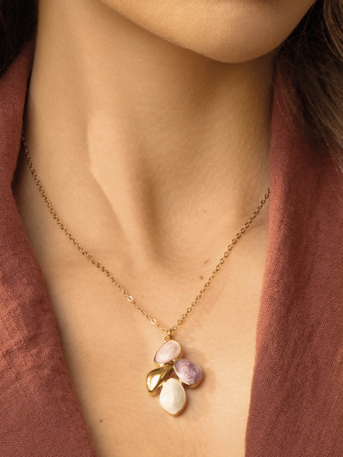 Fio em aço dourado com corrente tradicional com pendente original em tons de rosa.