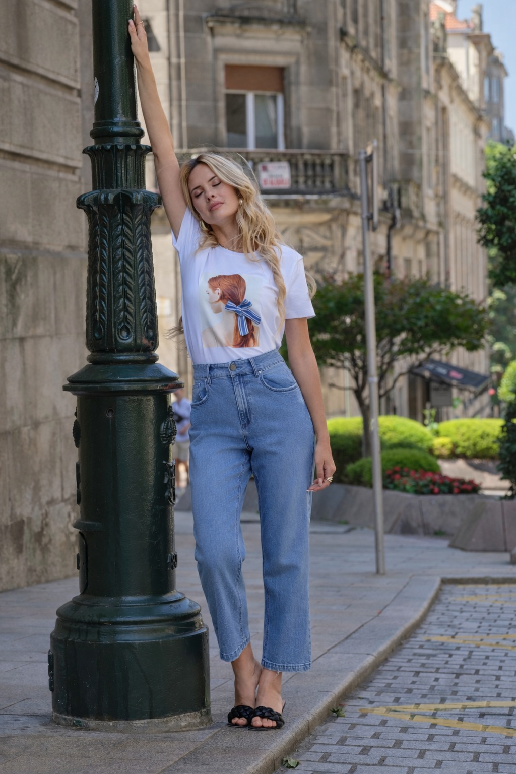 Jeans de perna a direito com lavagem média em modelo cropped.