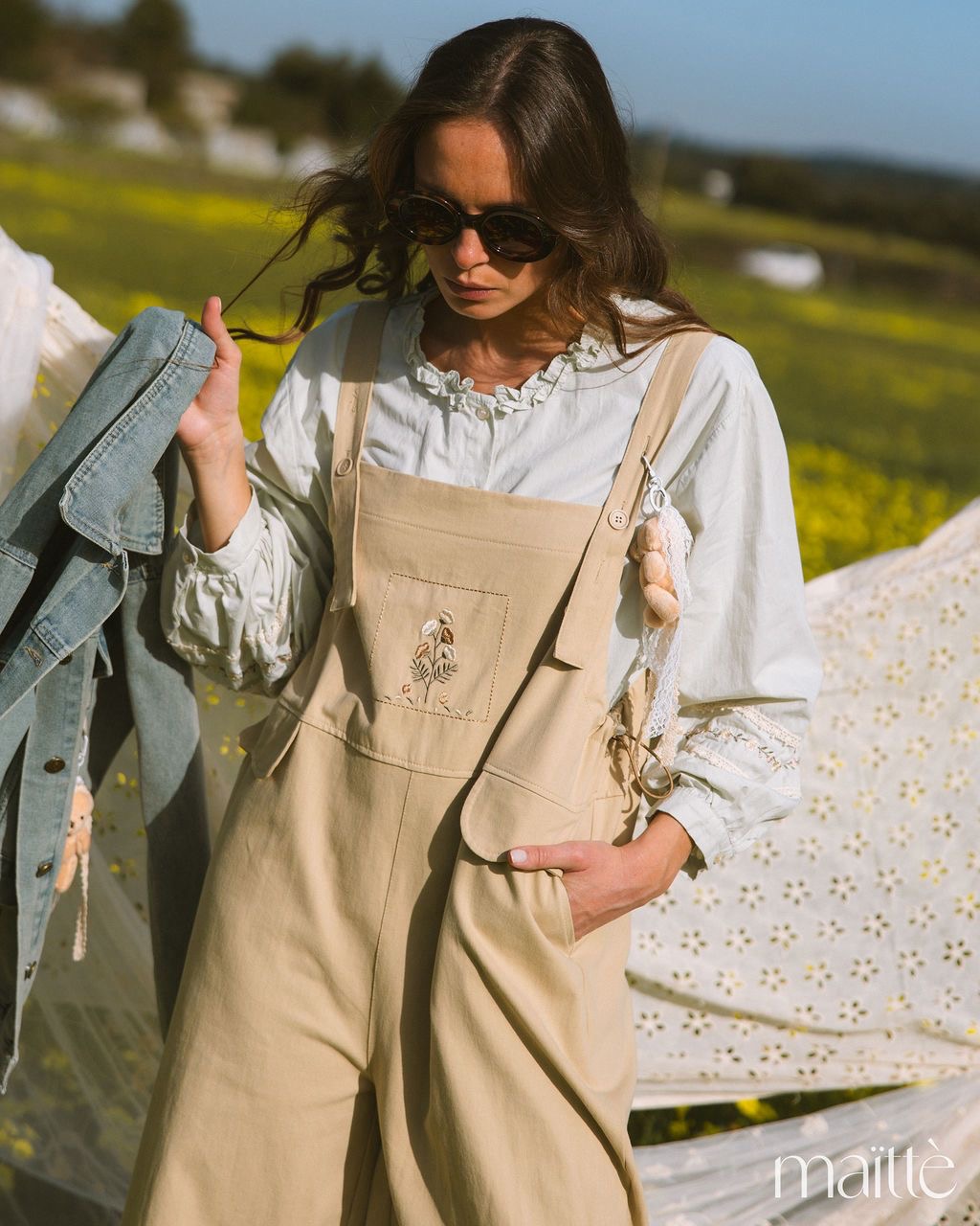 Bolso na zona do peito com flores bordadas. Bolsos italianos funcionais.
