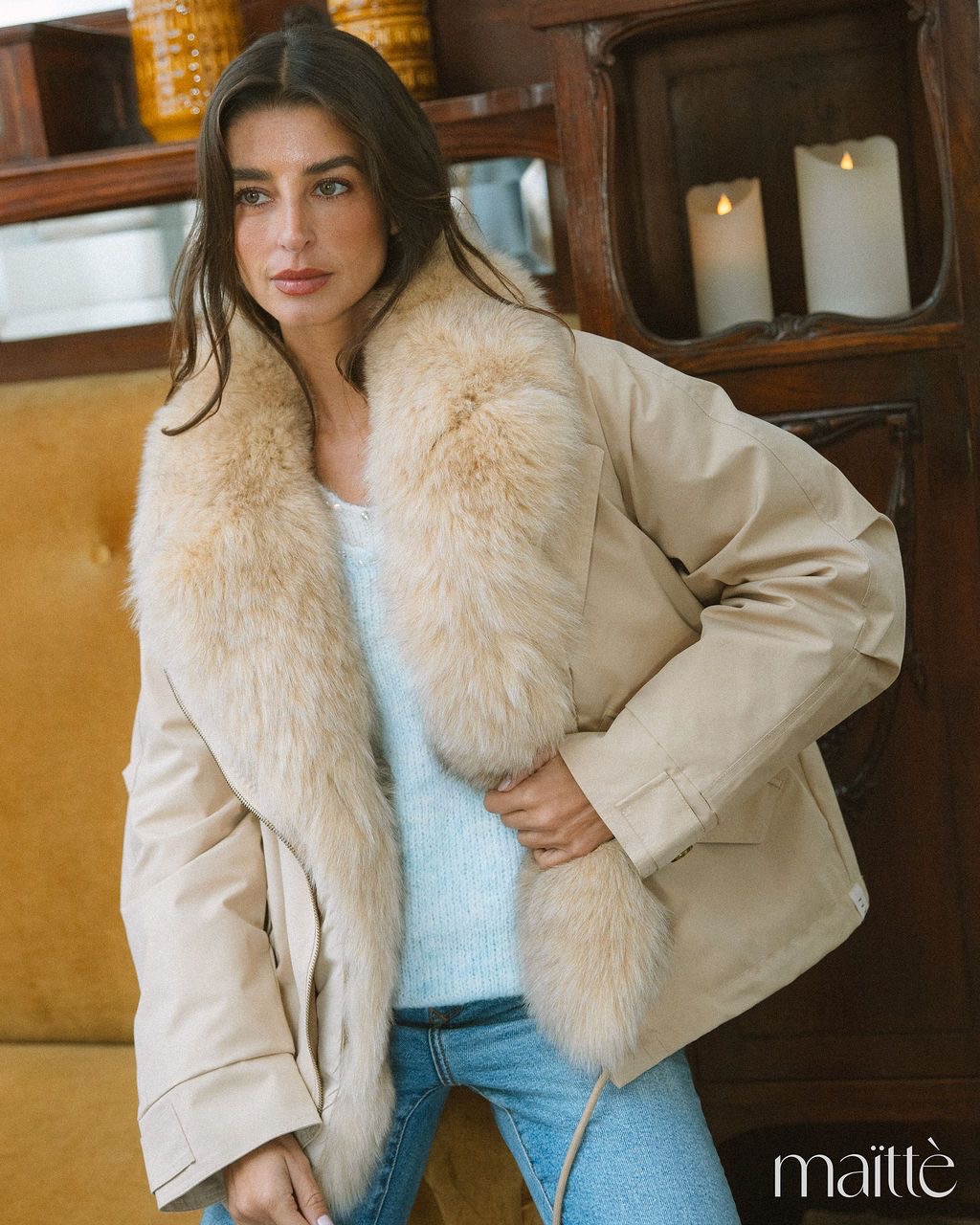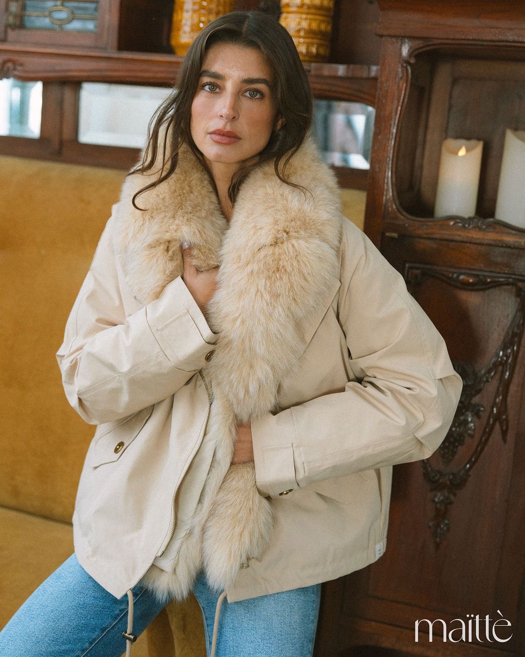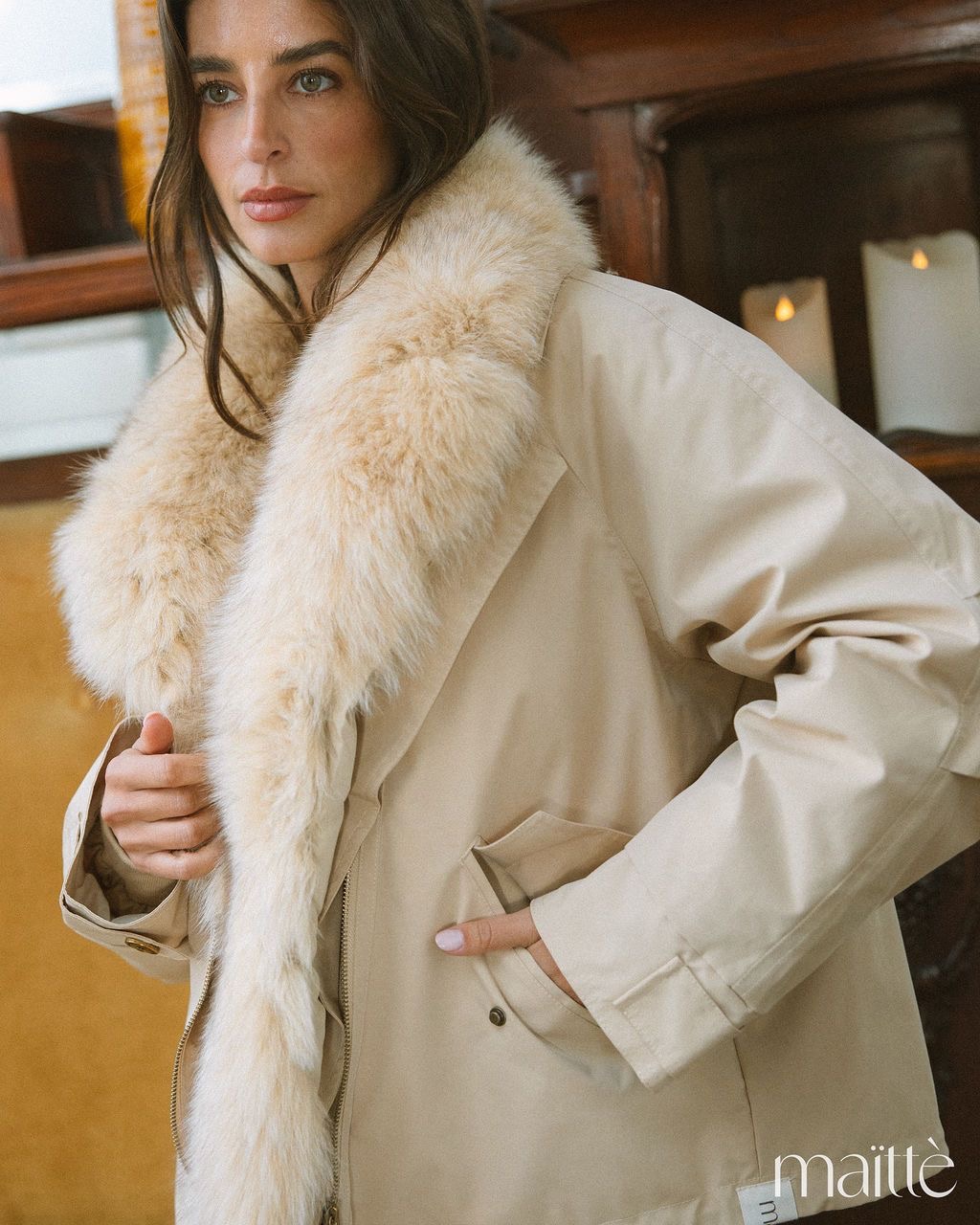 Pêlo creme (sintético e muito macio) amovível. Bolsos funcionais.