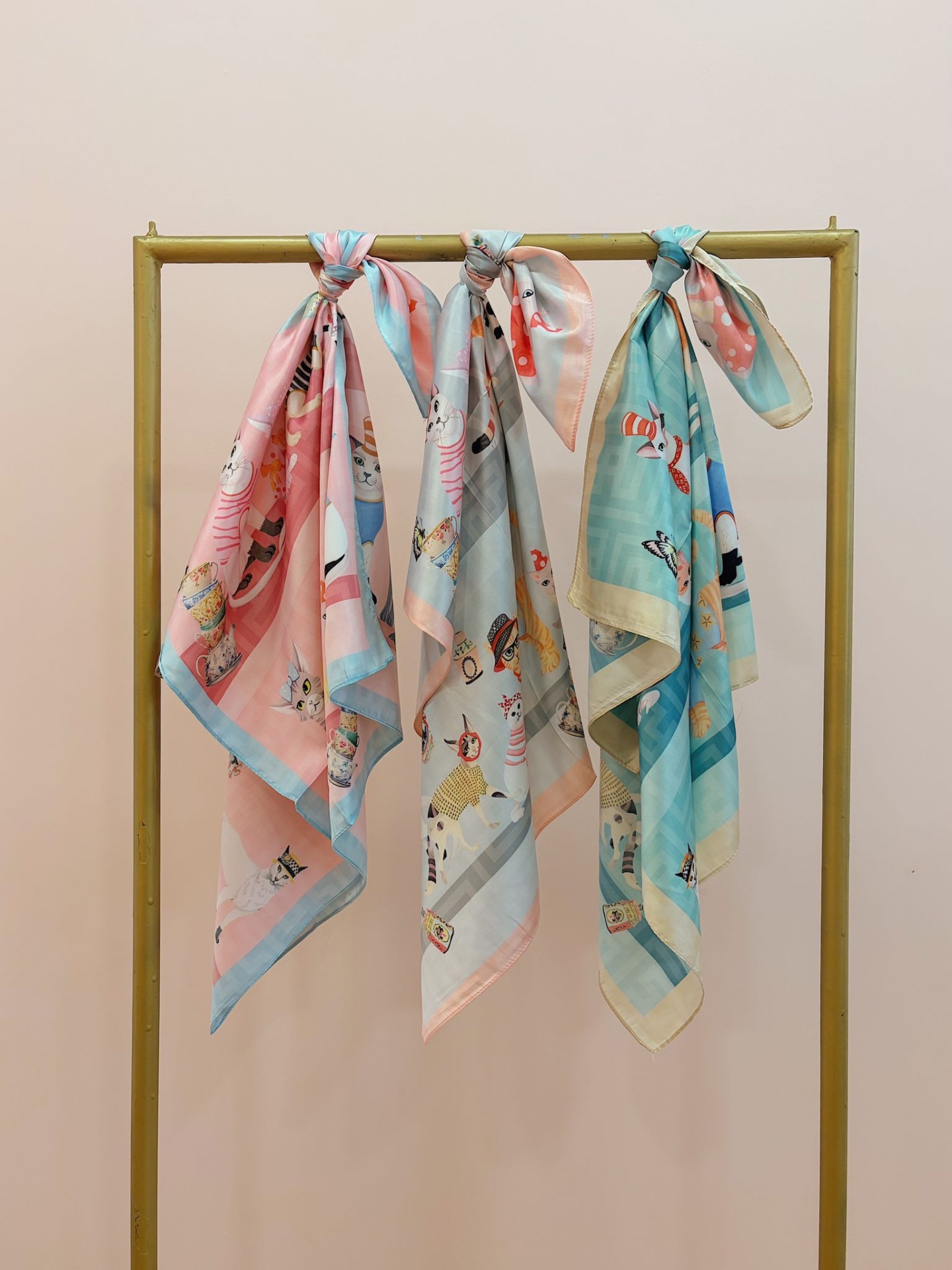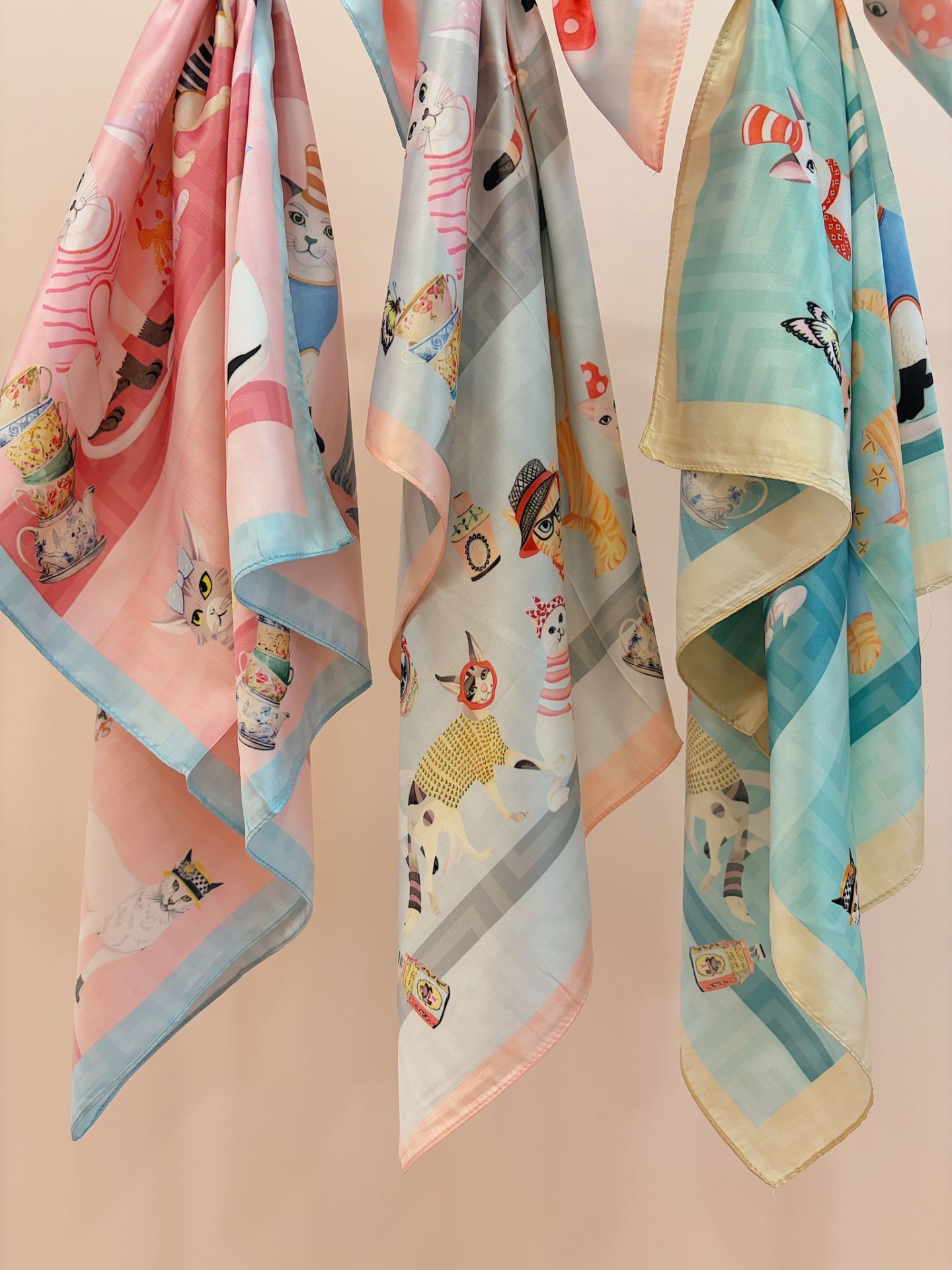 Lenço sedoso, quadrado, com padrão colorido e original com gatinhos divertidos.