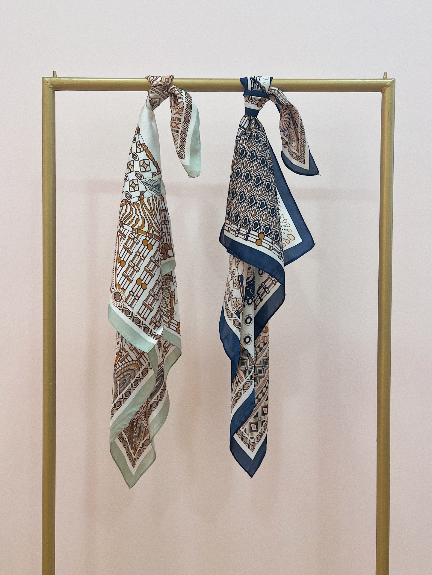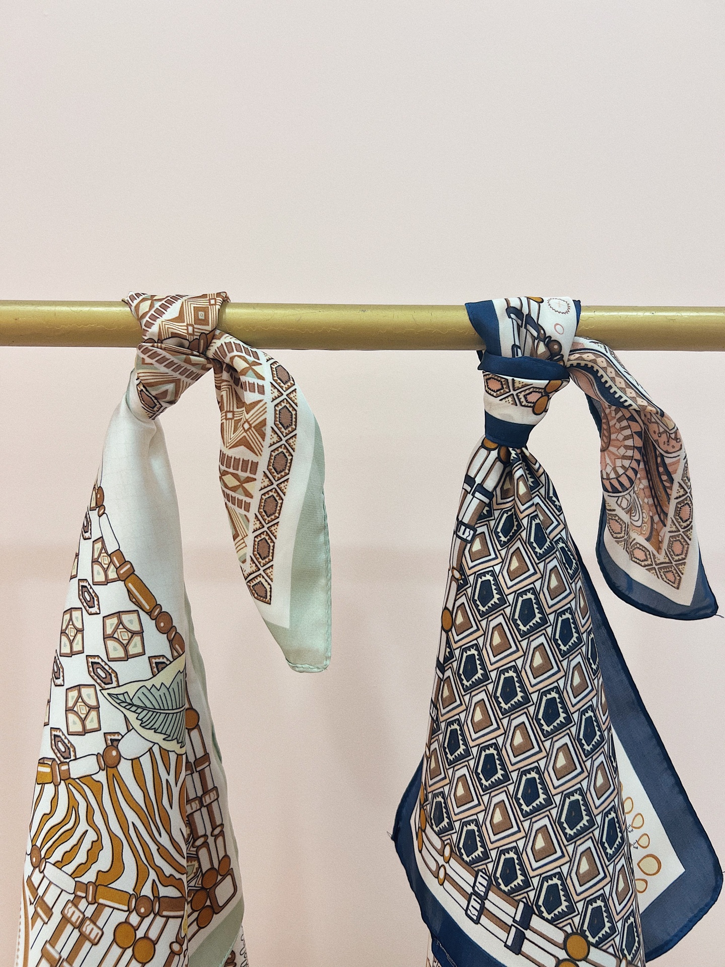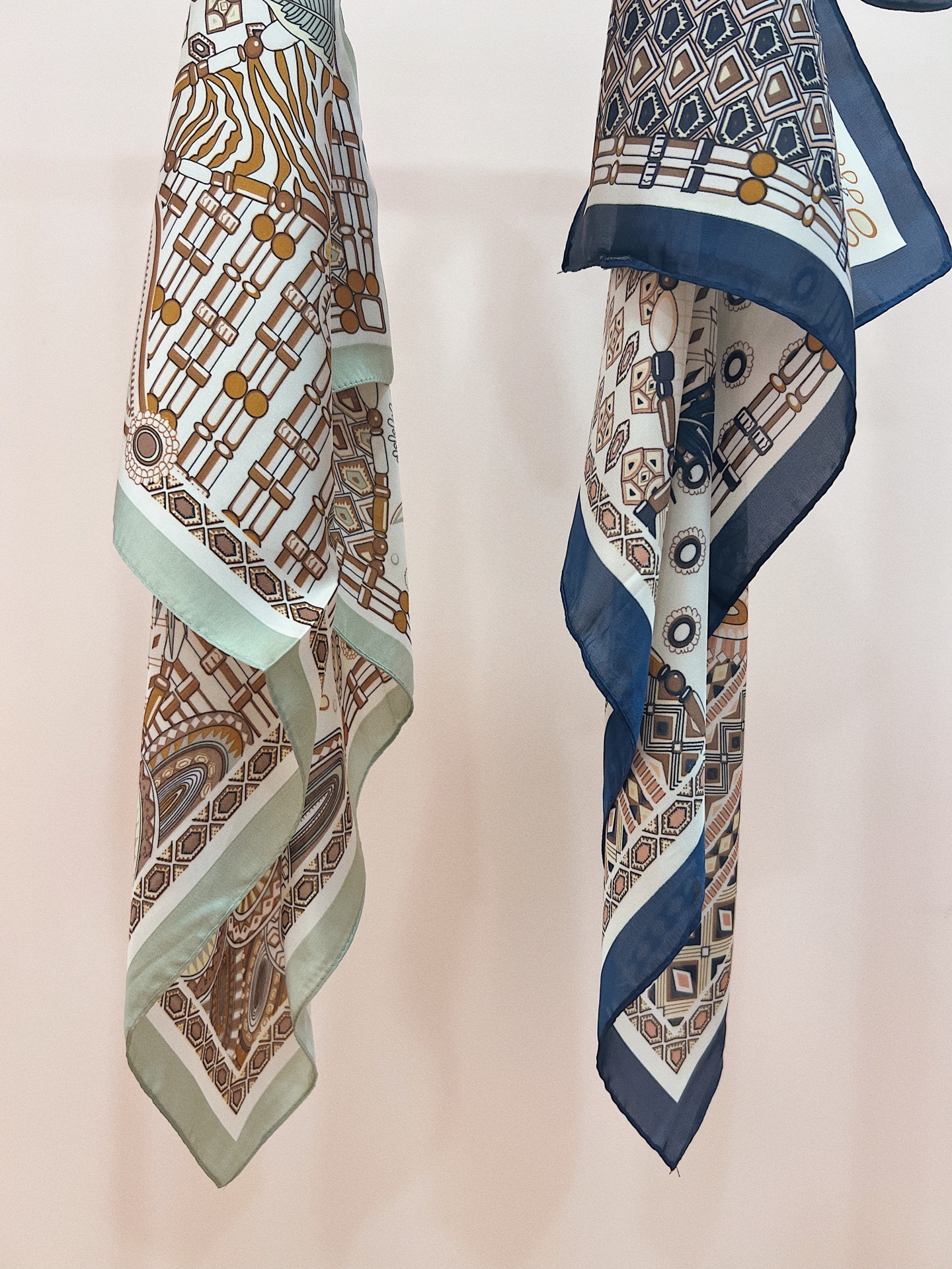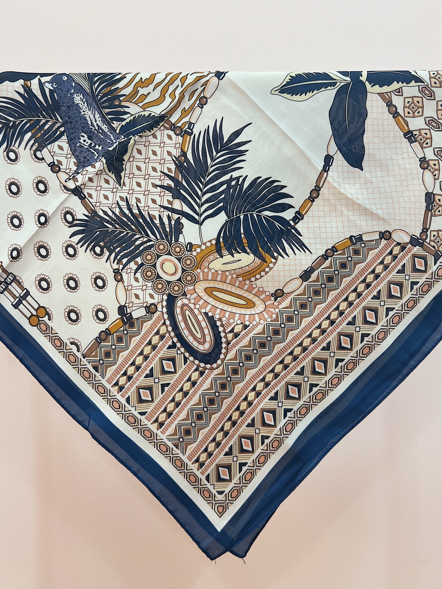 Lenço sedoso, quadrado, com padrão exótico com palmeiras e animal print.