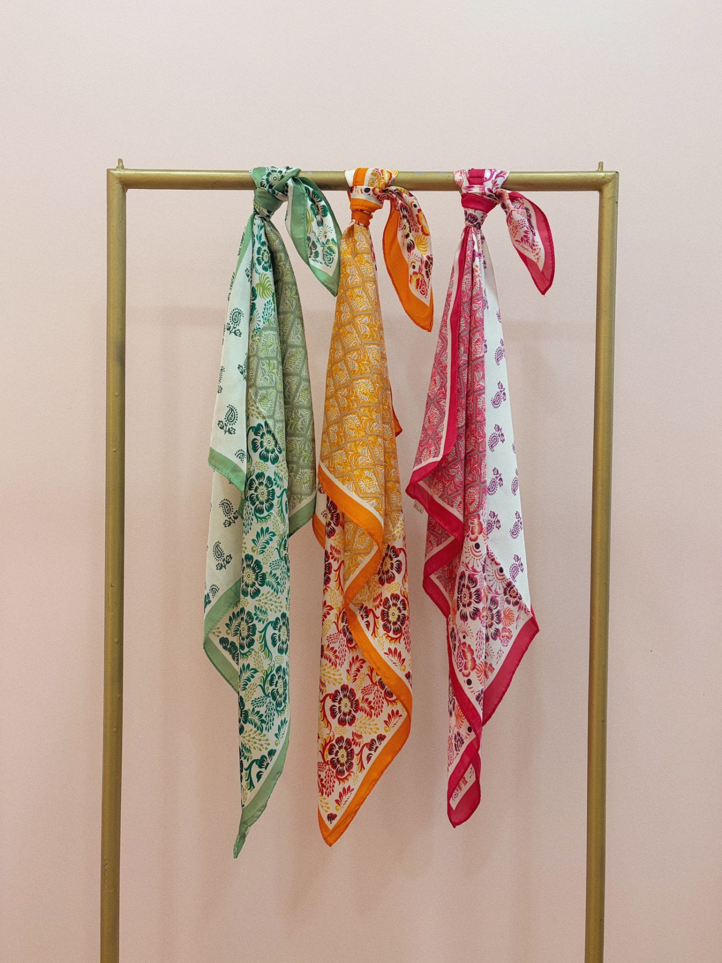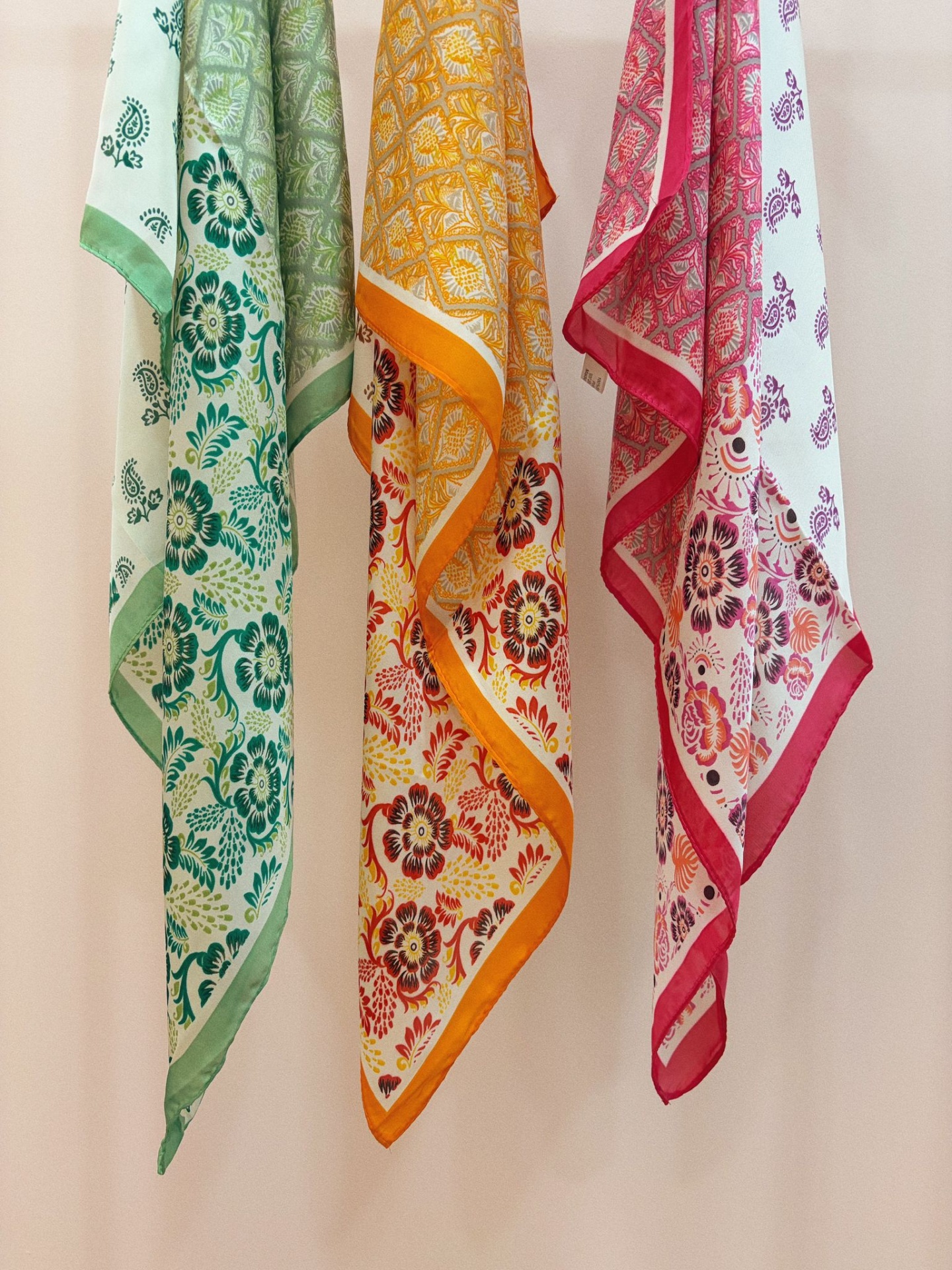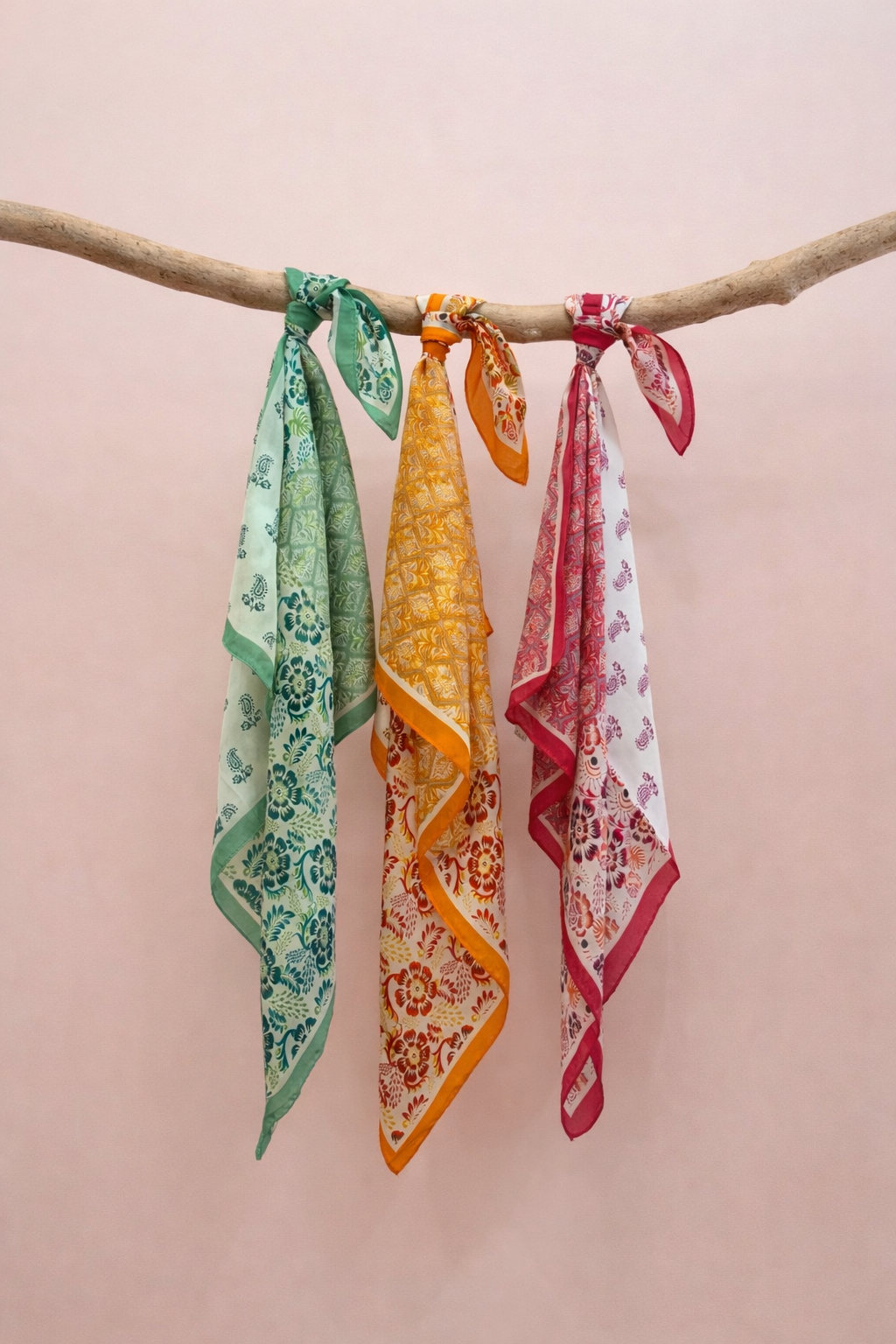 Lenço sedoso, quadrado, com efeito de quatro padrões distintos de inspiração bohemia.