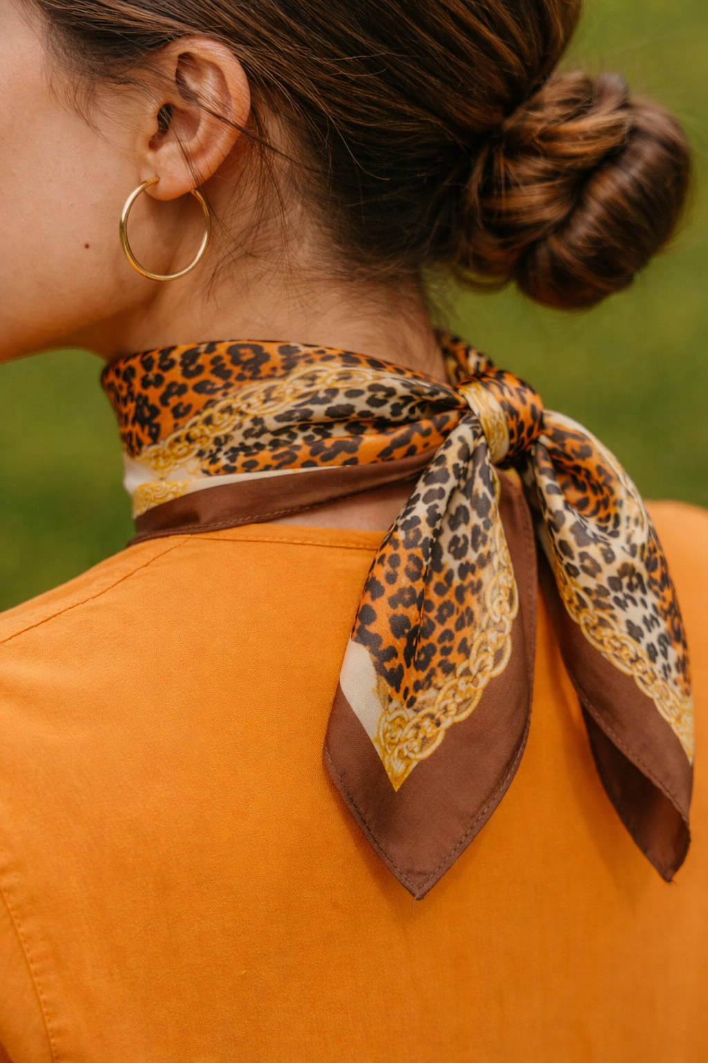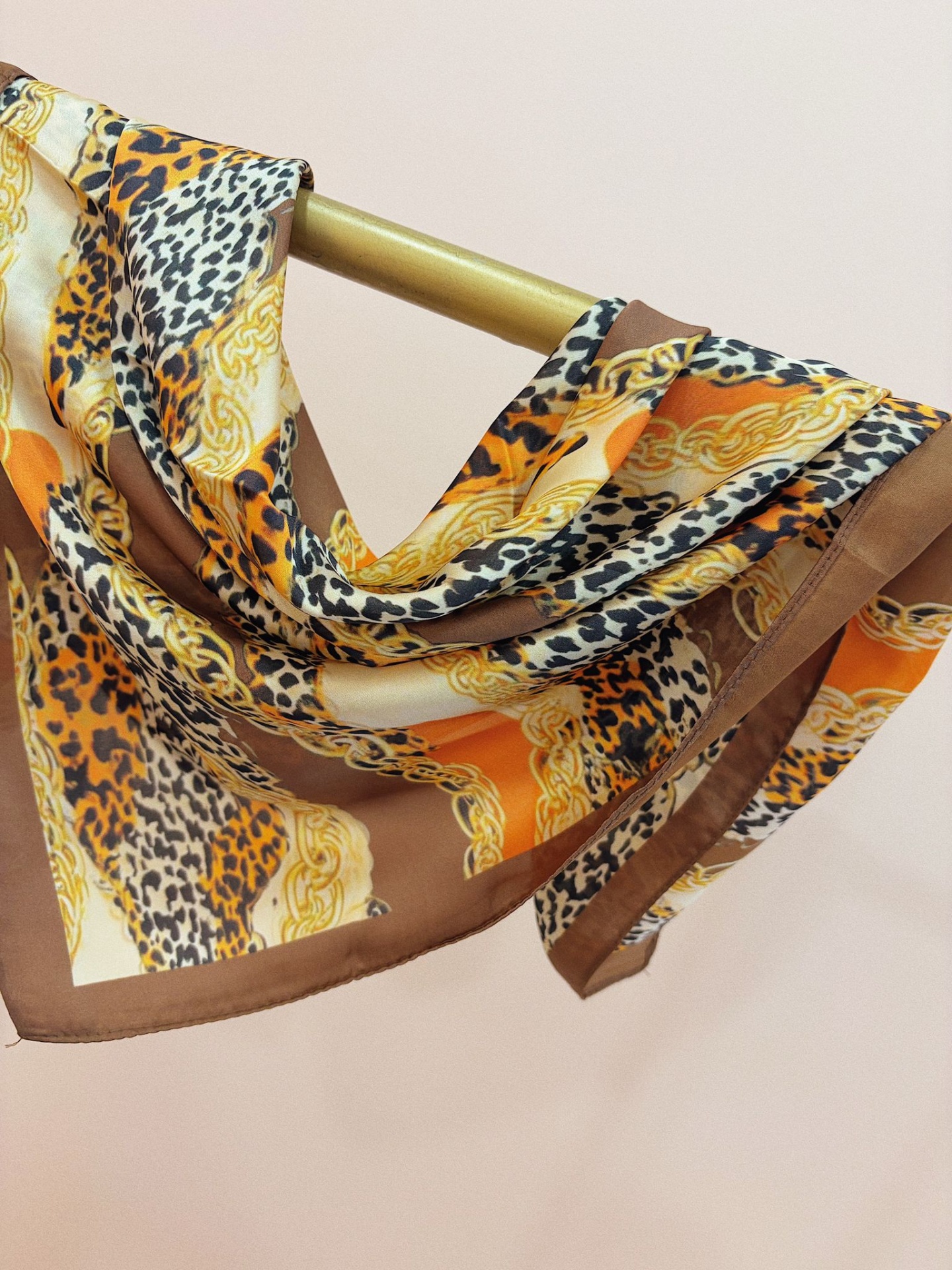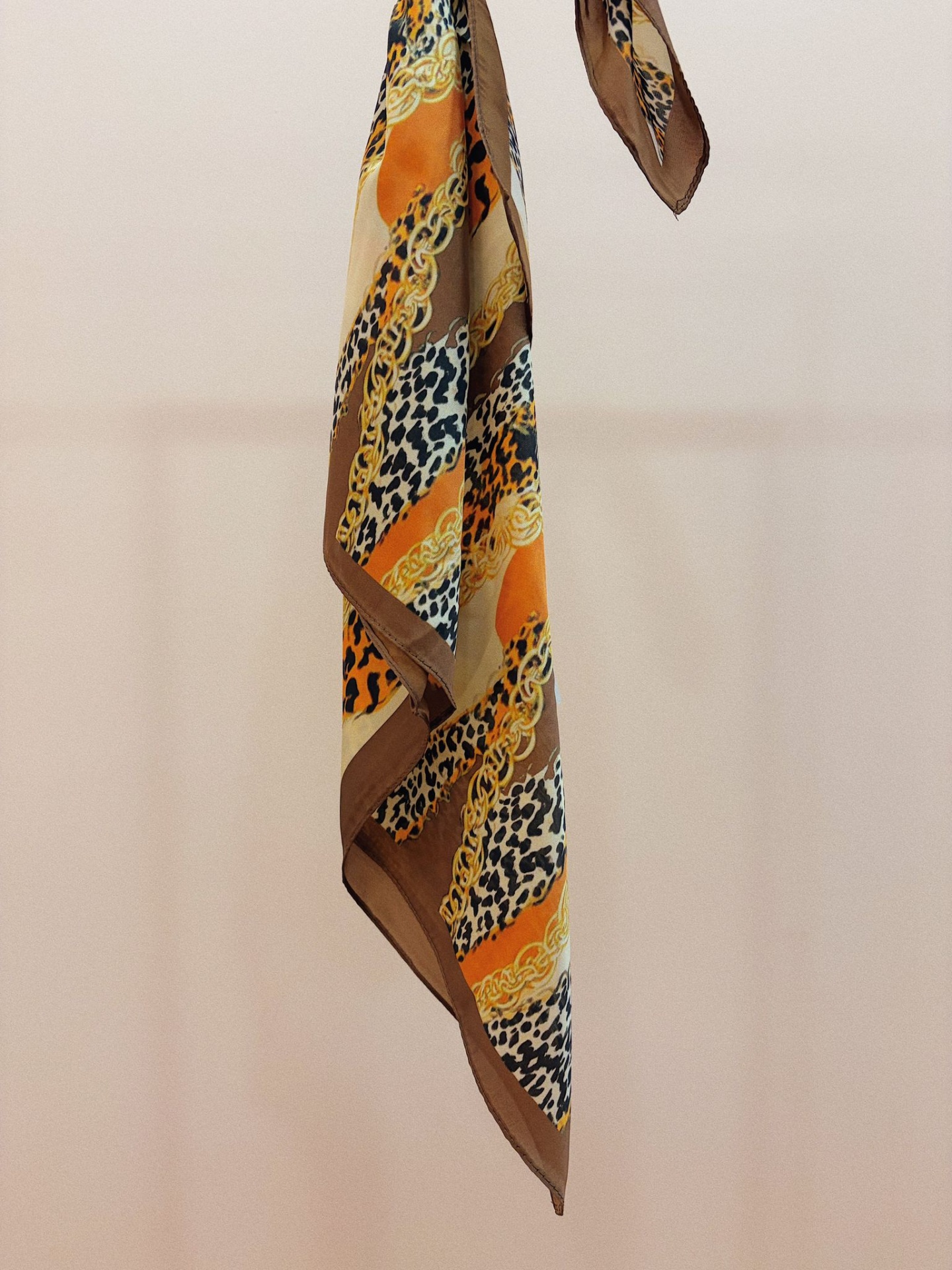 Lenço sedoso, quadrado, com efeito animal print em vários tons e correntes douradas.