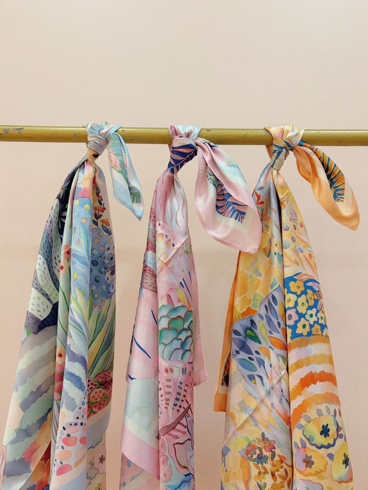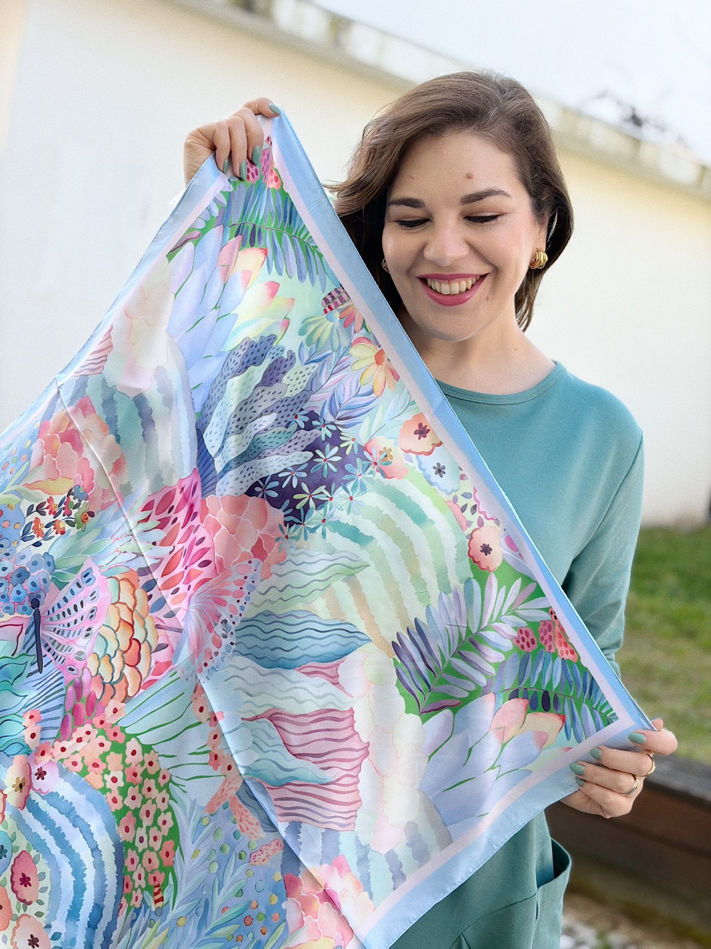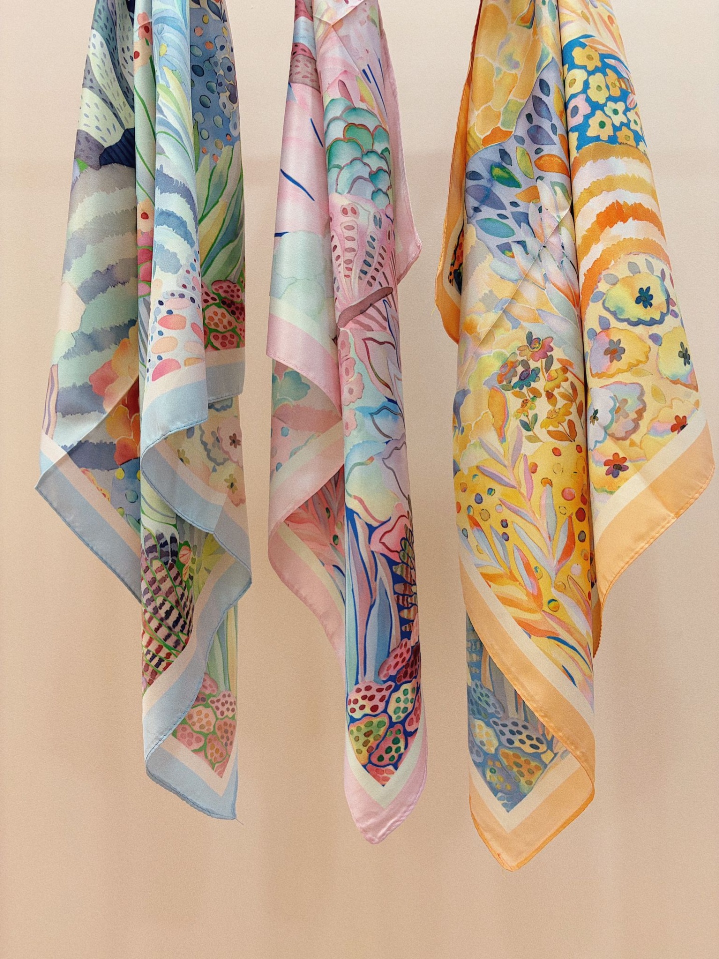 Lenço sedoso, quadrado, com padrão floral tropical abstracto com cores variadas.