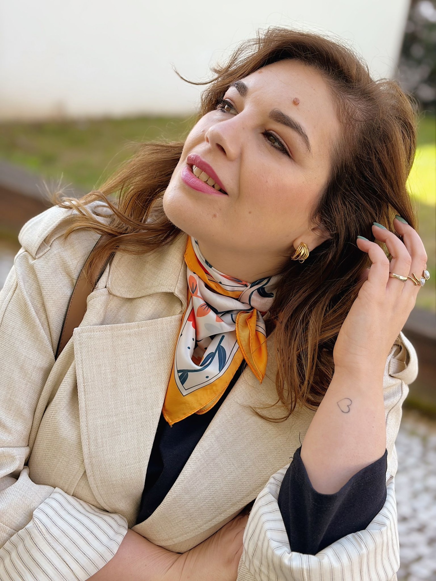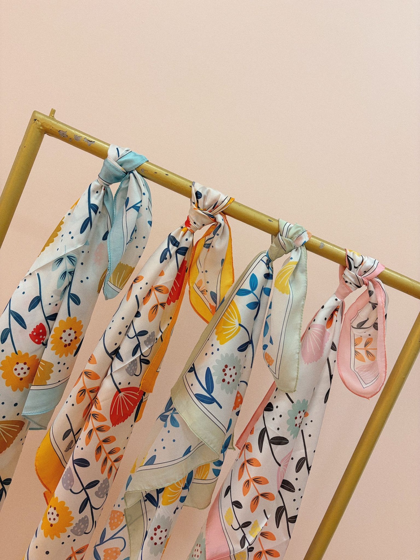 Lenço sedoso, quadrado, com padrão floral e bolinhas.