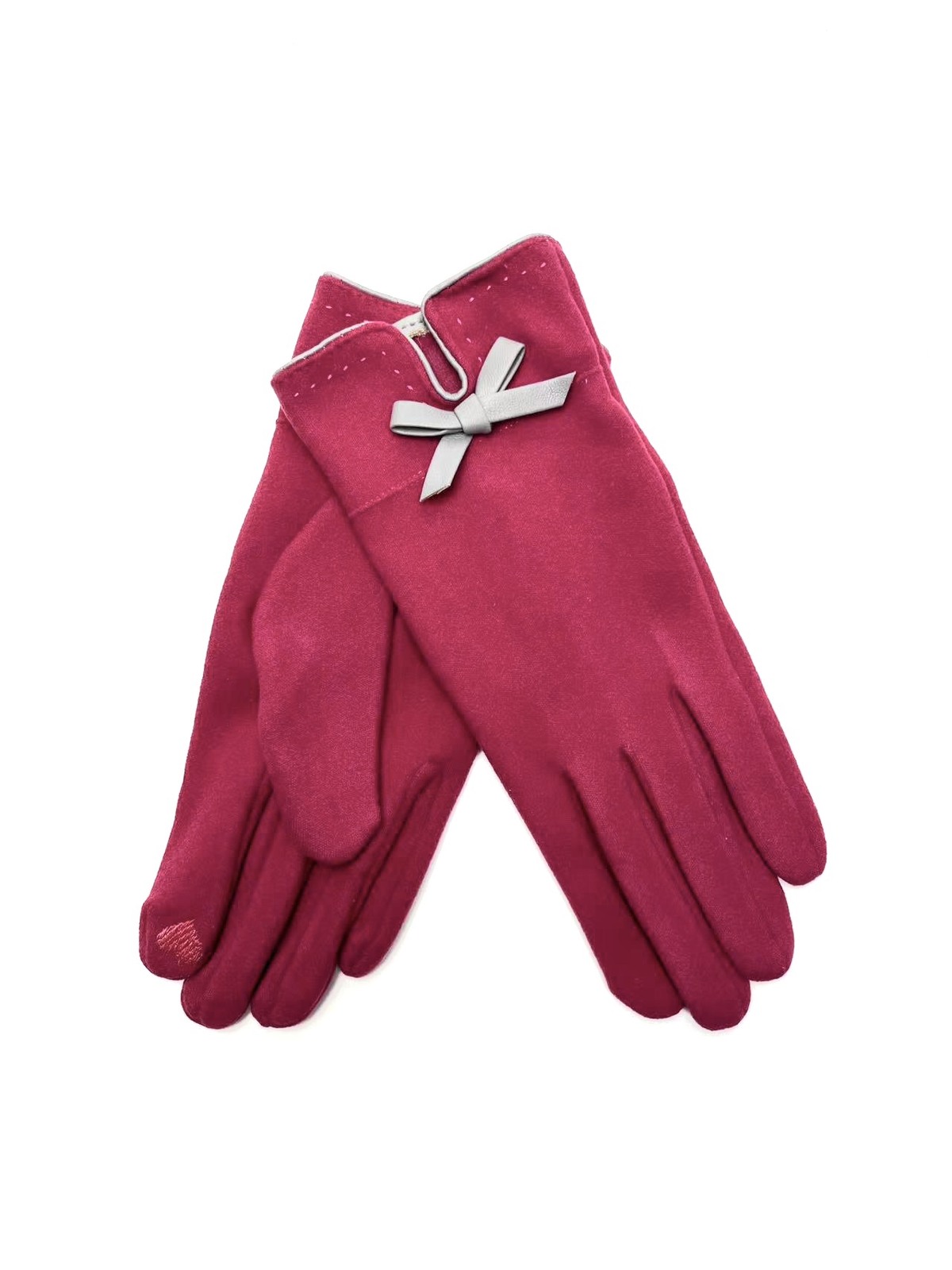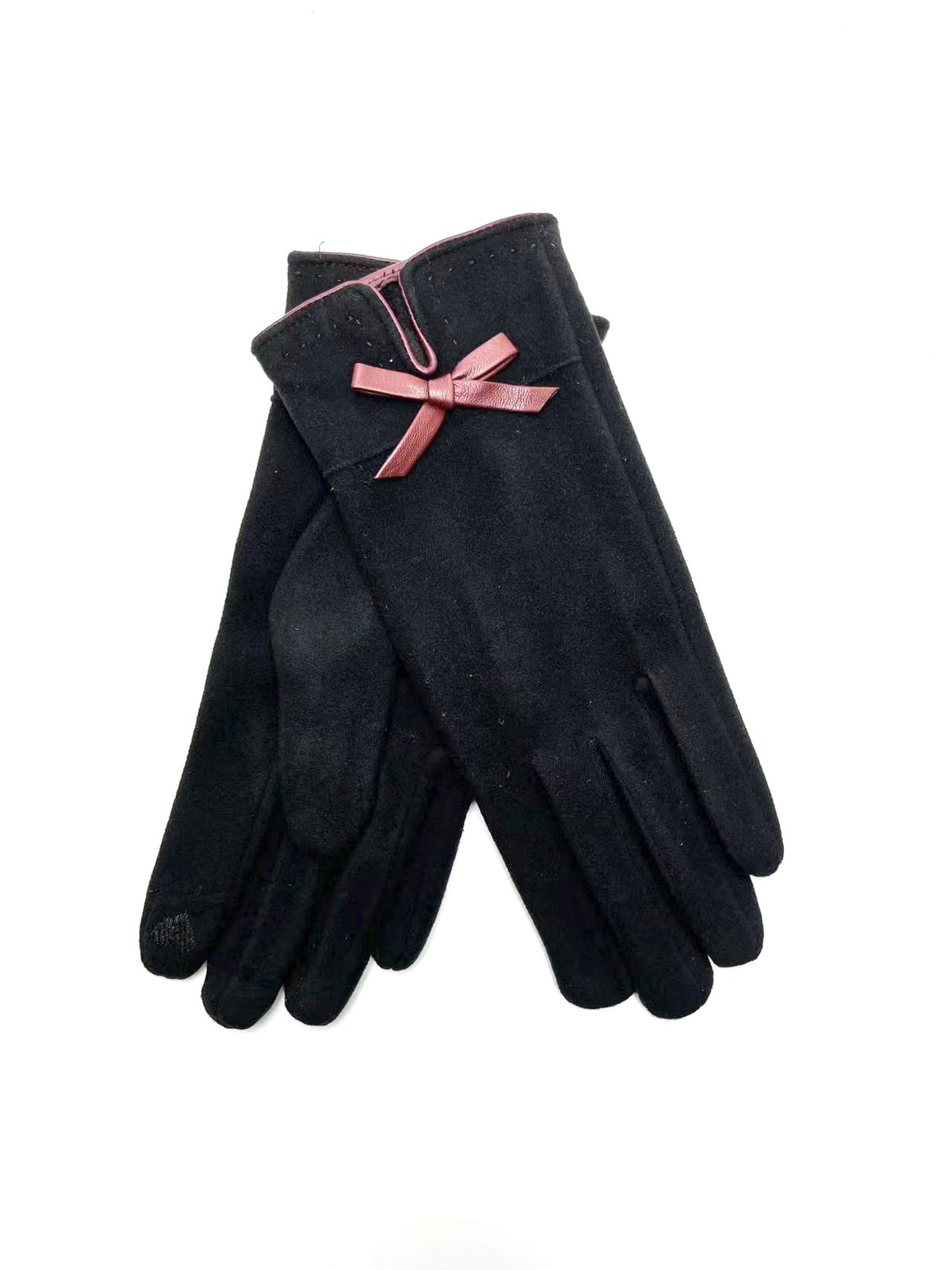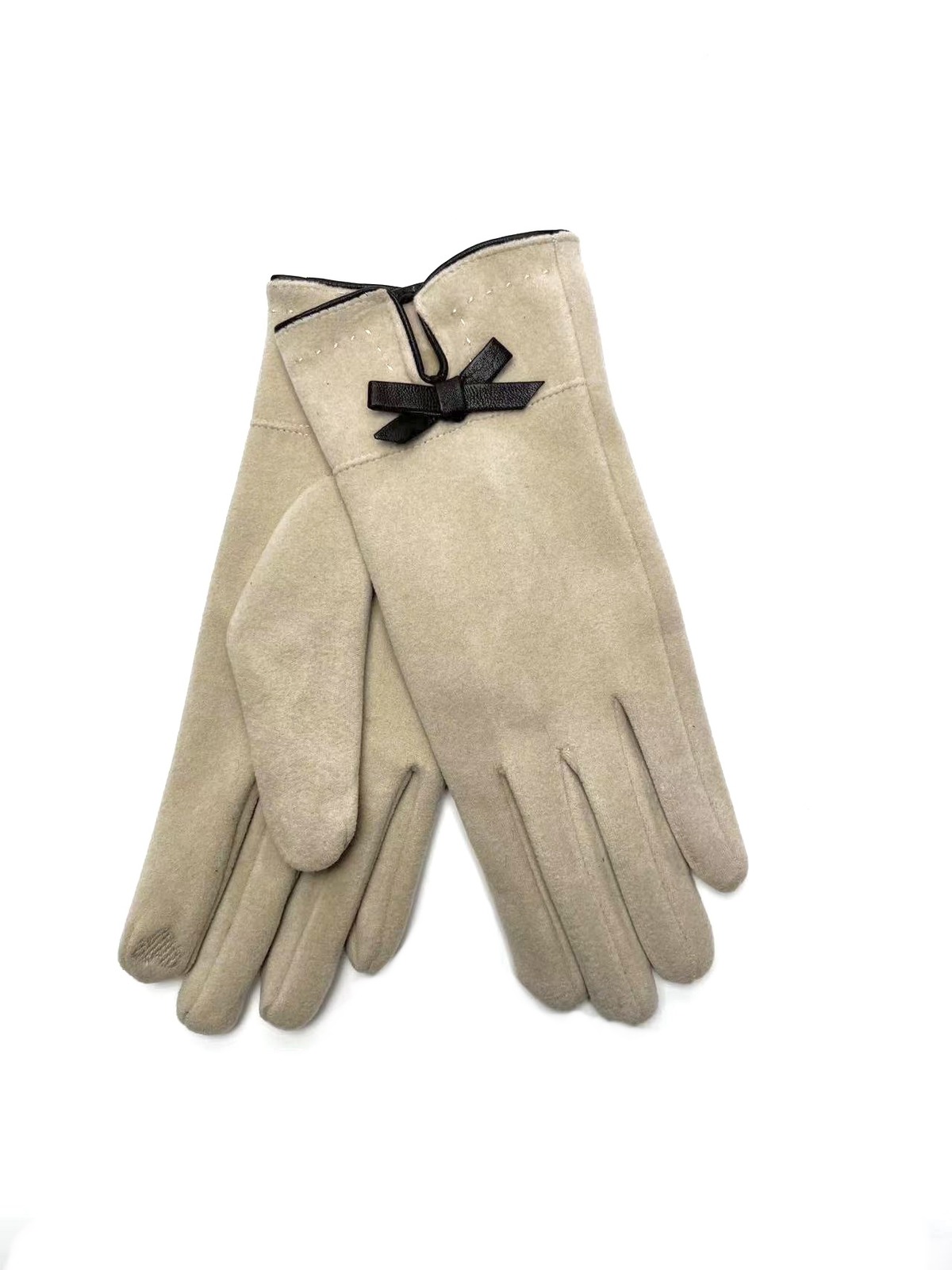 Luvas quentinhas estilo camurcina com corte tradicional com debrum e laço decorativo em pele sintética. Interior com pêlinho.