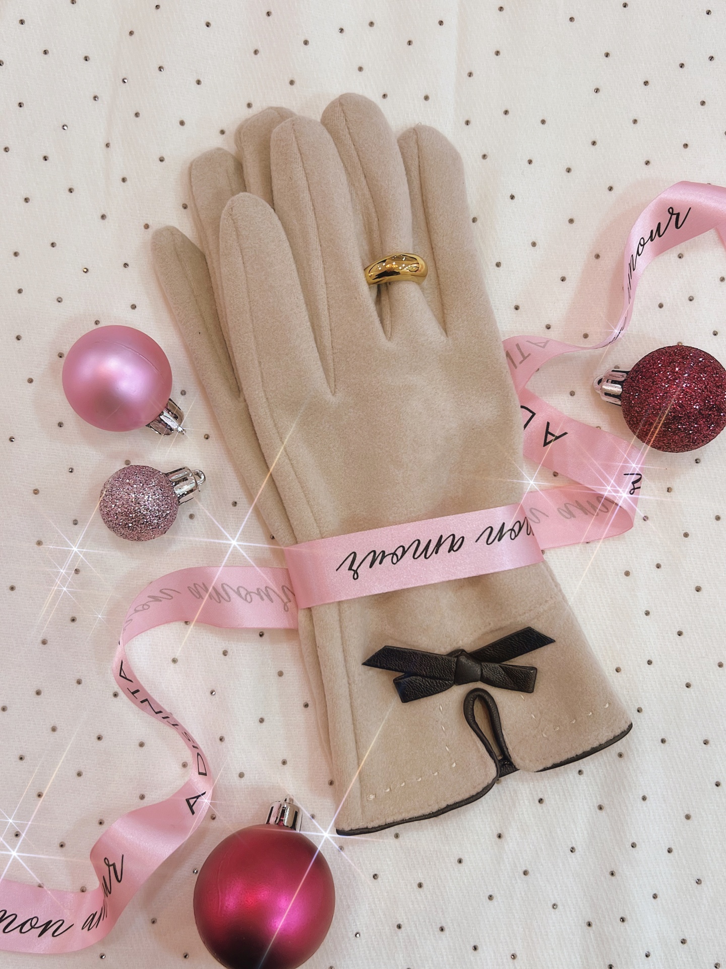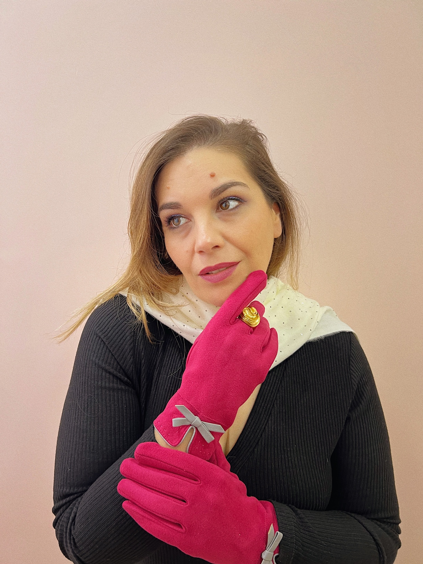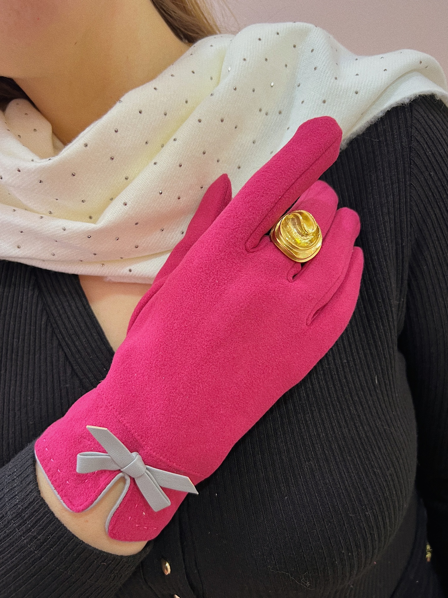 Luvas quentinhas estilo camurcina com corte tradicional com debrum e laço decorativo em pele sintética. Interior com pêlinho.
