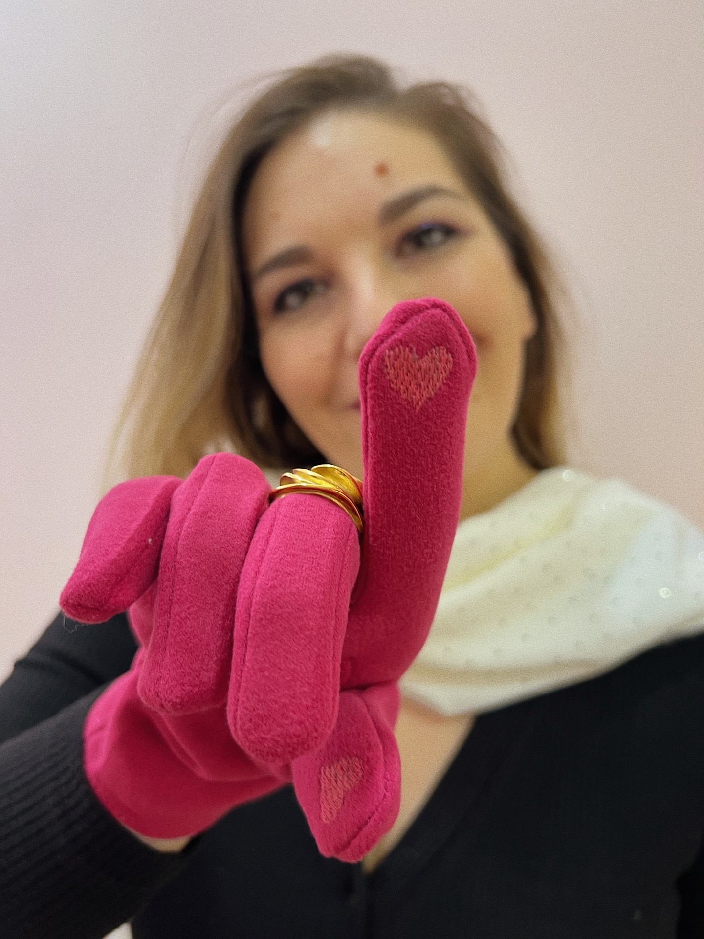 Efeito Touchscreen no dedo indicador com coração bordado.