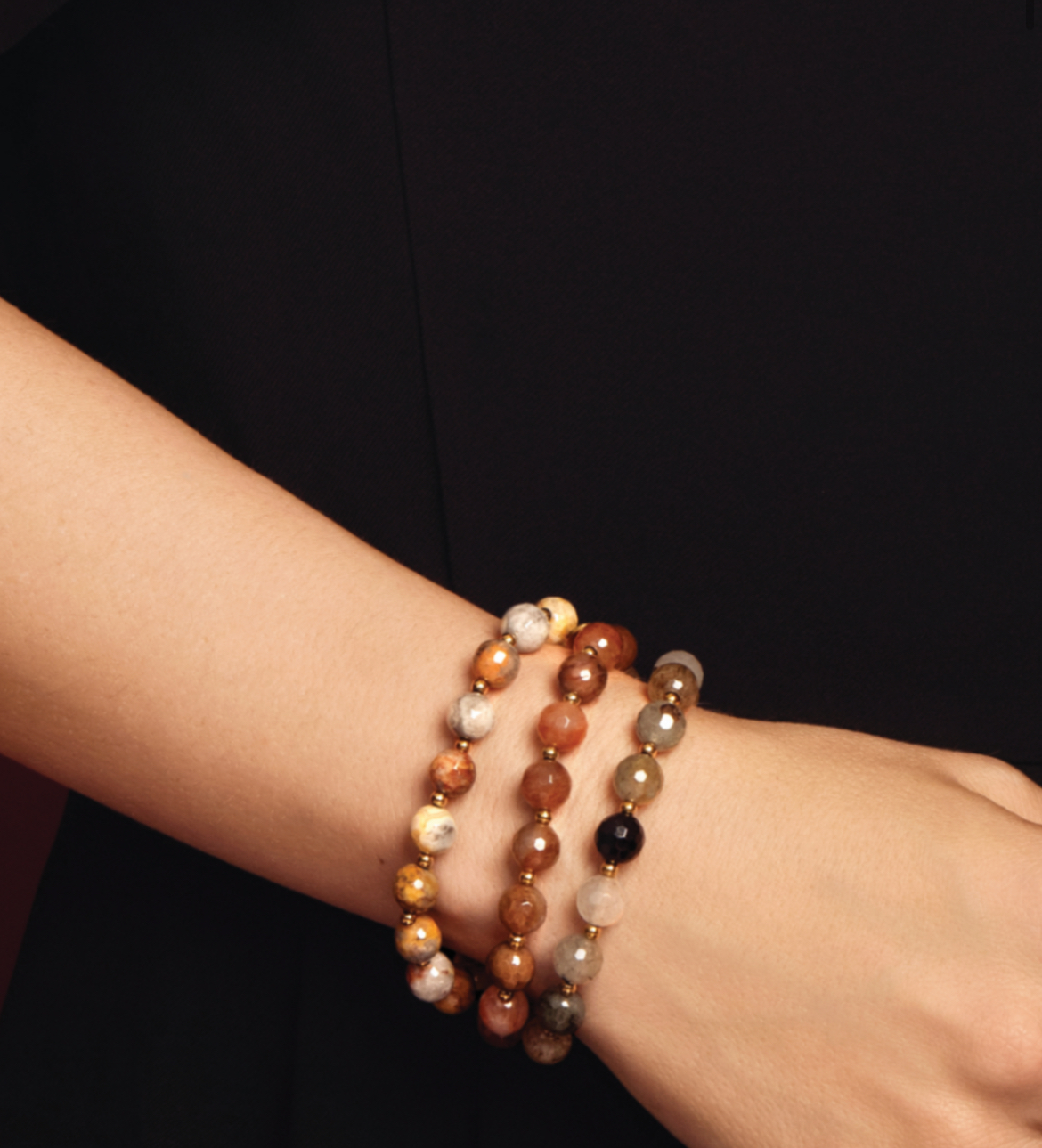 Pulseiras com contas em Pedra natural e mini-contas em aço dourado.