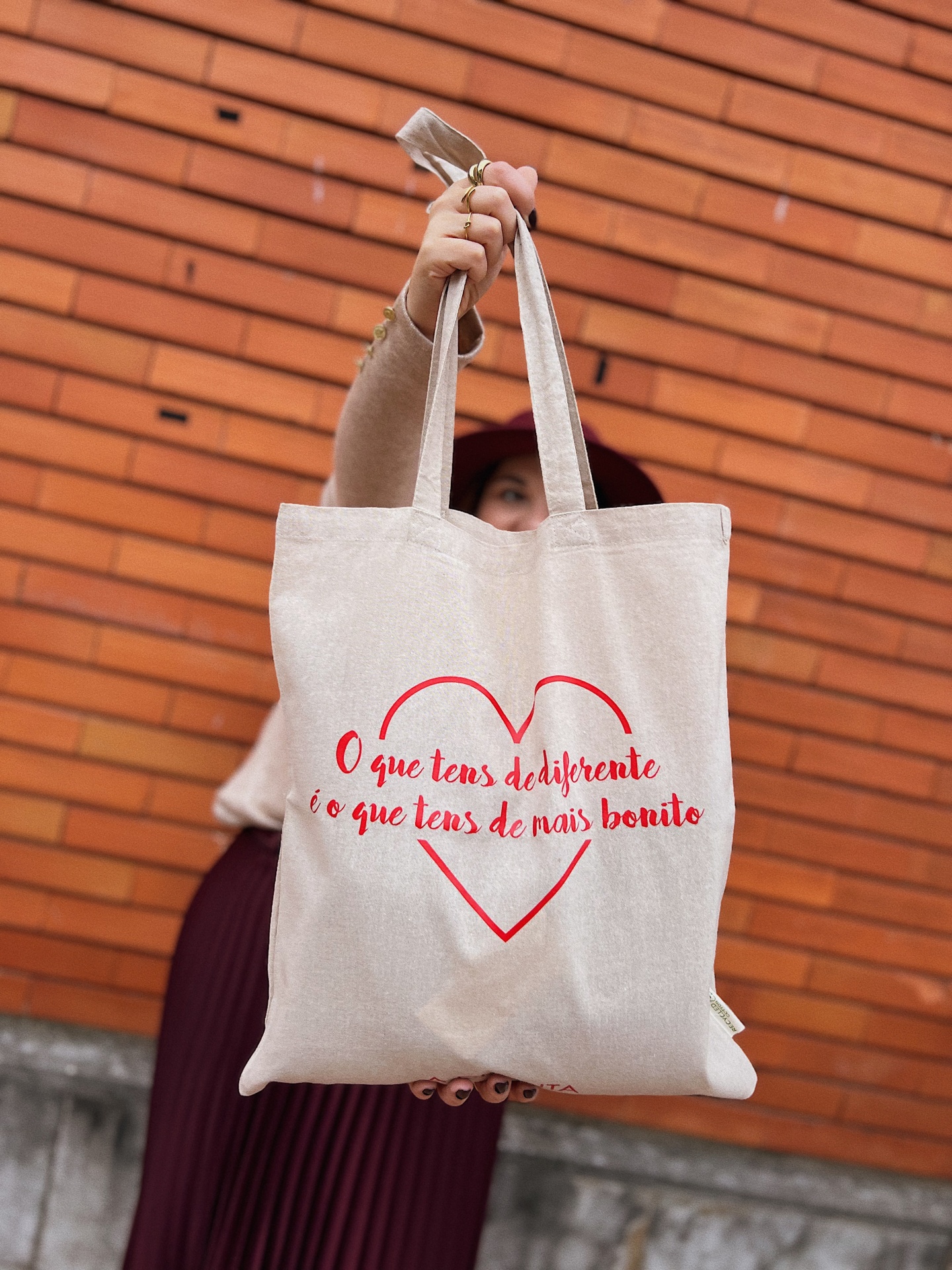 Em pano crú, feito de algodão reciclado, com as dimensões certas: 38cm x 42cm e duas alças grandes para conseguires transportar tudo, tudo aquilo que te apetecer de forma bem distinta.