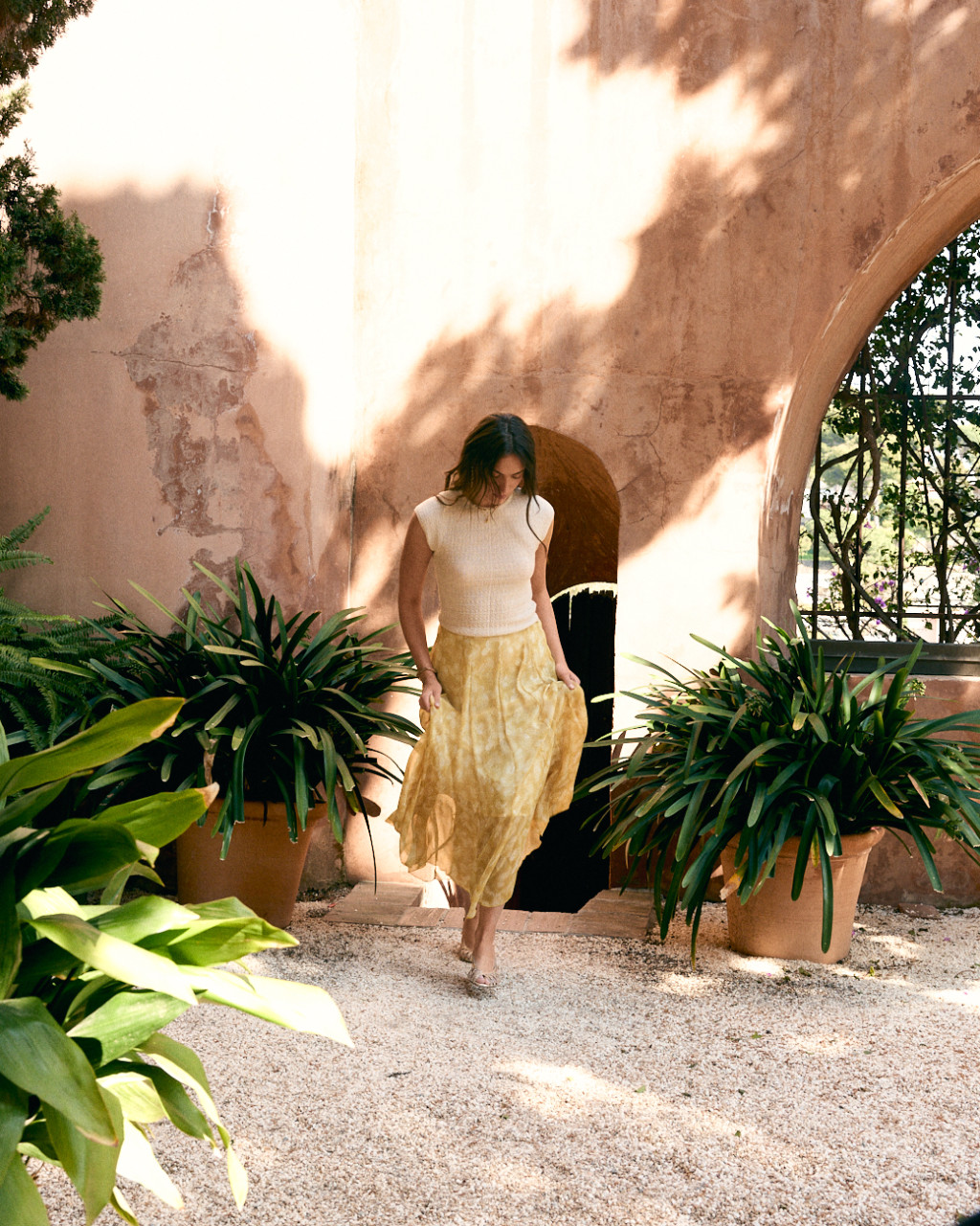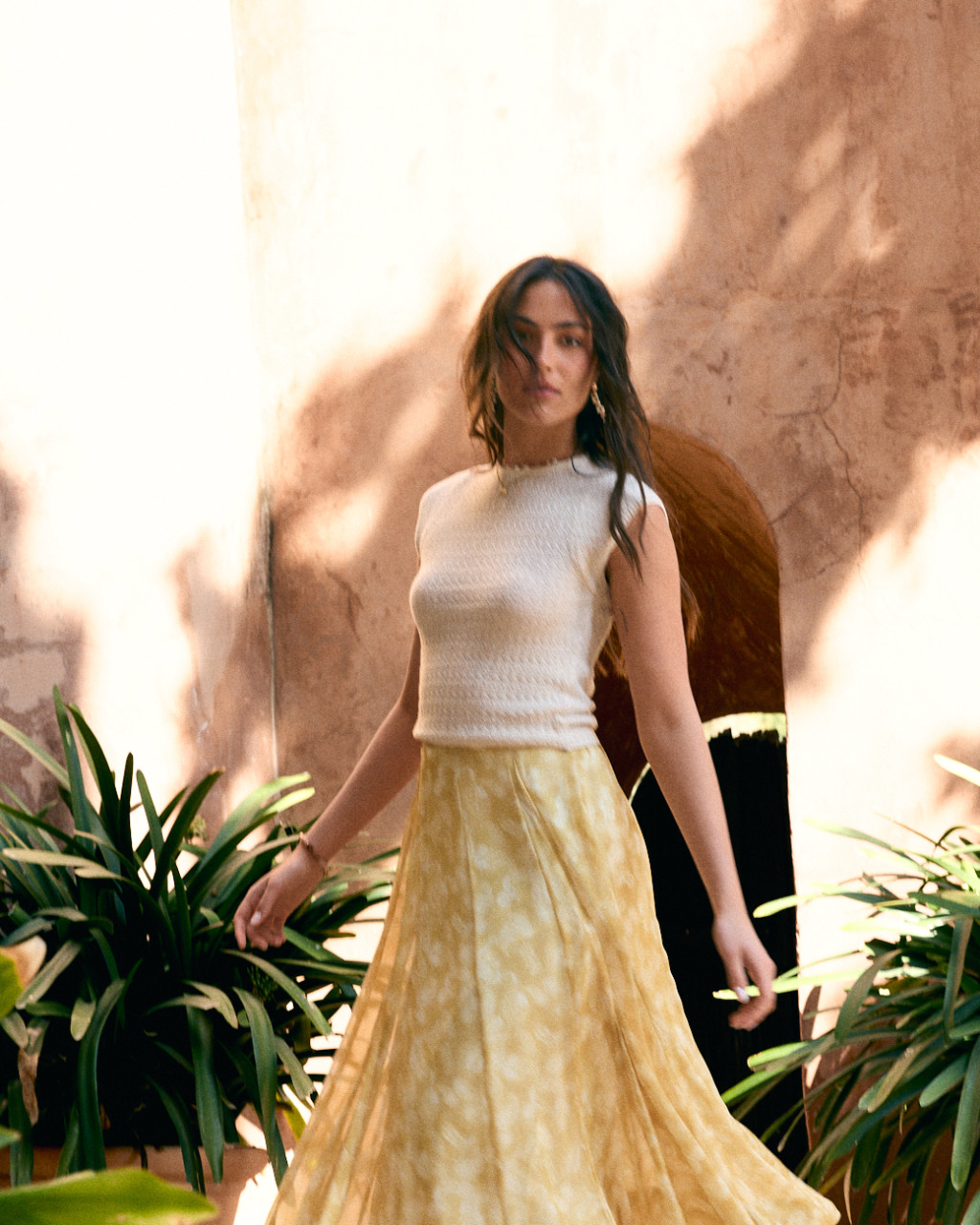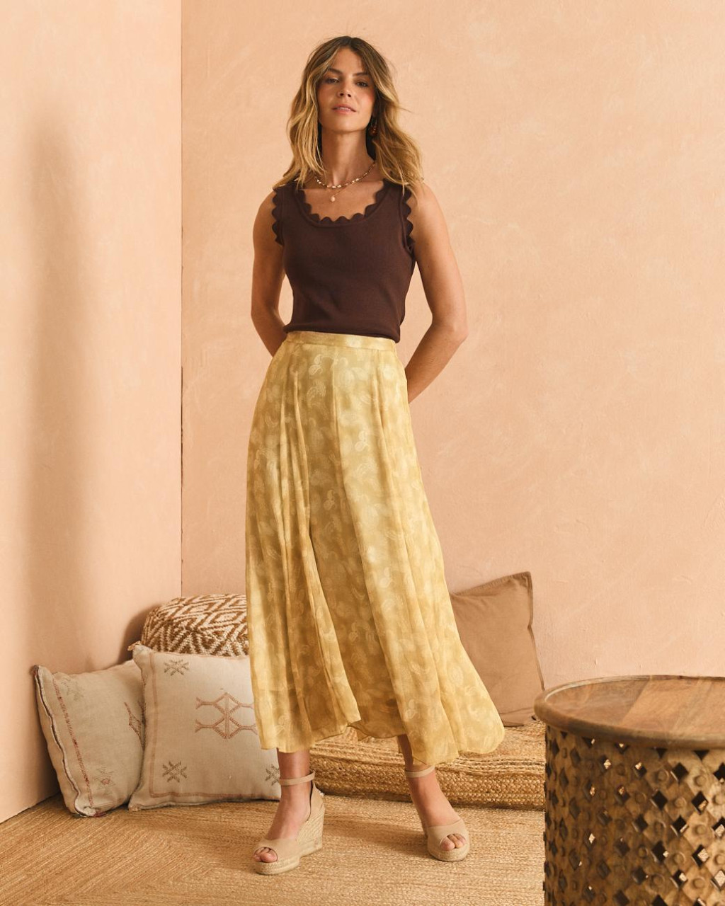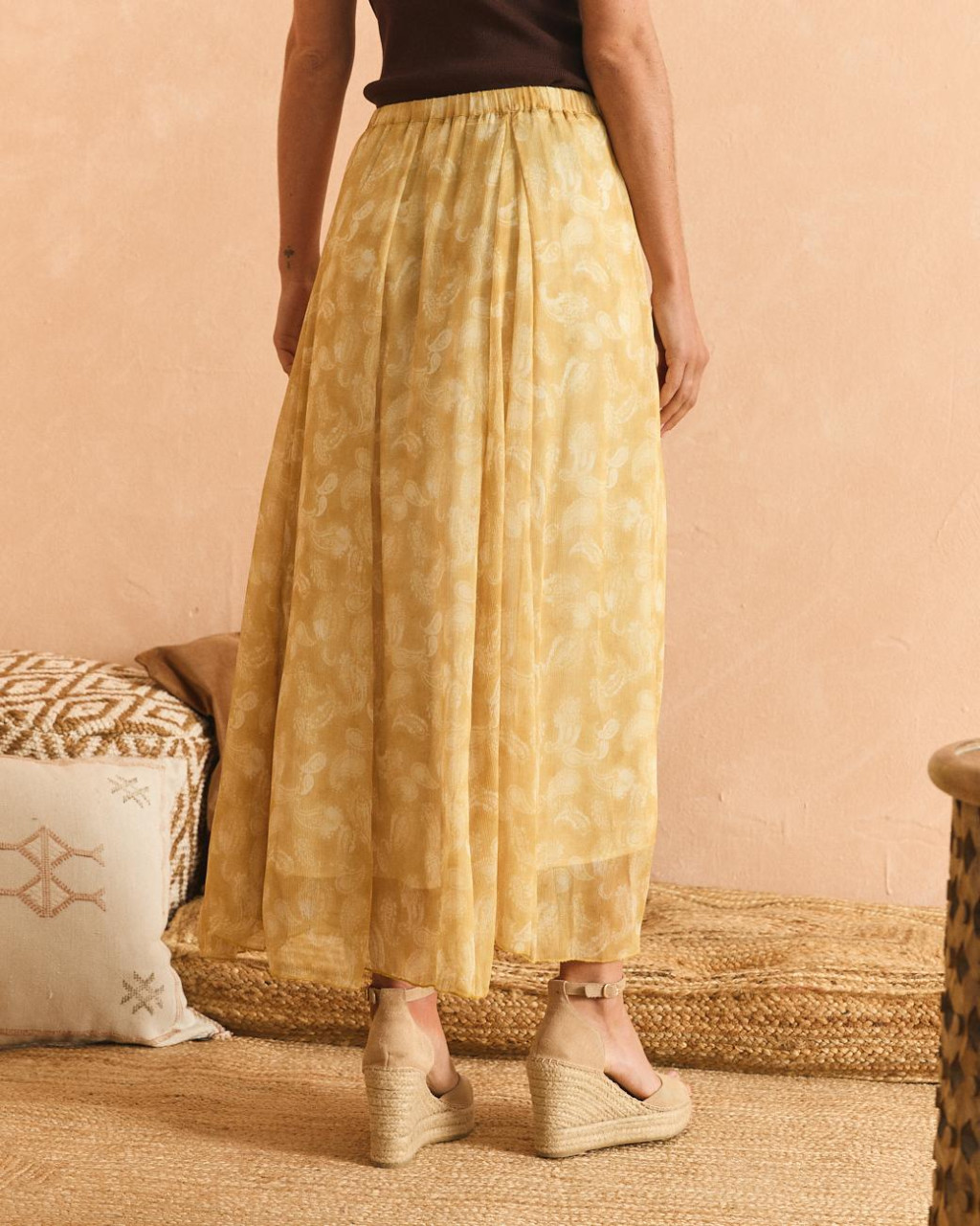 Saia de comprimento midi vaporosa com padrão de cornucópias em fundo amarelo.